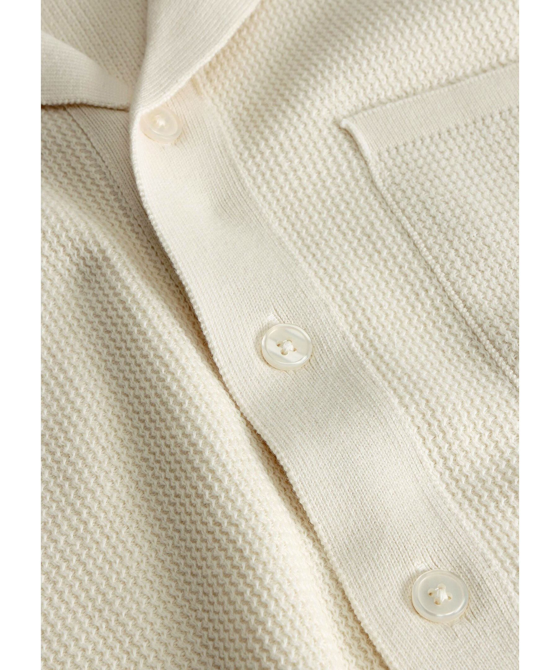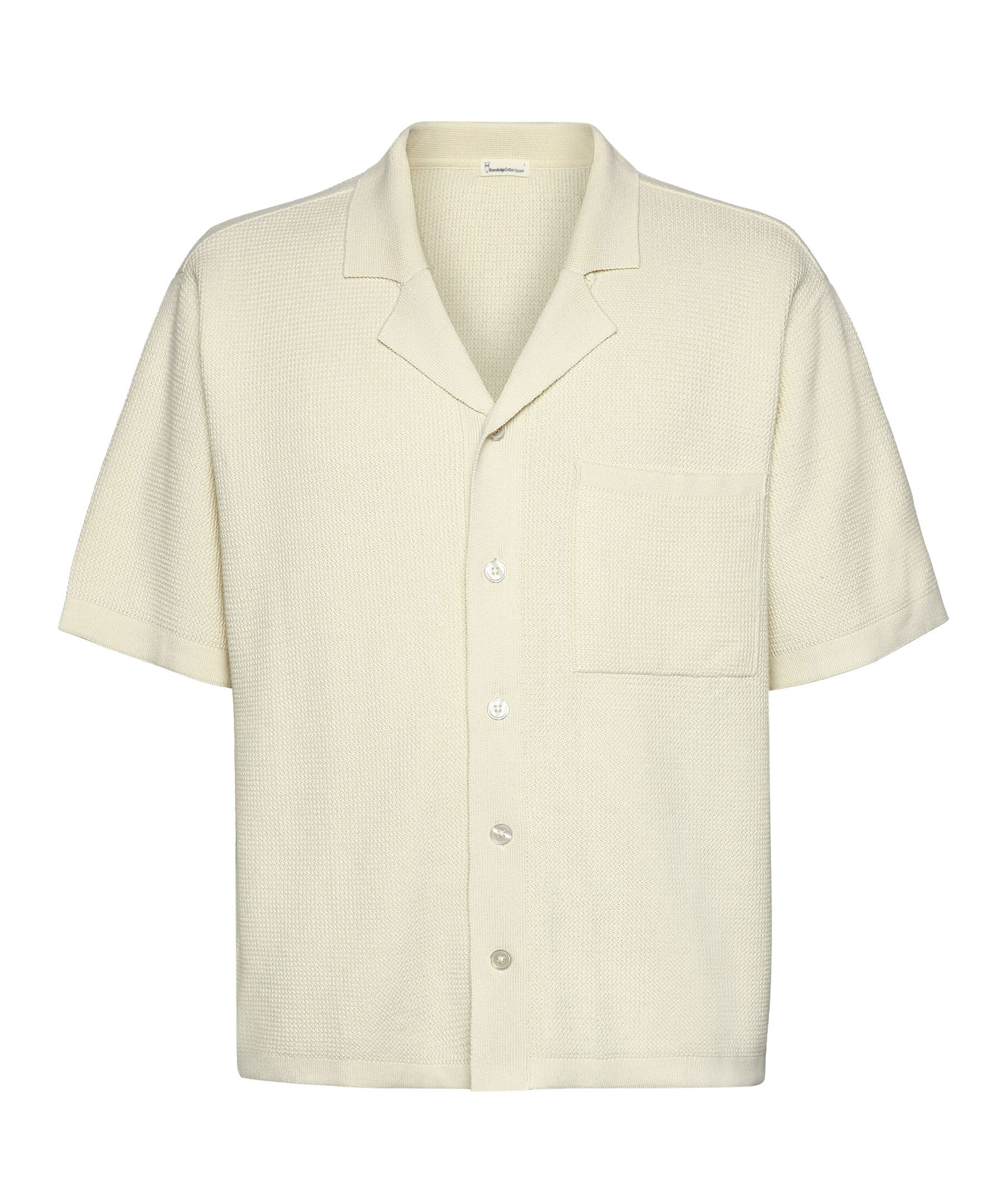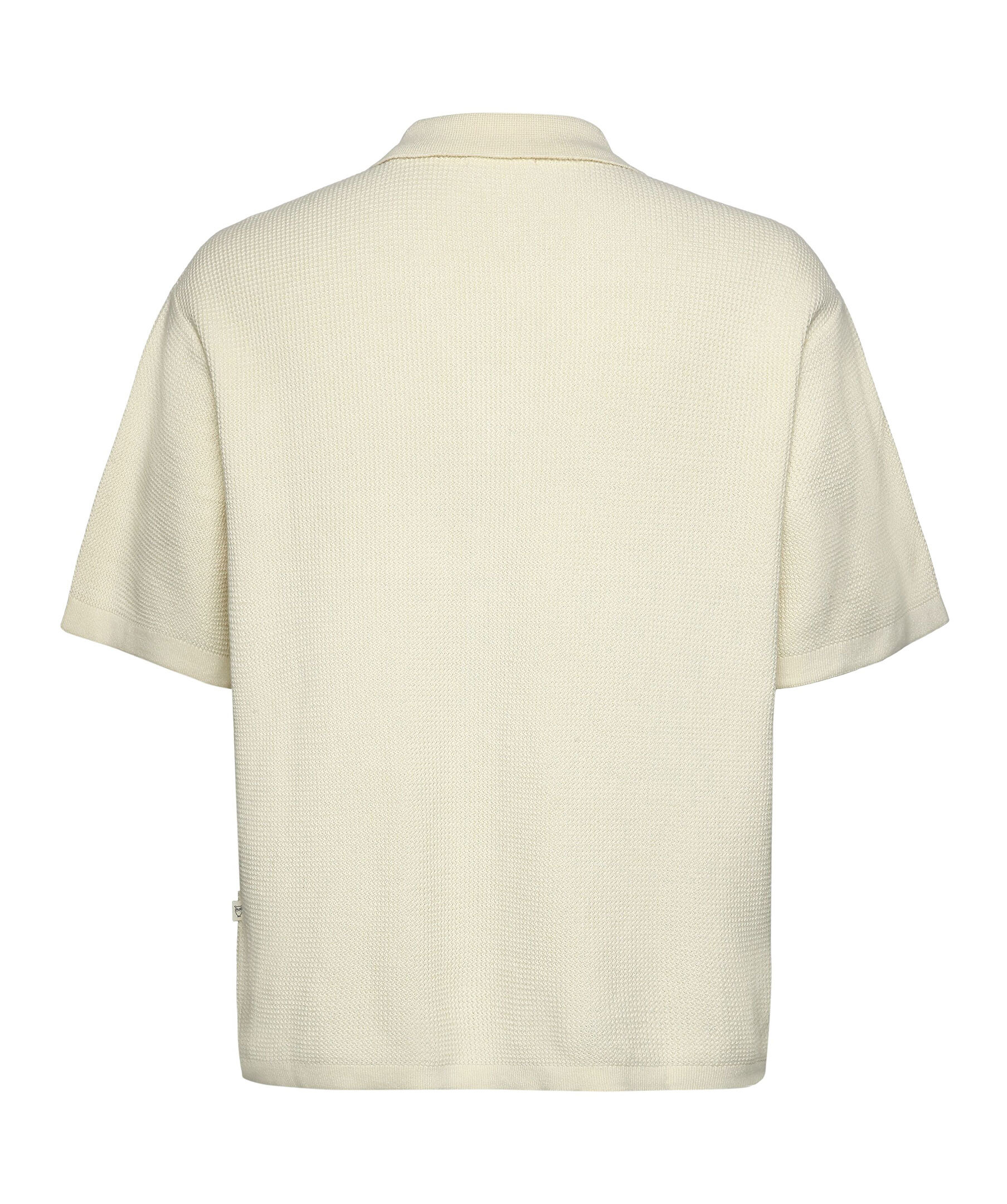 Krämvit, kortärmad och strukturstickad skjorta från Knowledge Cotton. Skjortan stängs med knappar och har en avslappnad krage, korta boxiga ärmar samt en bröstficka. Tillverkad i organisk bomull.