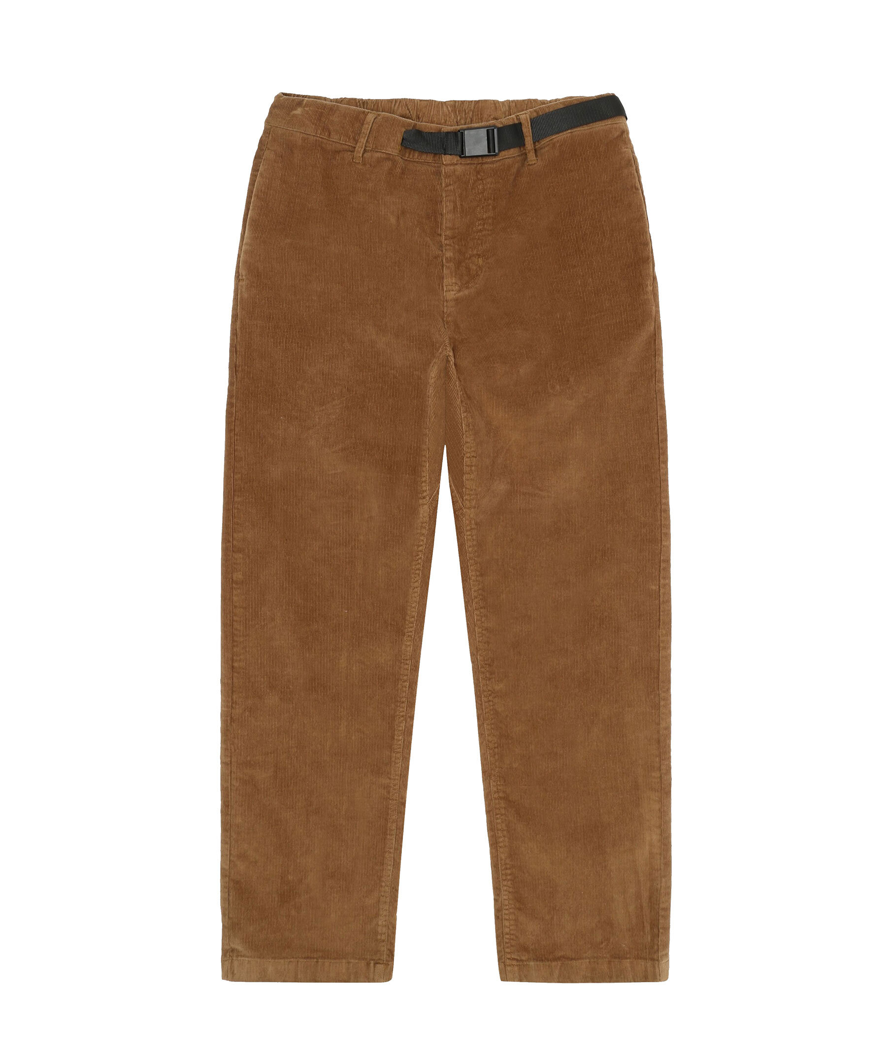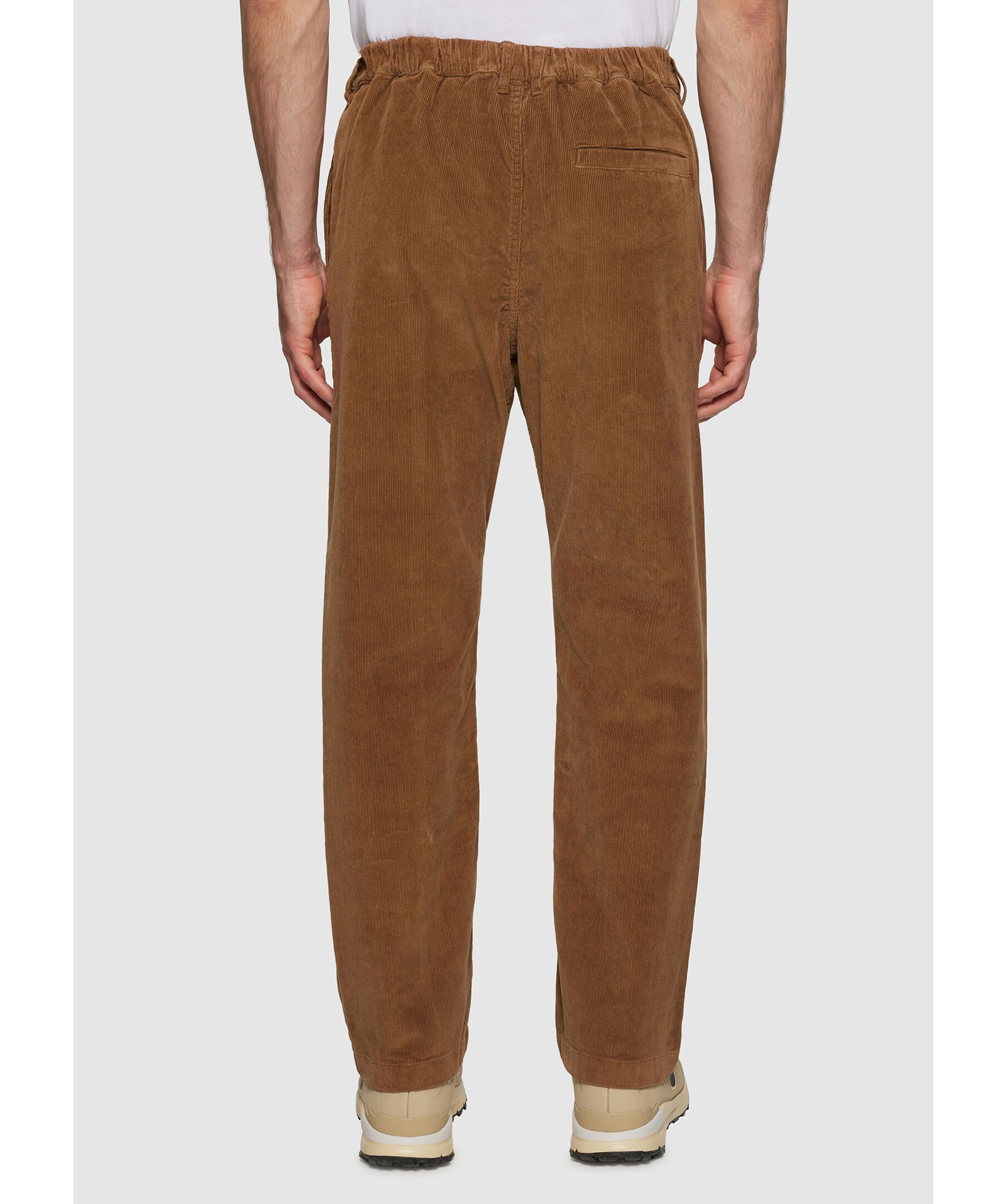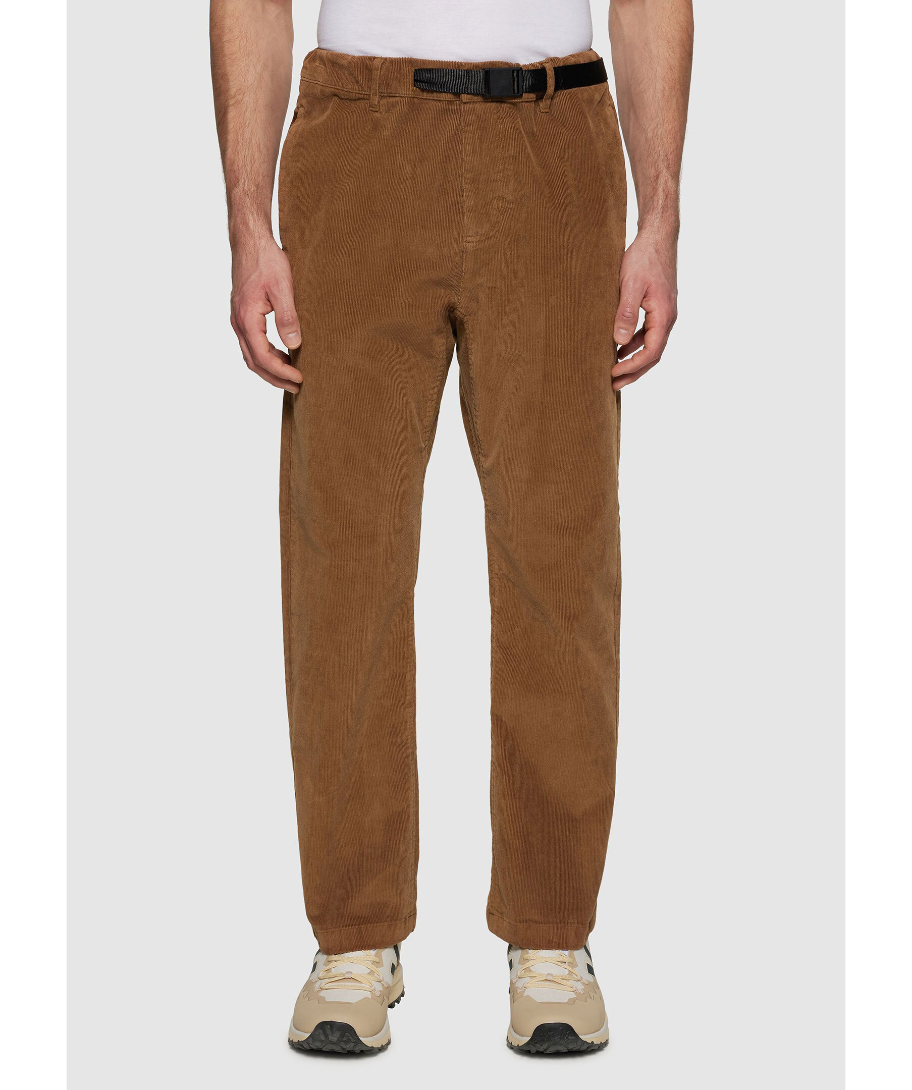 Bruna byxor i manchester från Knowledge Cotton. Byxorna har elastiskt midjeband, justerbart bälte, snedställda framfickor och en subtil bakficka. Tillverkade i en bomullsblandning.
