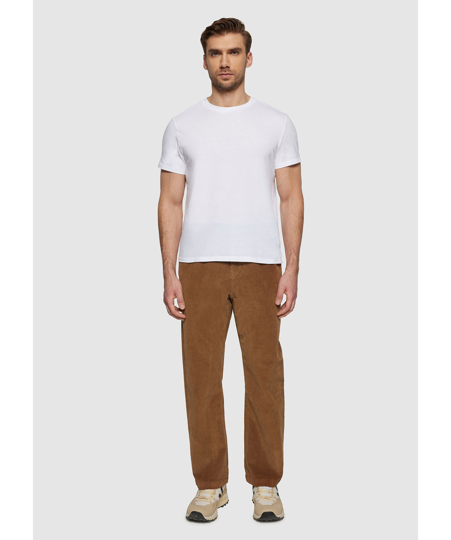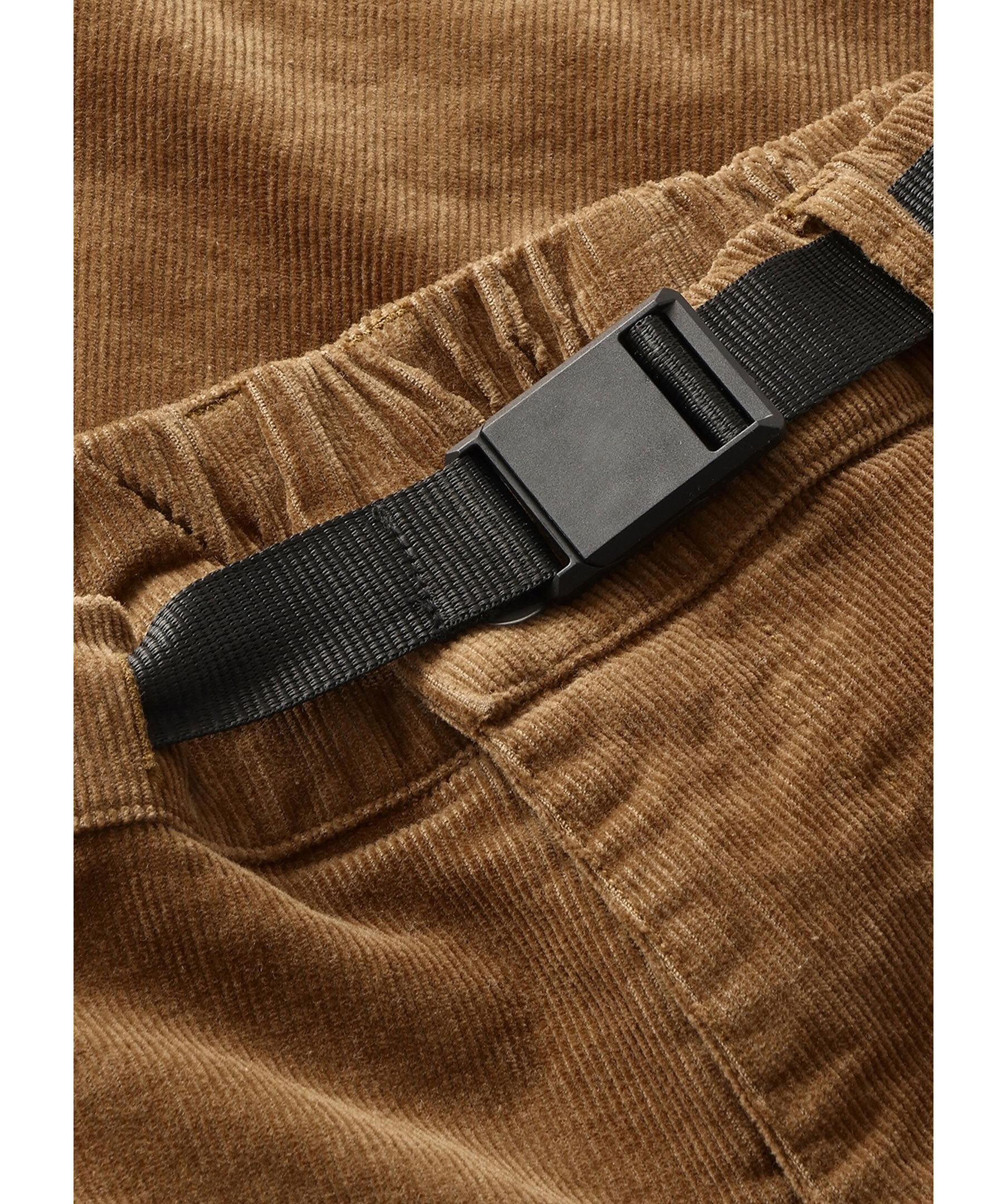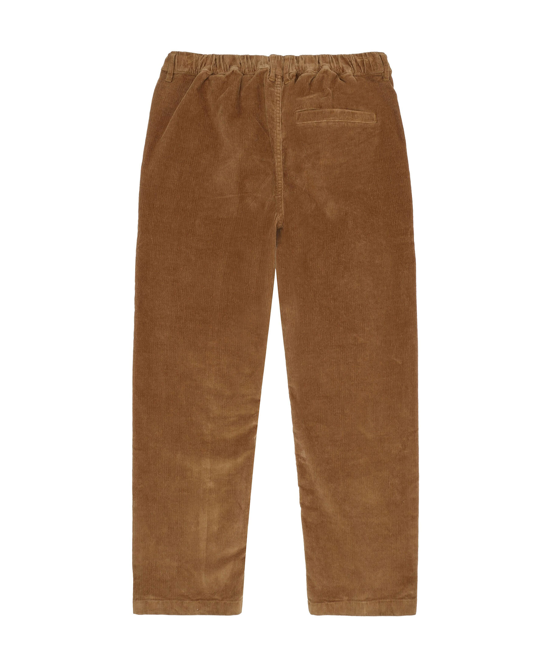 Bruna byxor i manchester från Knowledge Cotton. Byxorna har elastiskt midjeband, justerbart bälte, snedställda framfickor och en subtil bakficka. Tillverkade i en bomullsblandning.