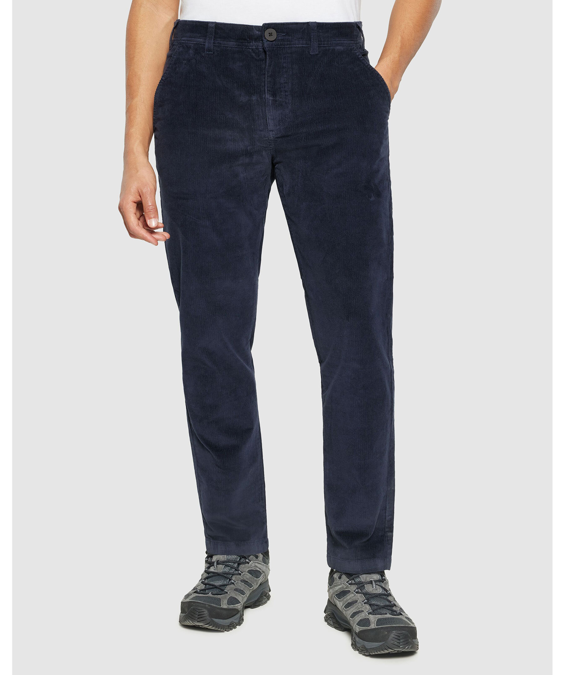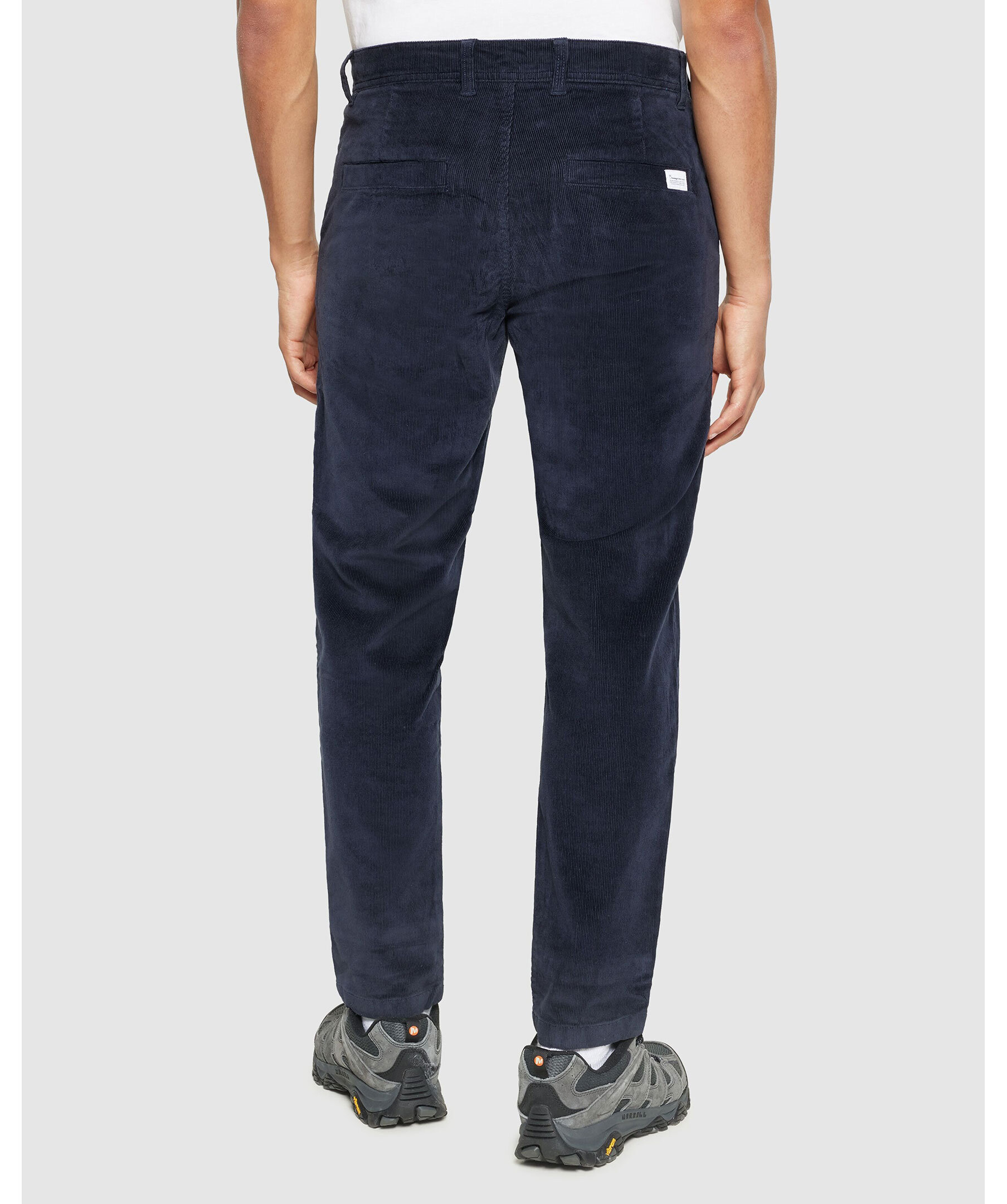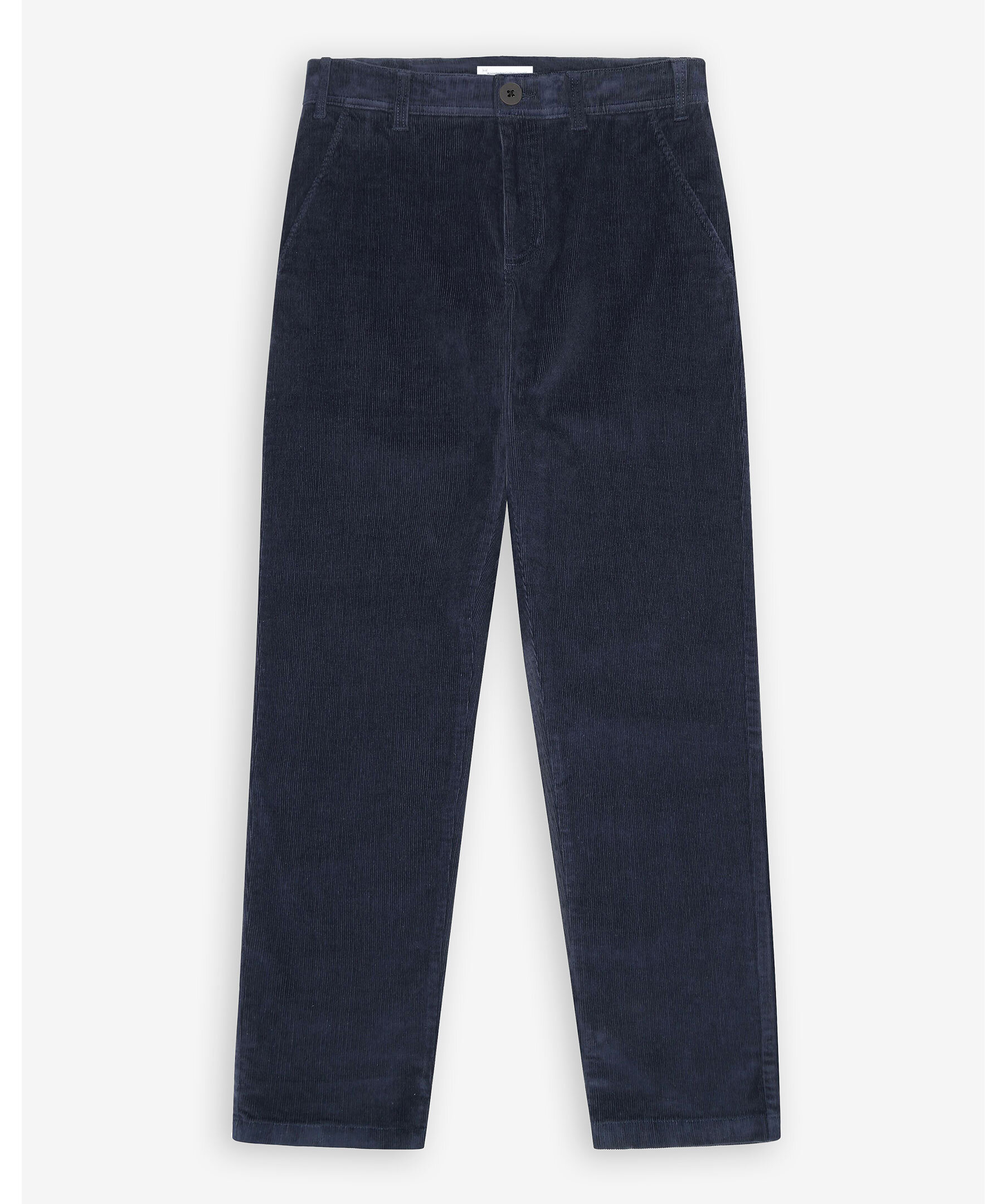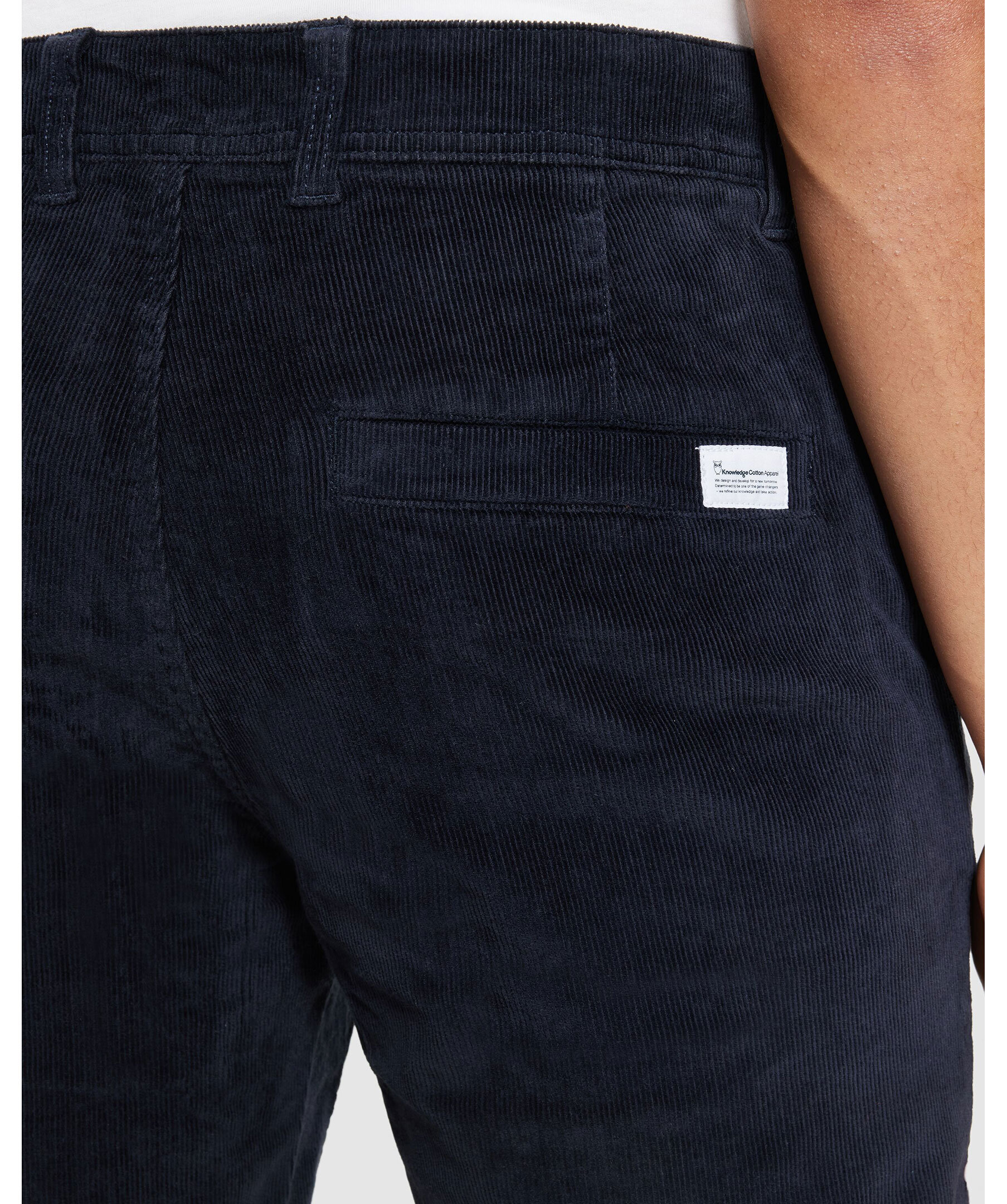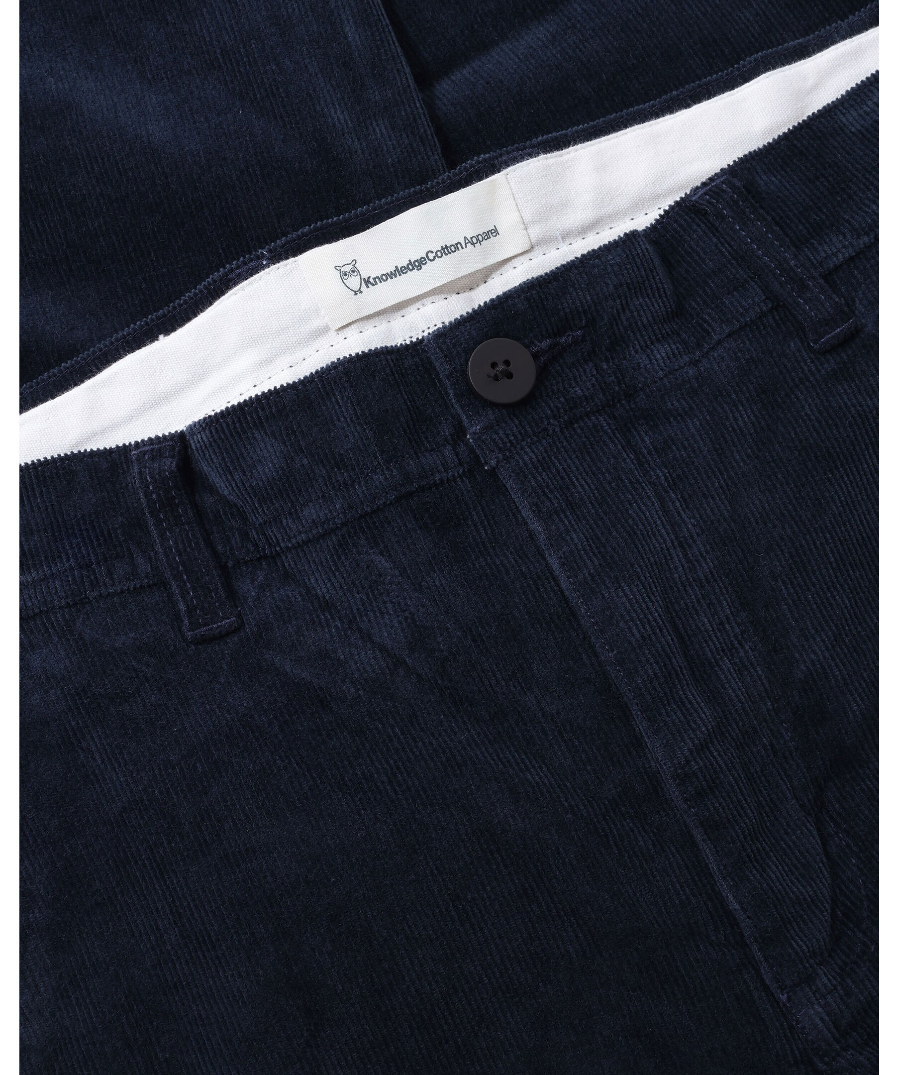 Marinblå manchesterbyxor från Knowledge Cotton i en rak passform. Byxorna är tillverkade i ekologisk, lätt bomull med en liten mängd stretch för bra rörlighet och en avslappnad look. De har bälteshällor, knappstängning, snedställda framfickor och diskreta bakfickor. Perfekta för både vardag och avslappnade tillfällen.