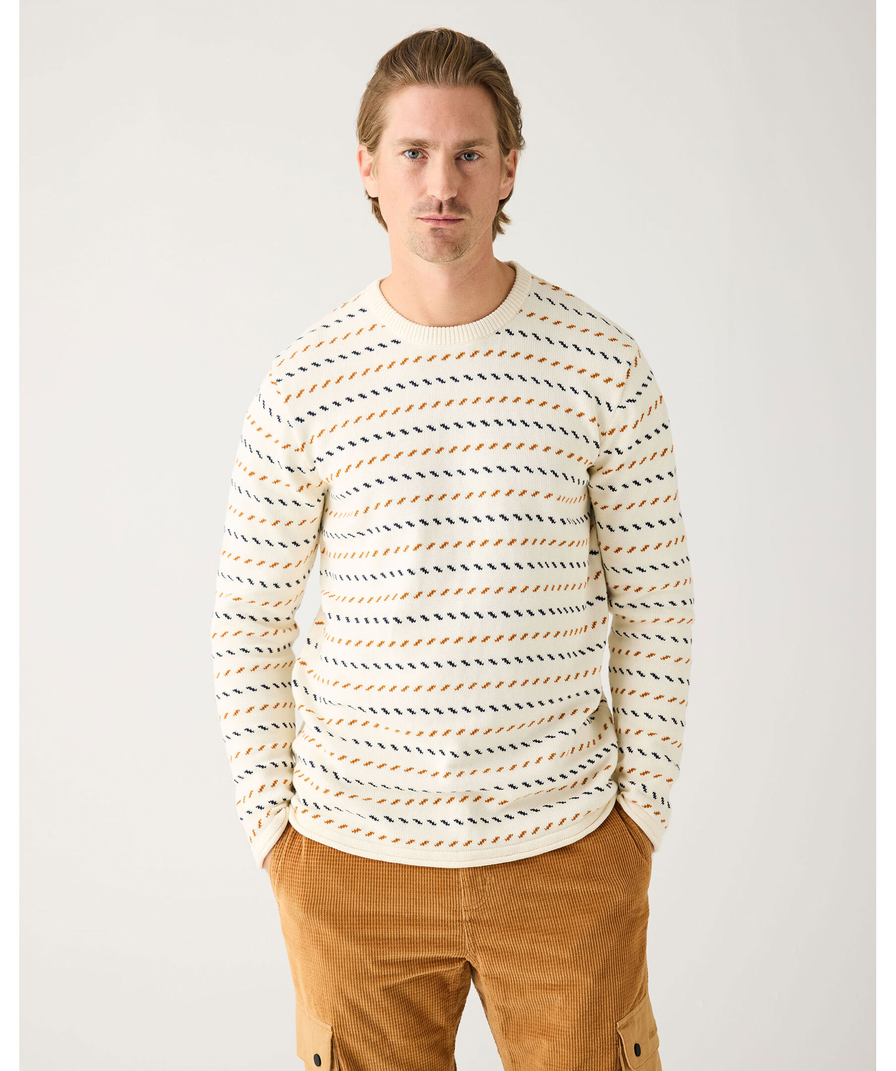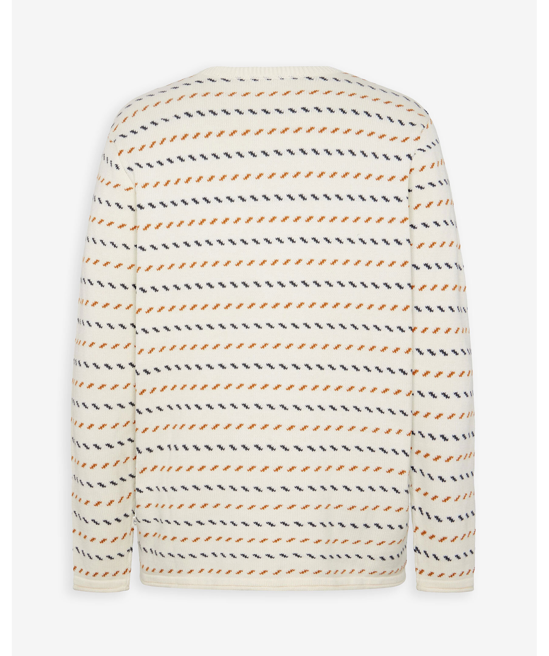 Krämvit stickad tröja med randigt mönster från Knowledge Cotton. Rundad halsring och ribbstickade muddar.