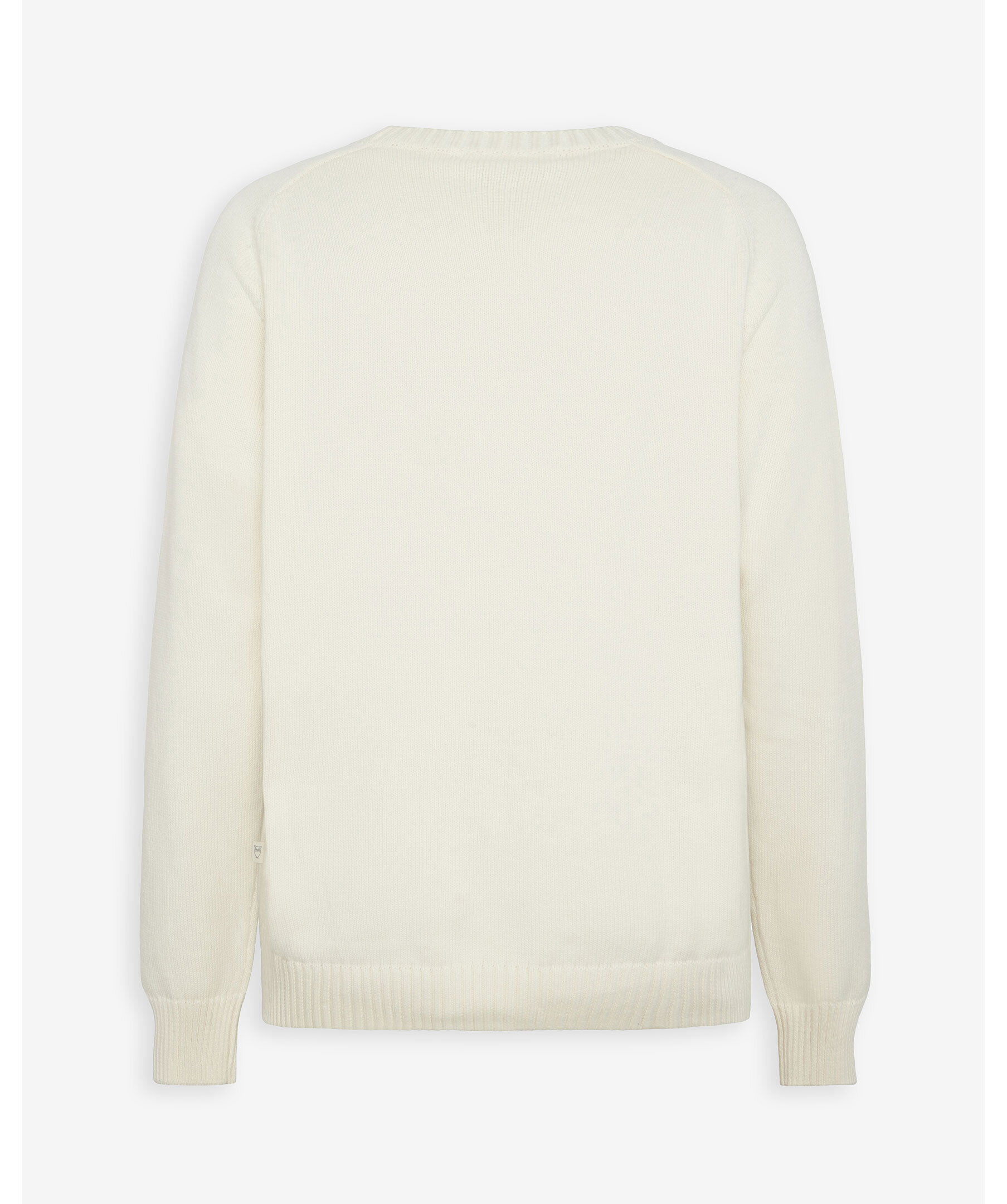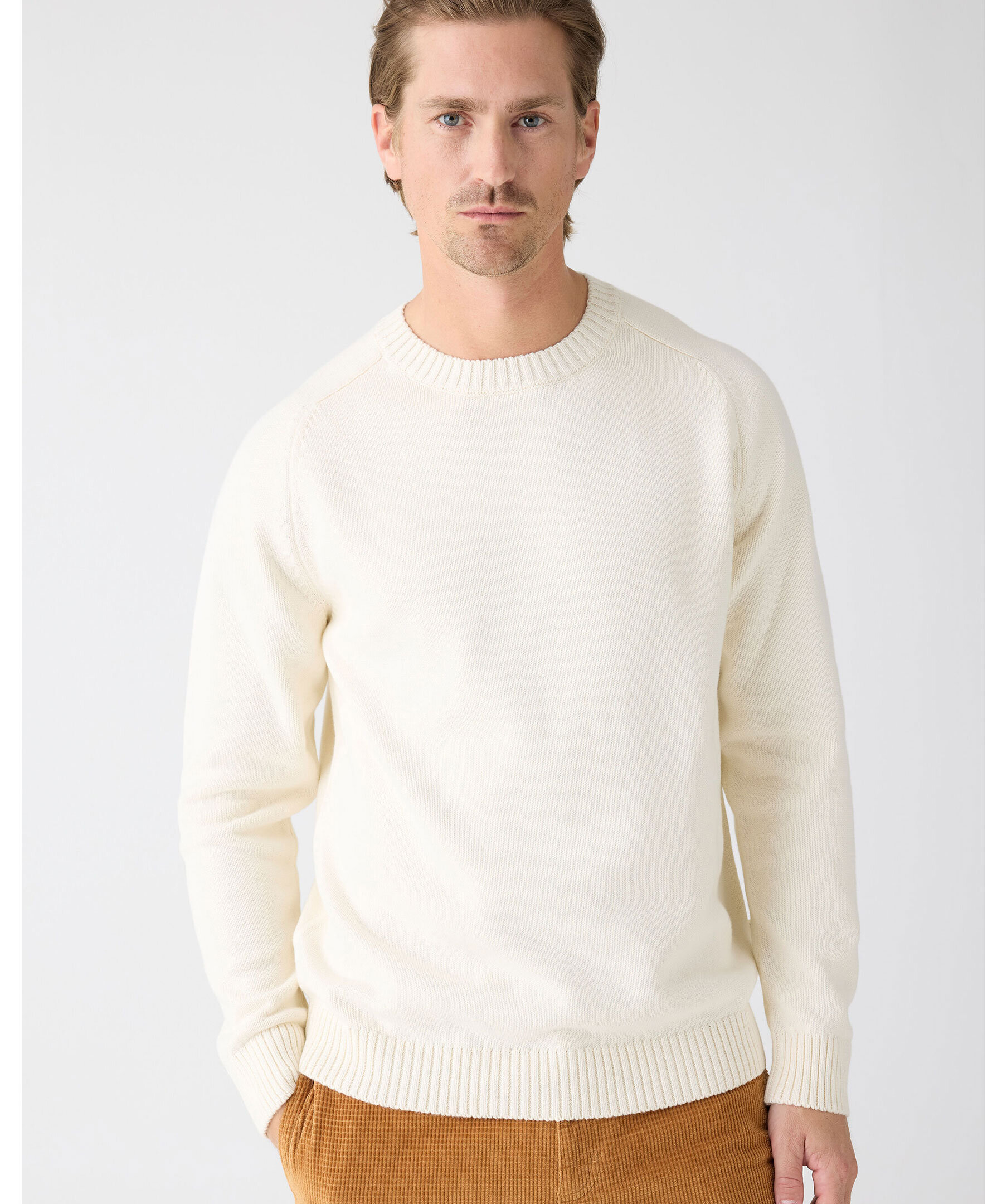 Krämvit stickad tröja från Knowledge Cotton. Gjord i 100% ekologiskt bomull och har en klassisk crew neck. Ribbstickade muddar vi hals, ärm- och plaggslut.