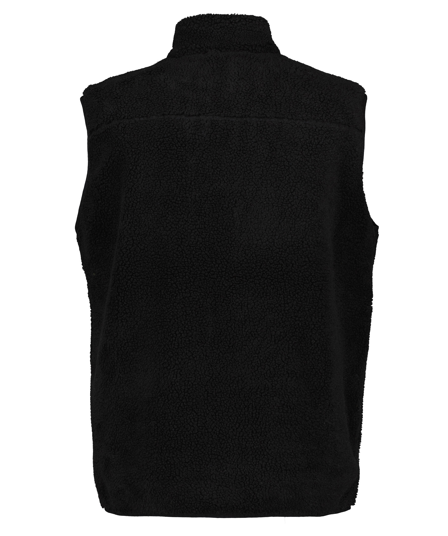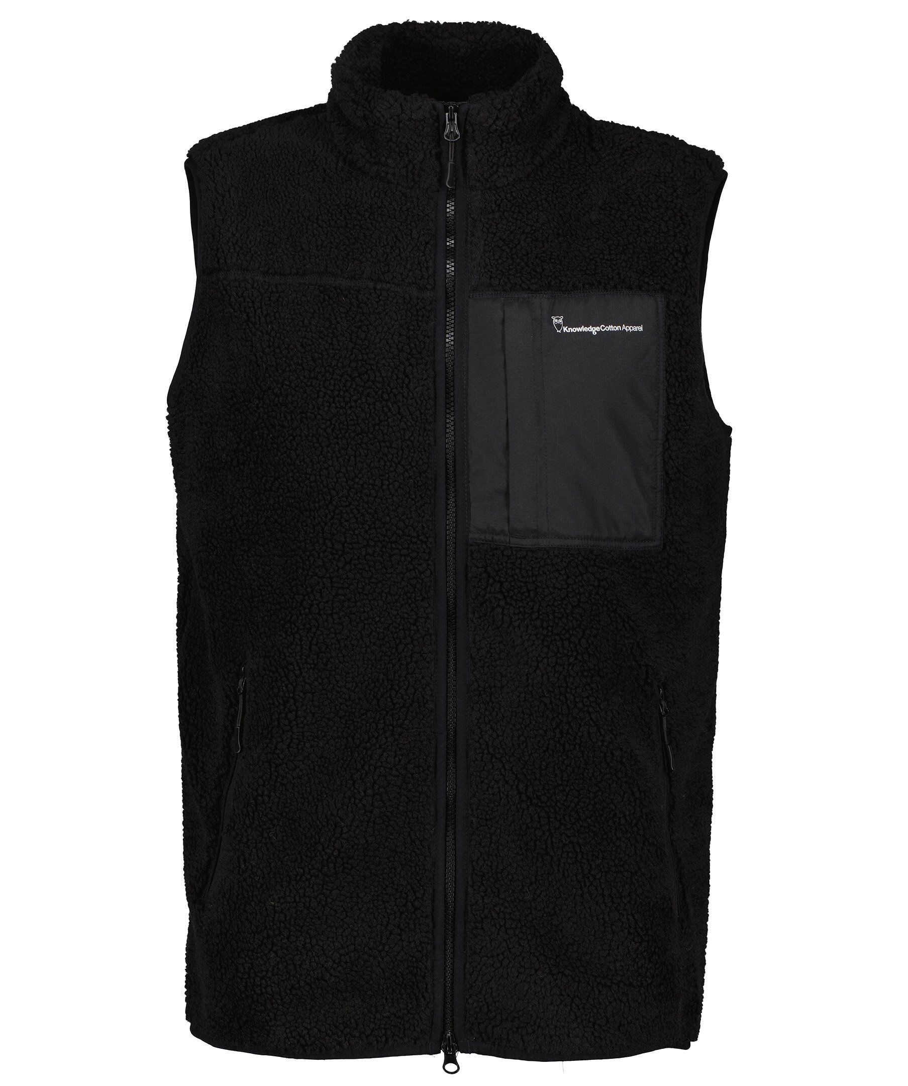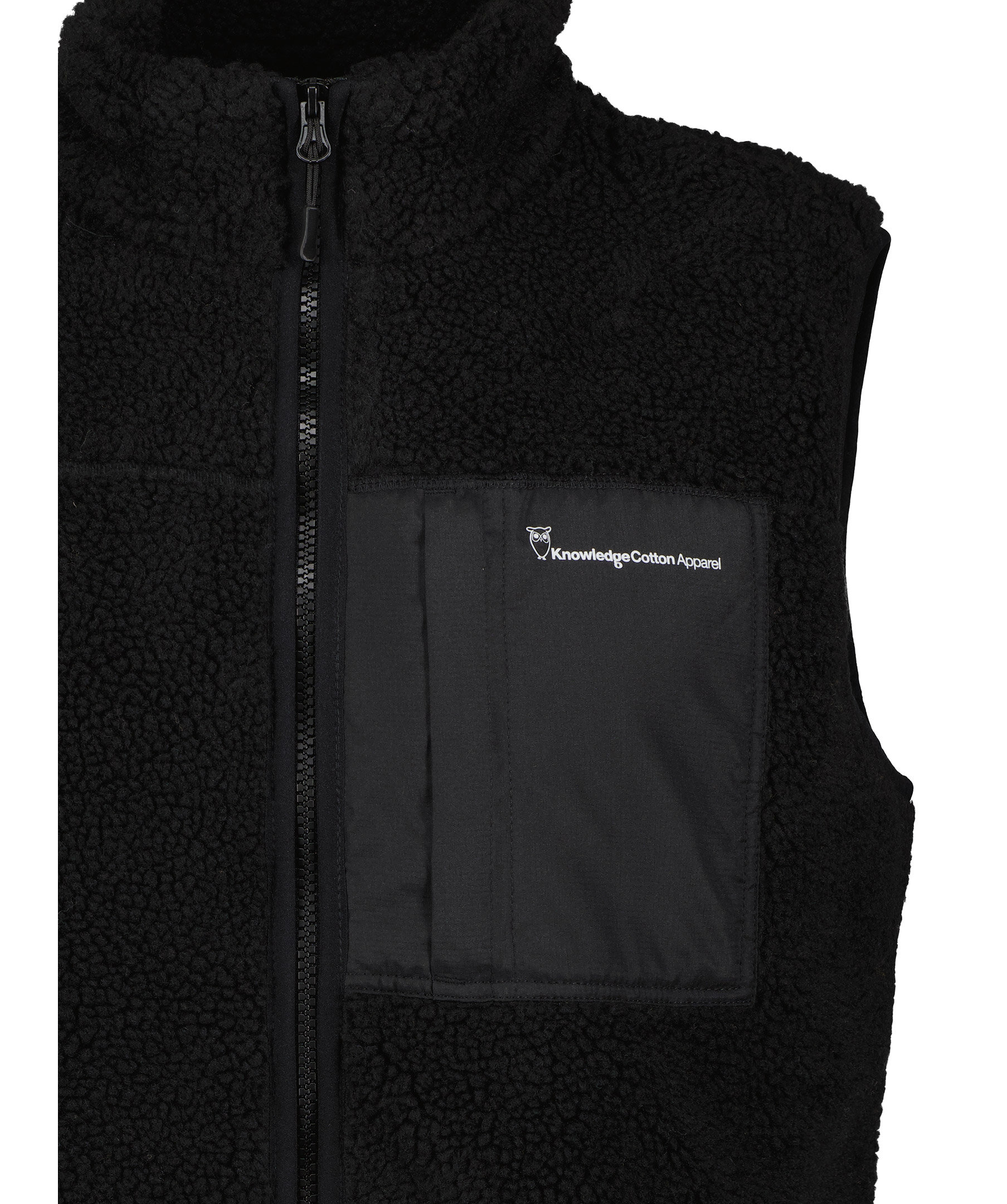 Svart fleeceväst från KnowledgeCotton Apparel. Västen har en stor svart bröstficka med en vit logotyp och två framfickor med dragkedja. Västen har en hög krage och stängs med en tvåvägsdragkedja. Svart meshfoder på insidan. Tunna svarta elastiska muddar vid ärm och plaggslut.
