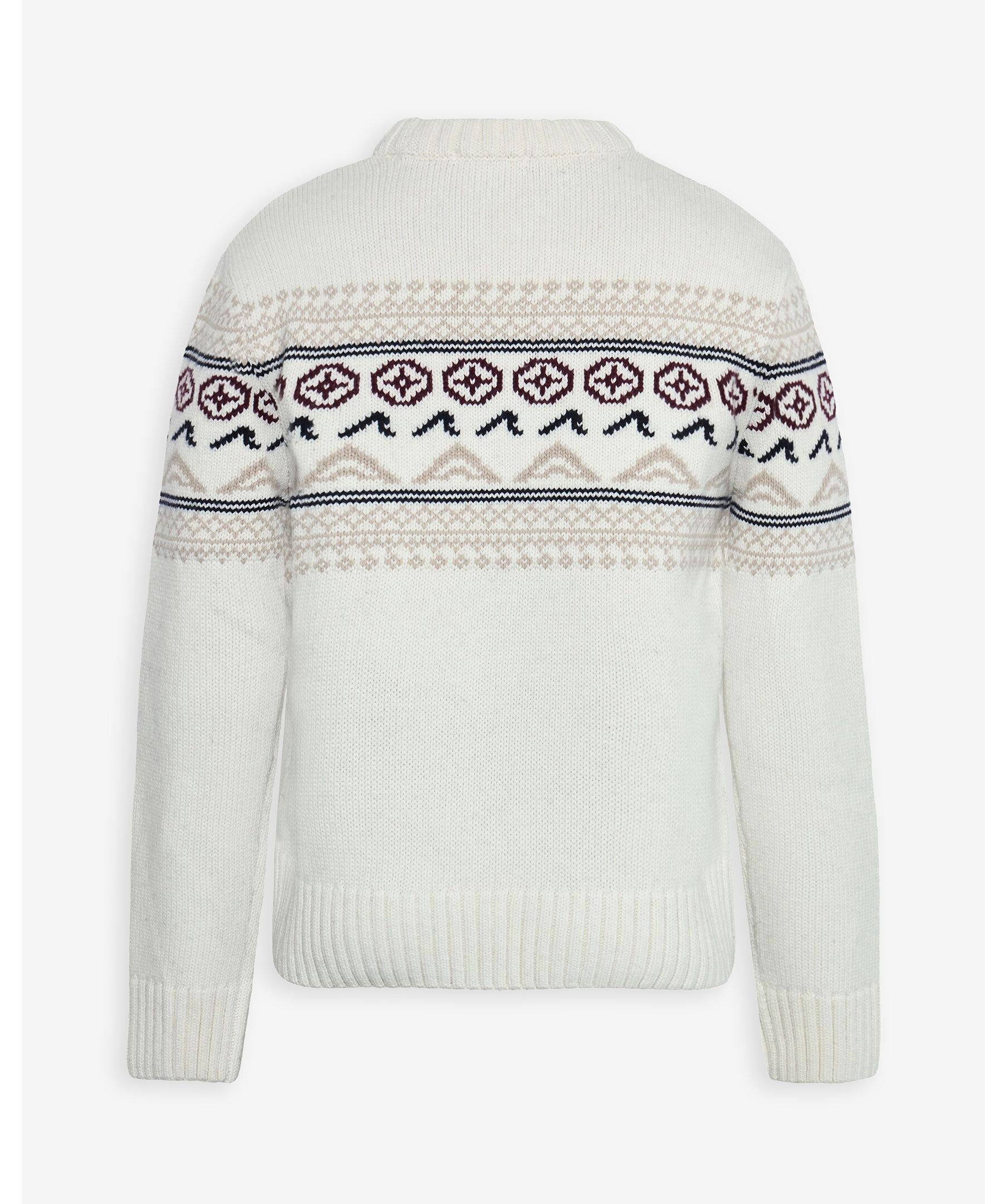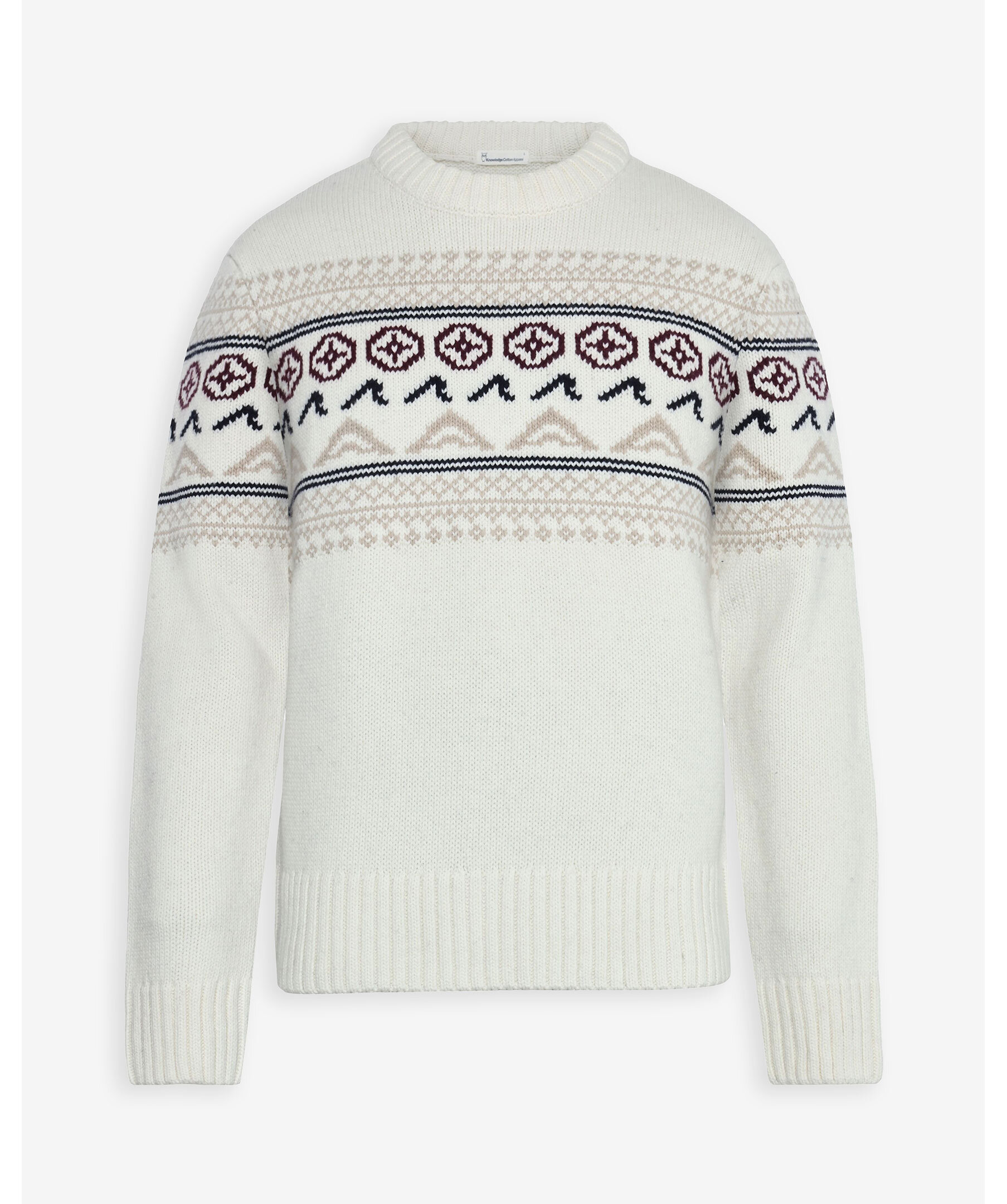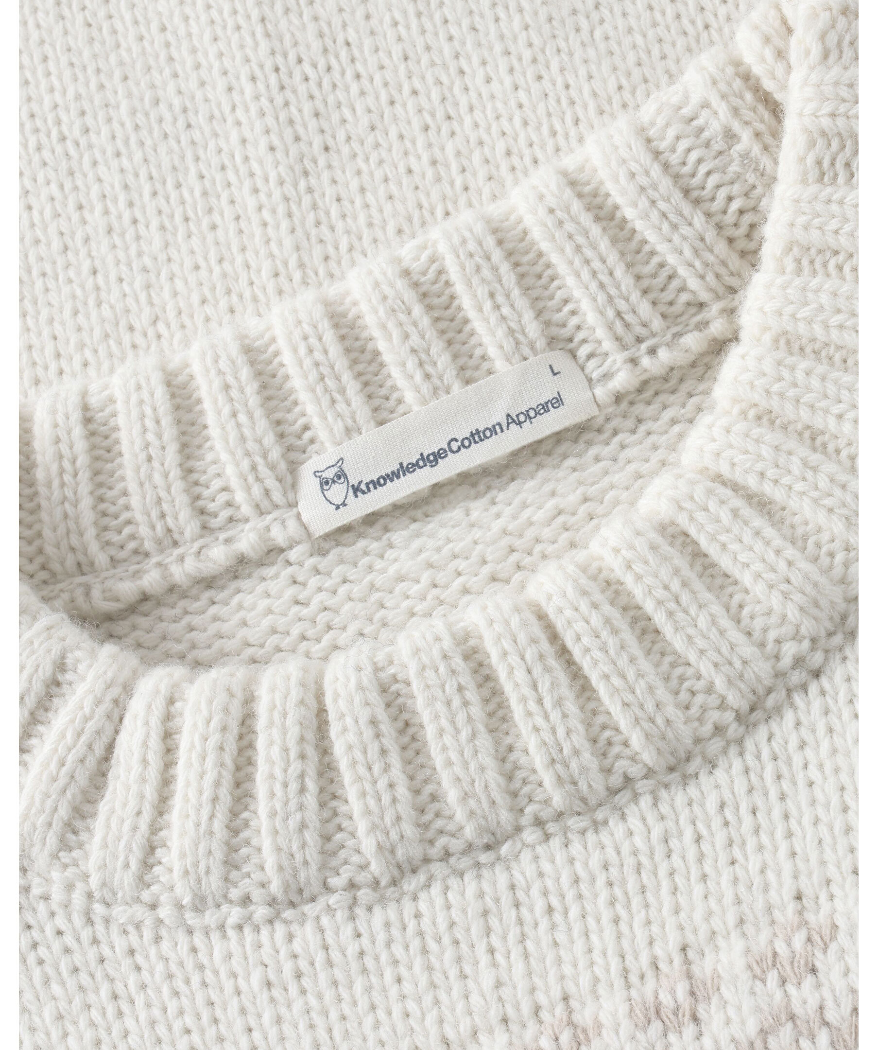 Stickad tröja från Knowledge Cotton. Tröjan är gjord i ett värmande lammullsgarn och har ett klassiskt Fair Isle-mönster för en tidlös vinterstil. Den har en regular fit som ger både komfort och mångsidighet, och ribbstickade fållar samt manschetter för en snug finish. Mönstret över bröstet och axlarna ger ett visuellt lyft, vilket gör tröjan till ett perfekt val för både avslappnade och mer uppklädda vinteroutfits.