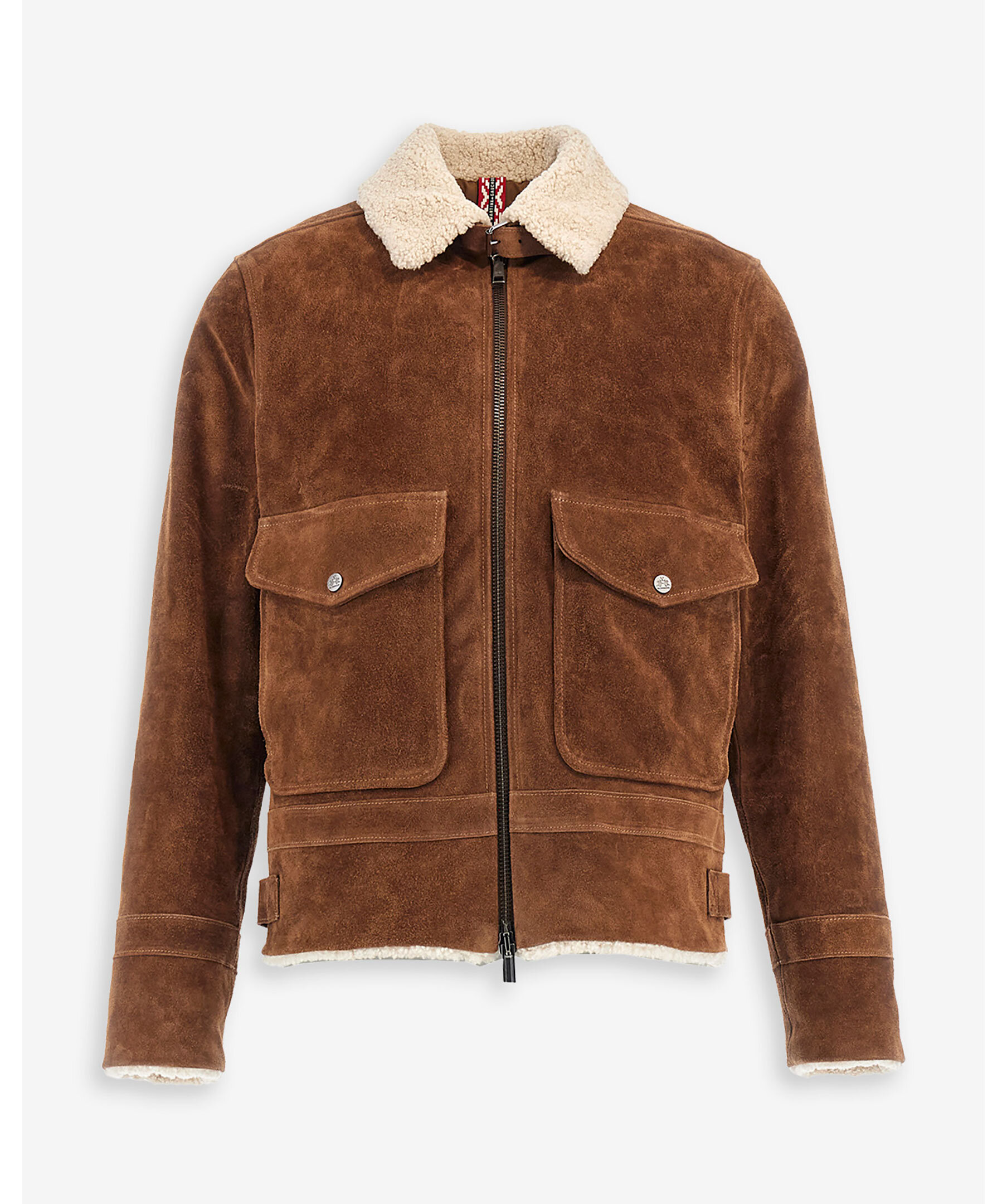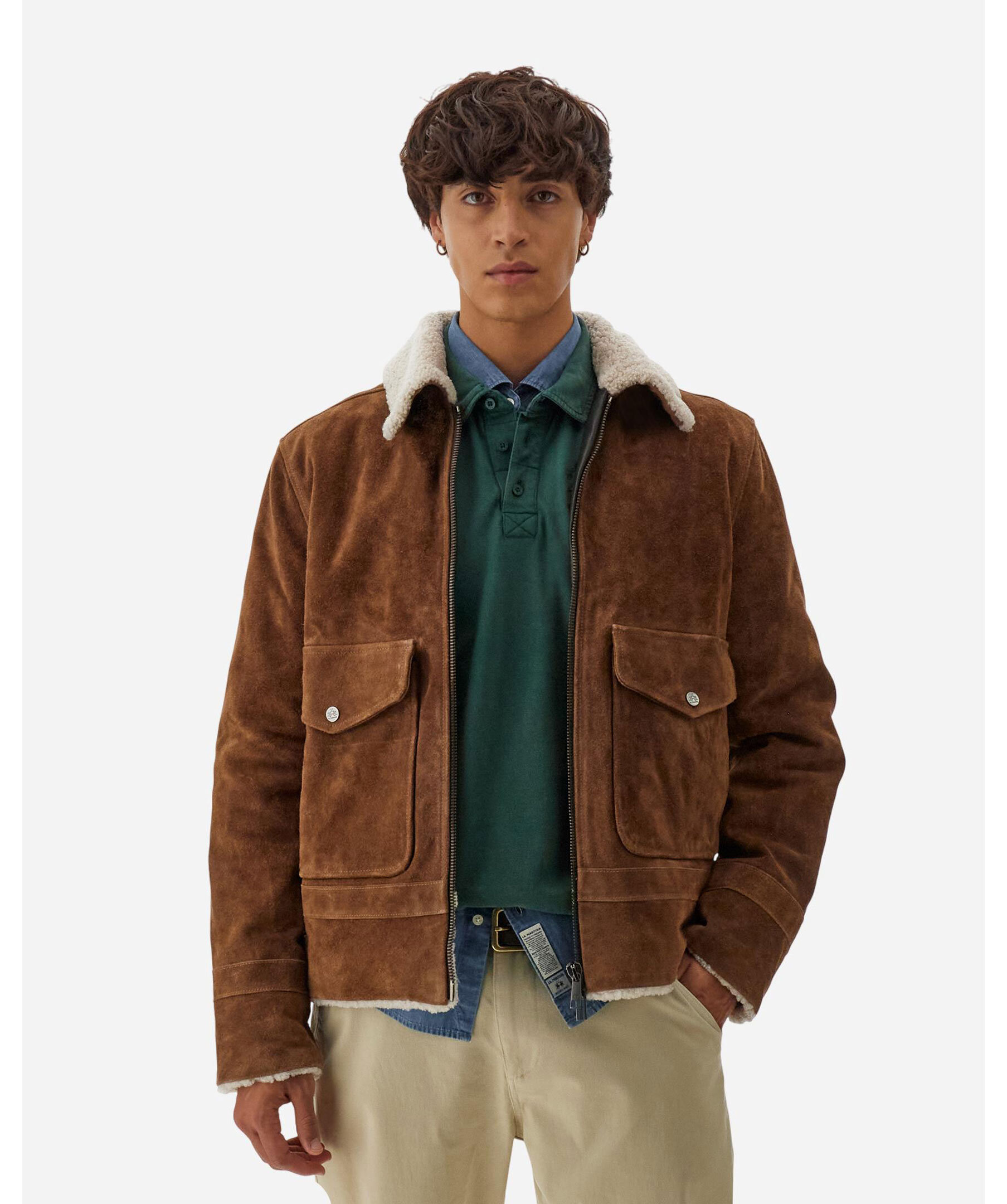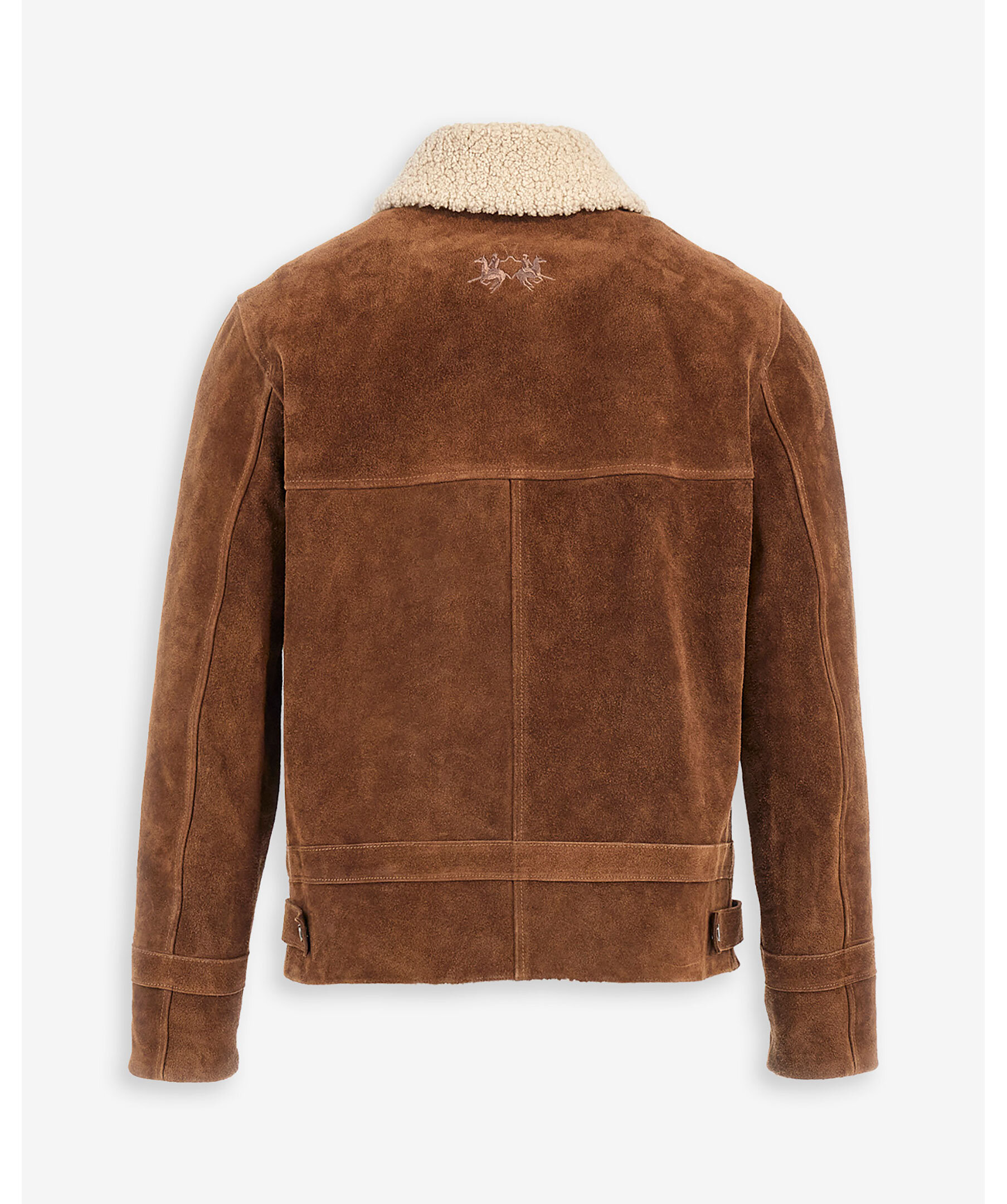 Jacka från La Martina i lyxigt mockaskinn. Mjuka shearling-detaljer vid krage, ärmslut och nedre kant. Den har dragkedja framtill, två stora fickor med lock och tryckknapp, samt ett spänne vid kragen för extra stil och funktion. På ryggen syns La Martinas ton-i-ton broderade logga, och passformen är rak och klassisk.