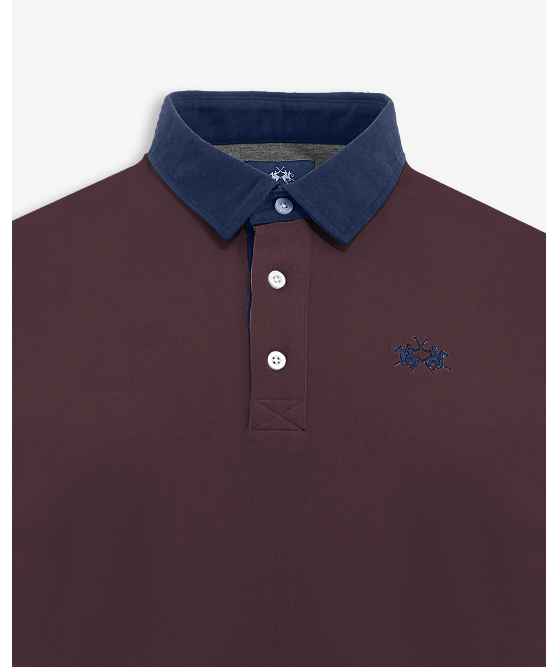 Vinröd långärmad pikétröja från La Martina gjord i 100% bomull. Kontrastkrage i och treknappslåsning med flerfärgat randigt band. Ikonisk La Martina-tekst tryckt i kontrast under kragen. Litet broderat logomärke på bröstet i avvikande färg. Regular fit.