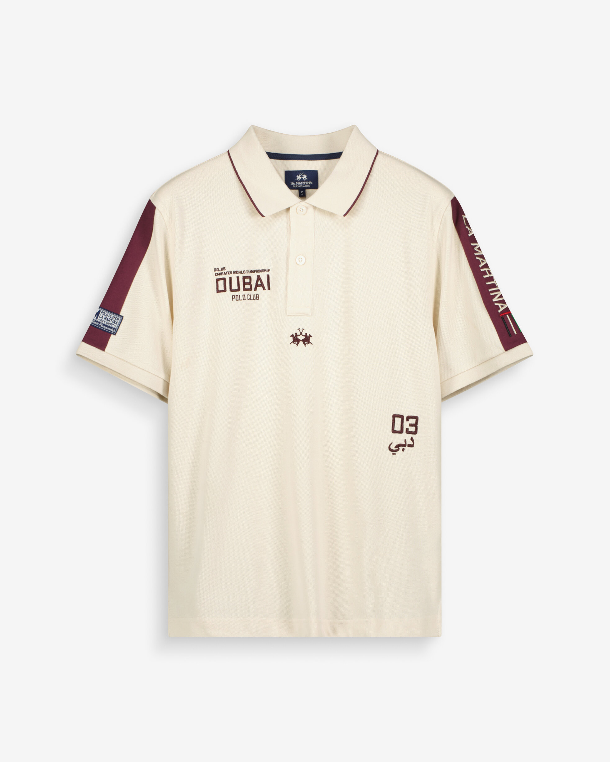 Kortärmad pikétröja från La Martina. Pikén har tvåknappsknäppning, krage och ärmslut i ribb med diskret kontrasterande kant vid halsen. Den lösa, raka passformen skapar en avslappnad silhuett, medan broderade detaljer och applikationer inspirerade av Dubai tillsammans med märkesdetaljer på ärmarna ger ett uttrycksfullt och karaktärsfullt helhetsintryck.