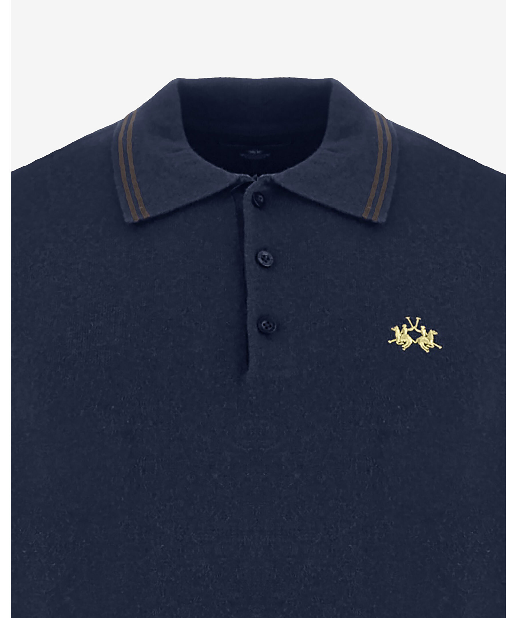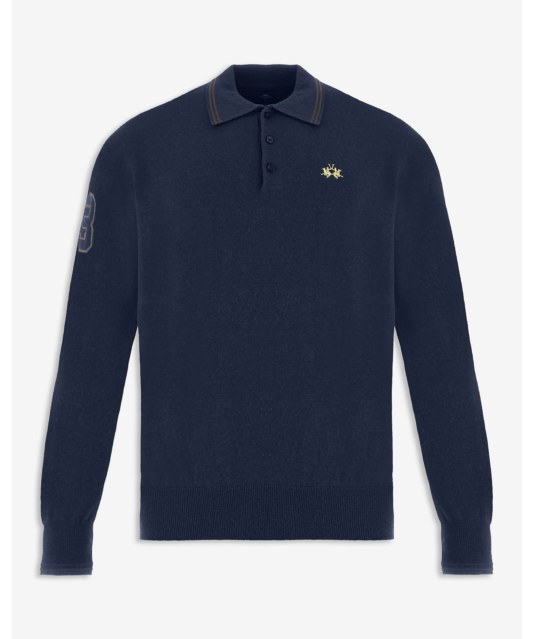 Långärmad pikétröja från La Martina. Gjord i en mjuk och varm garnblandning av 50 % bomull och 50 % ull – perfekt balans mellan komfort och isolering. Den har en klassisk ribbstickad krage och ärmslut med en diskret kontrastrand, samt tre personligt utformade knappar i knappslån.På bröstet sitter en liten, broderad logotyp i avvikande färg, och höger ärm pryds av en cordbroderad patch med siffra, vilket ger tröjan ett unikt sportigt uttryck.