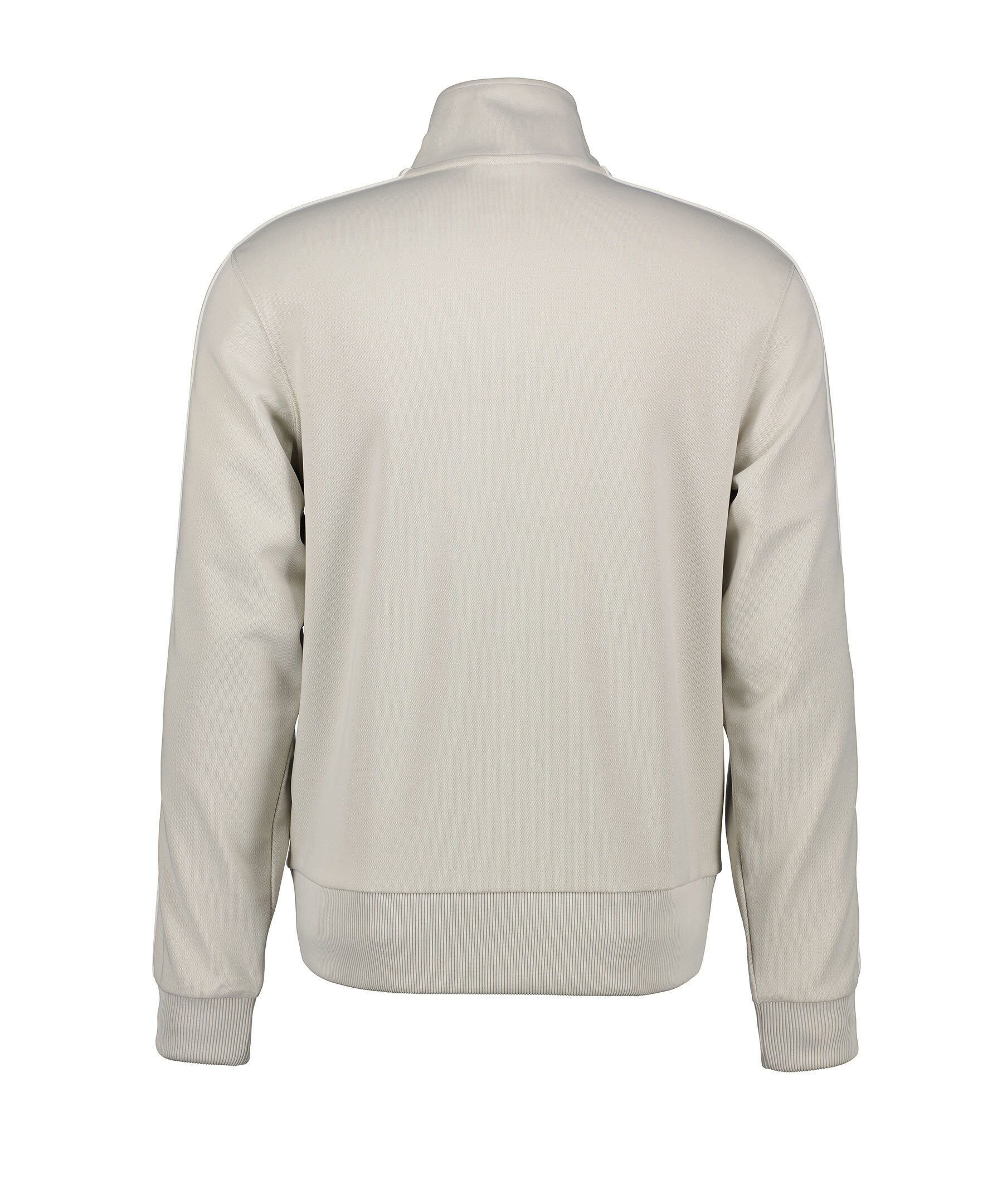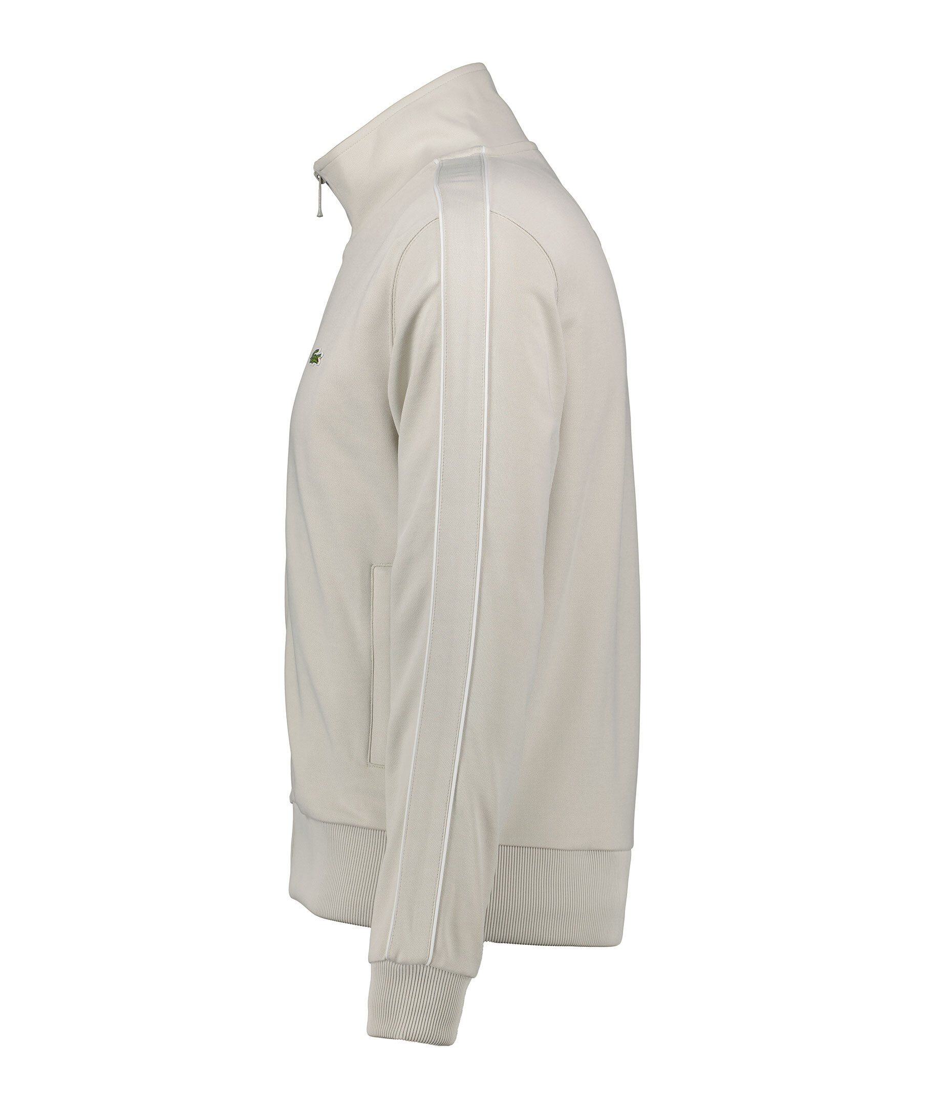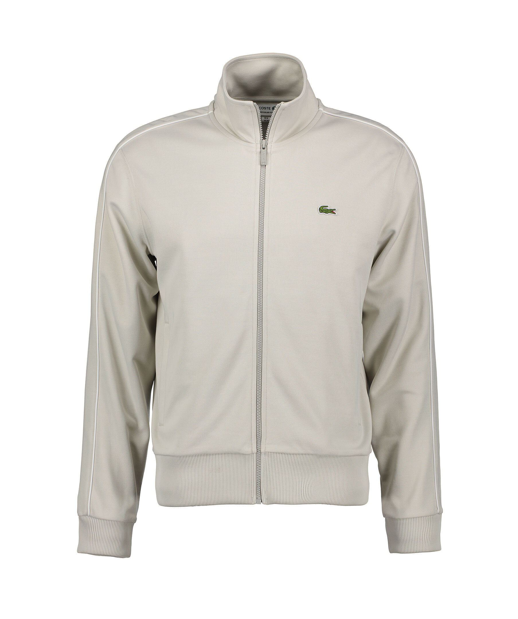 Ljusgrå tracksuit jacka från Lacoste. Stängs framtill med dragkedja. Revärer med vita detaljer längst ärmarna. Ribbstickade muddar vid ärm- och plaggslut. Broderad patch med logotyp på vänster bröst. Tillverkad i en polyesterblandning.