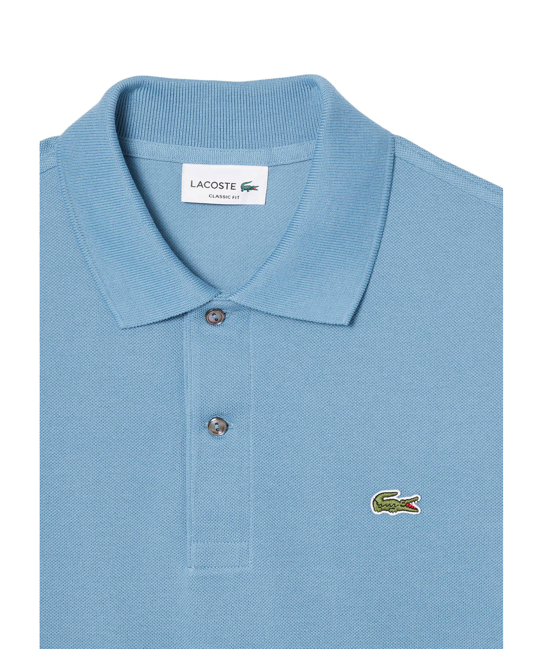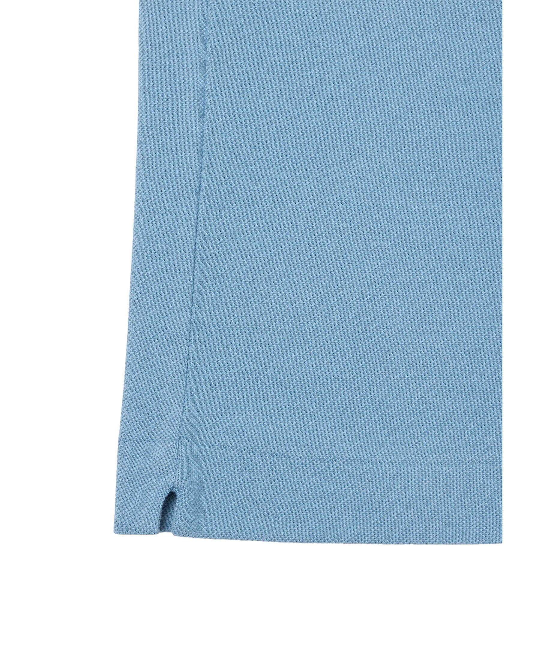 Blå pikétröja från Lacoste. Broderad logotyp på bröstet, två knappar fram, spetsig krage och korta slitsar i sidorna. Tillverkad i 100% bomull.