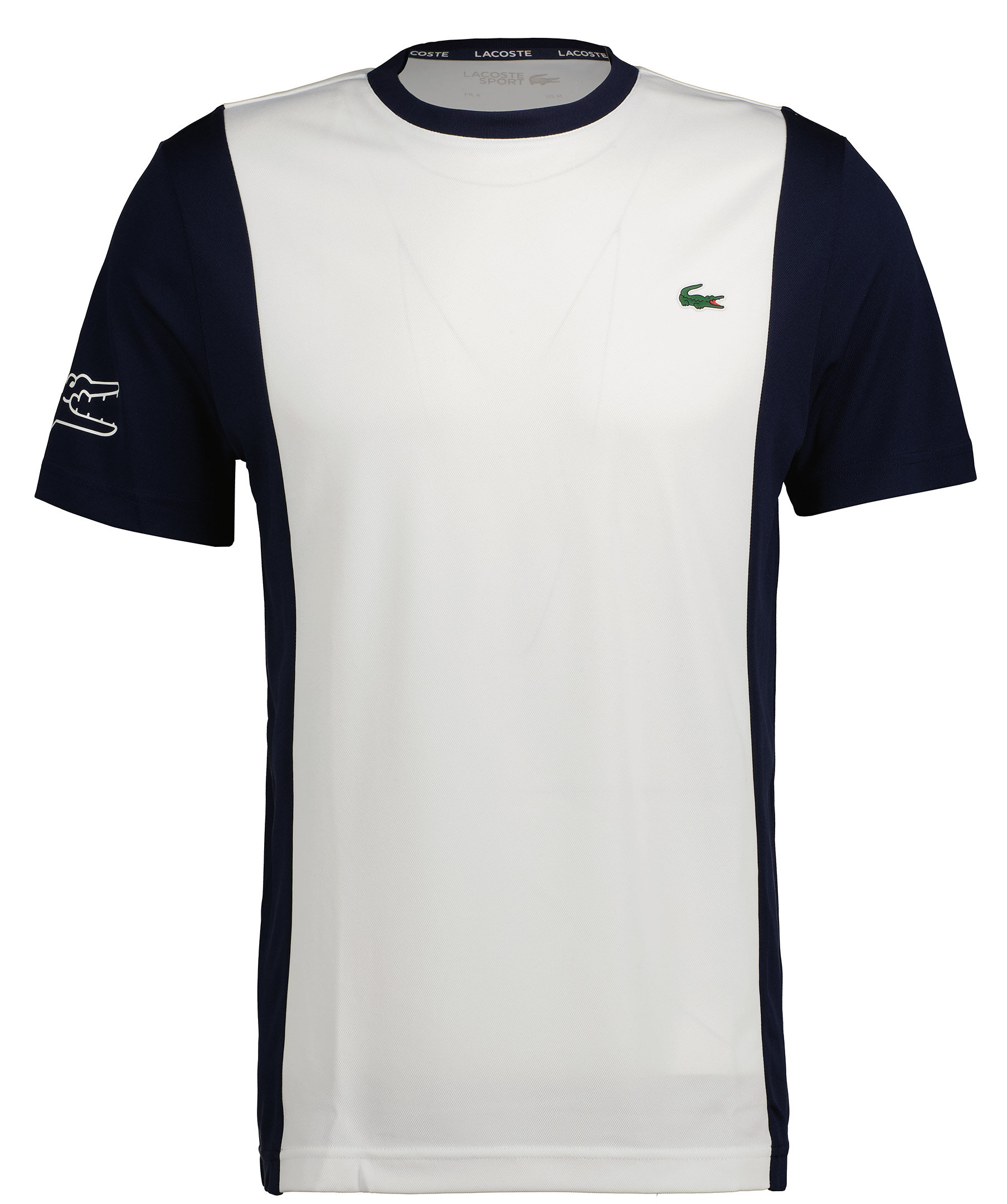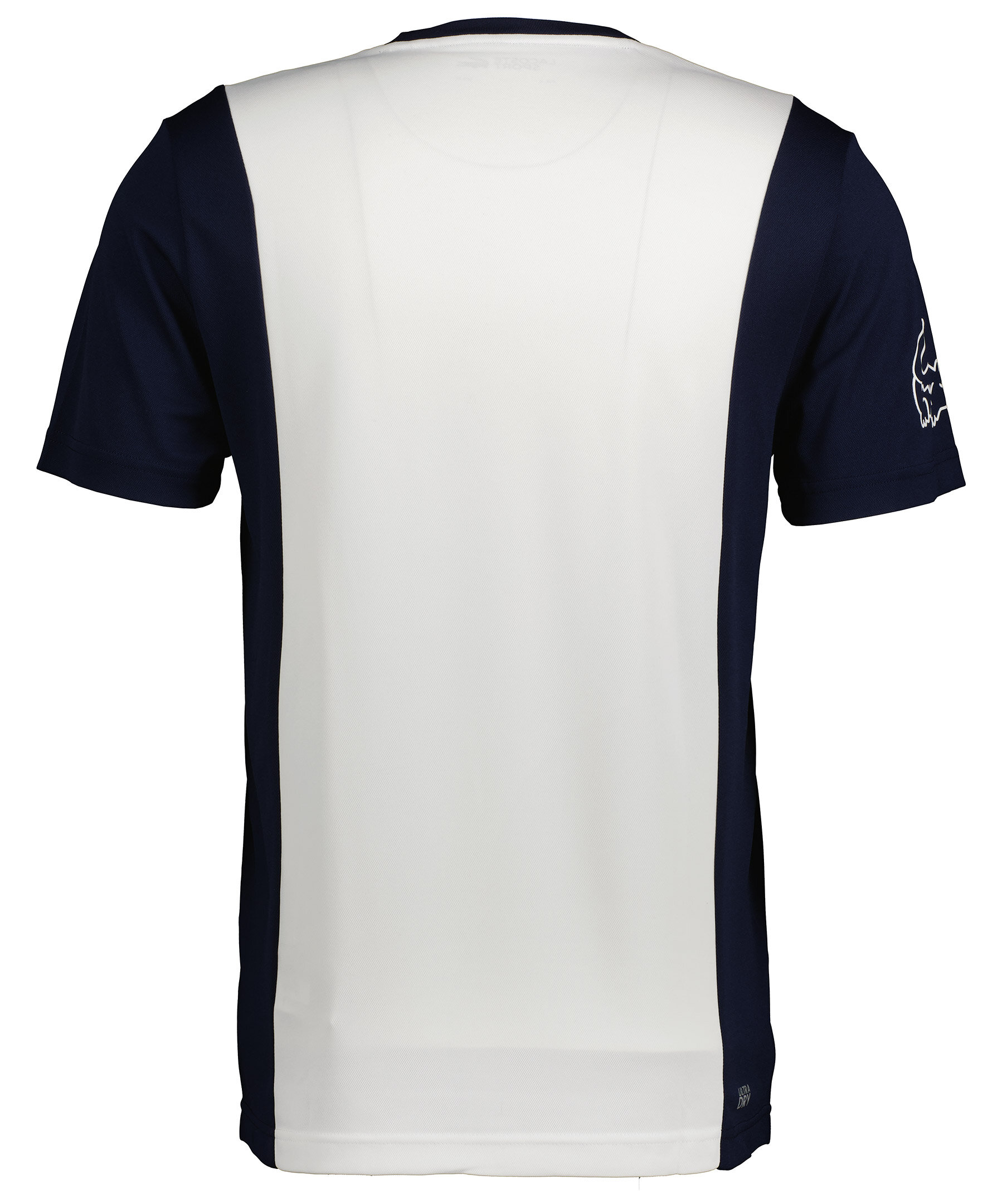 Vit tränings T-shirt med mörkblå paneler från Lacoste. Tillverkad i ett polyester material som andas. Gymmerad logotyp på vänter bröst, höger ärm.