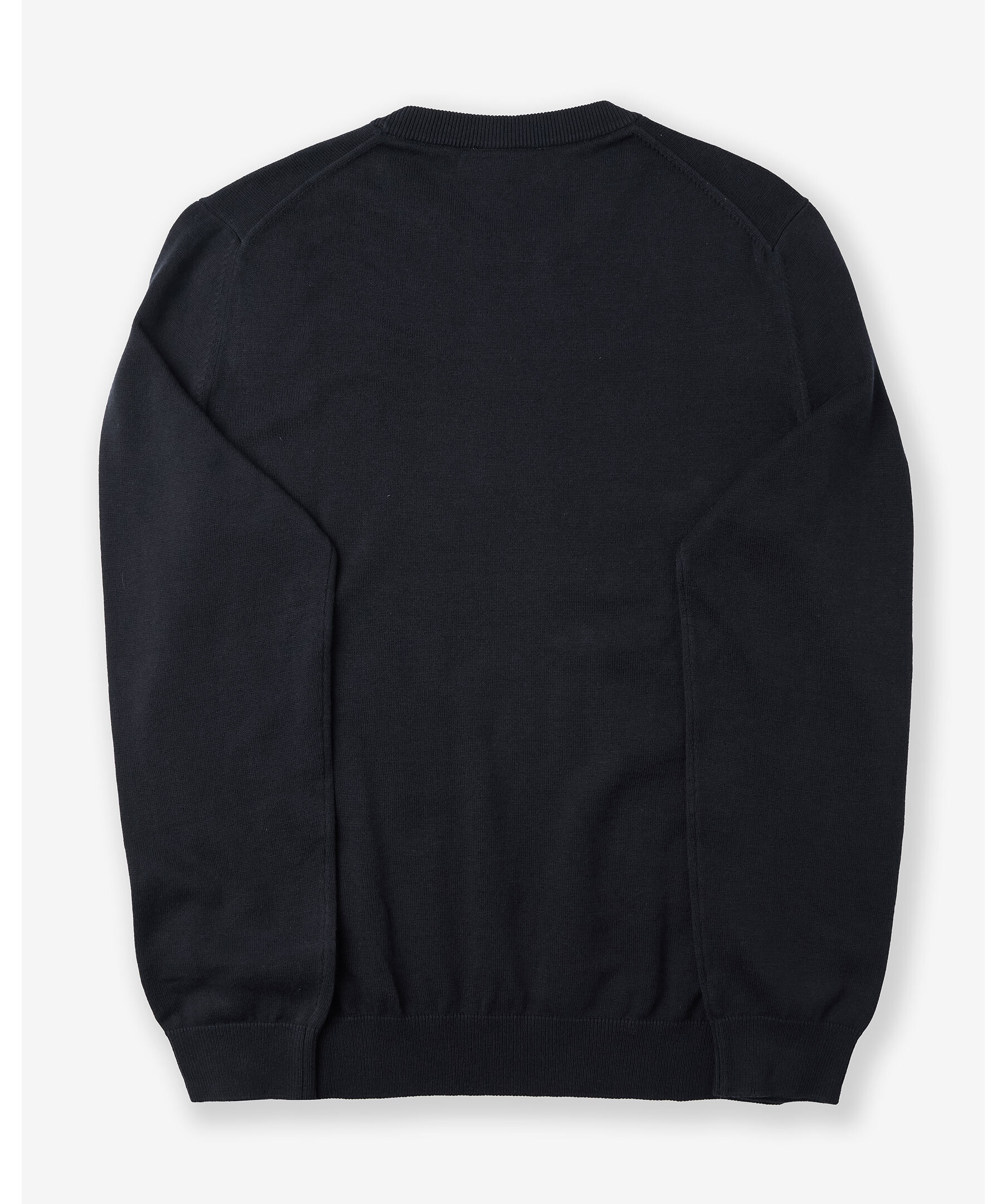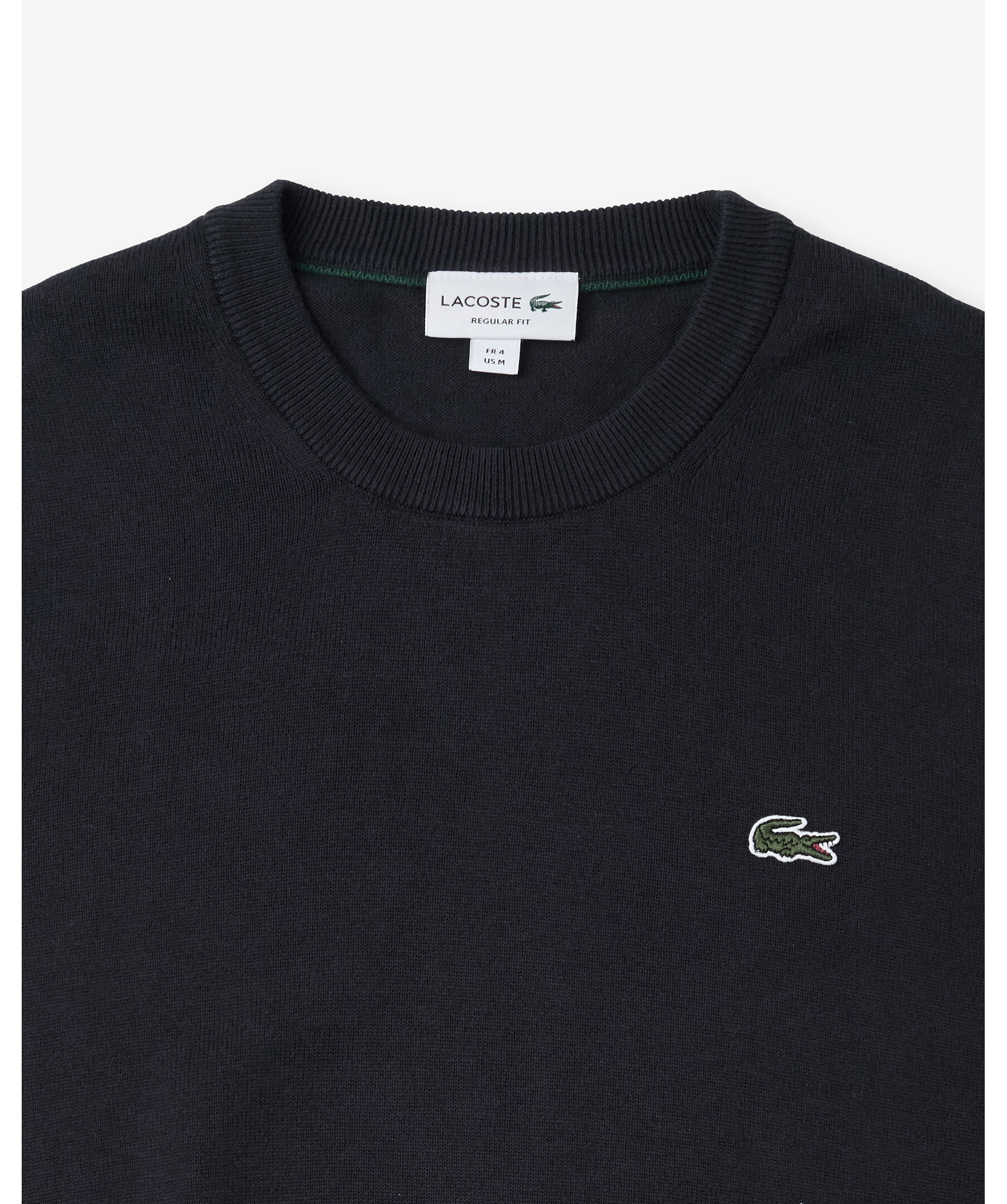 Svart, finstickad pullover från Lacoste. Tröjan har en rundad och ribbstickad halsringning samt ribbstickade muddar vid ärm- och plaggslut. Liten logotyp på bröstet. Tillverkad i en bomullsblandning.