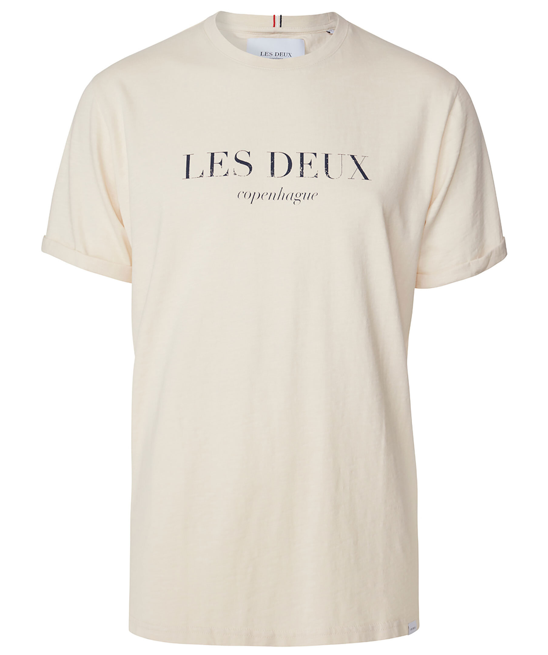 Ljusbeige t-shirt från Les Deux gjord i 100% bomull. T-shirten har en smal passform och stor logotyp tryck över bröstet. Tricolore-broderi vid nacken.