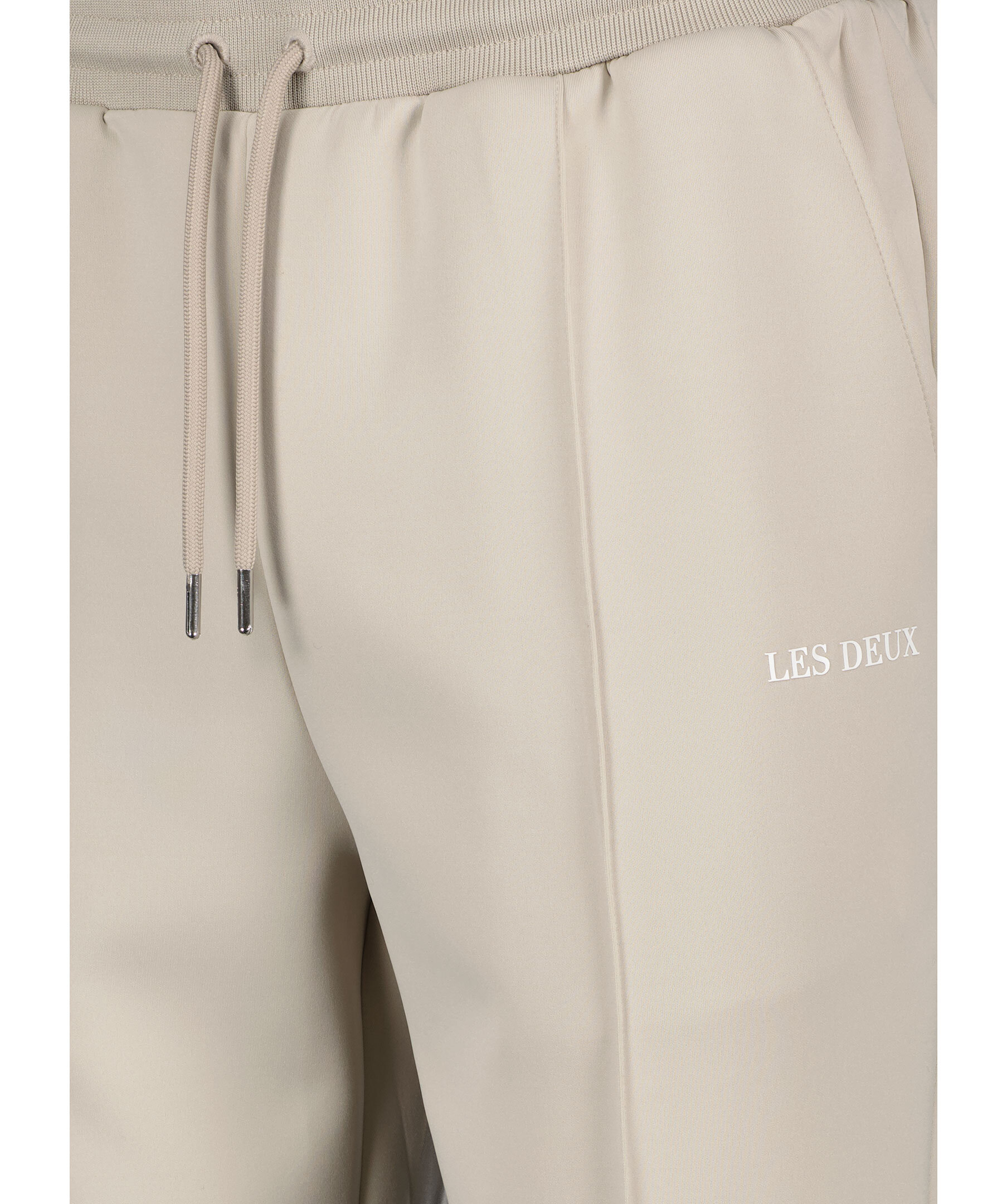 Gråbeigea byxor från Les Deux. Dragsko i midjan. Gummerad logotyp på vänster lår. Broderad logotyp baktill på höger sida. Två fickor framtill.