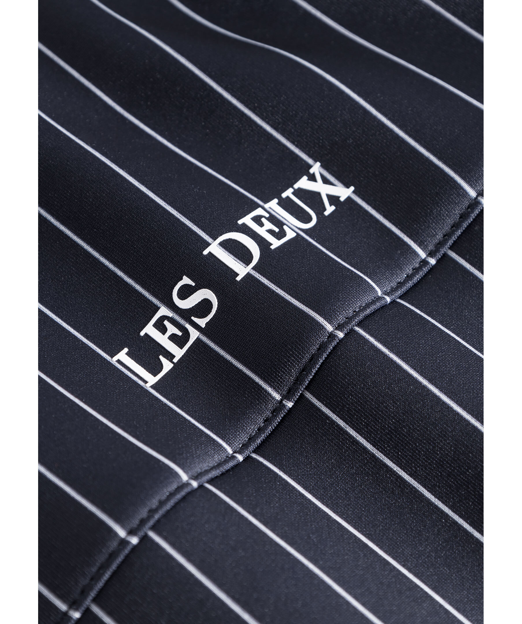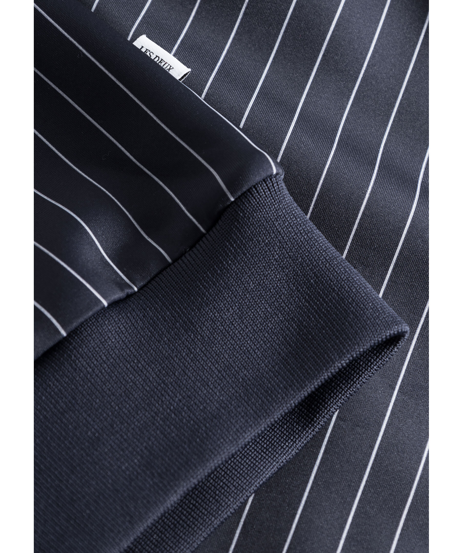 Mörkblå trackjacka från Les Deux med ett kritstrecksrandigt mönster. Jackan stängs med dragkedja framtill och har ståkrage, två sidfickor, ribbstickade muddar och en gummitryckt logga på bröstet. Tillverkad i en polyesterblandning.