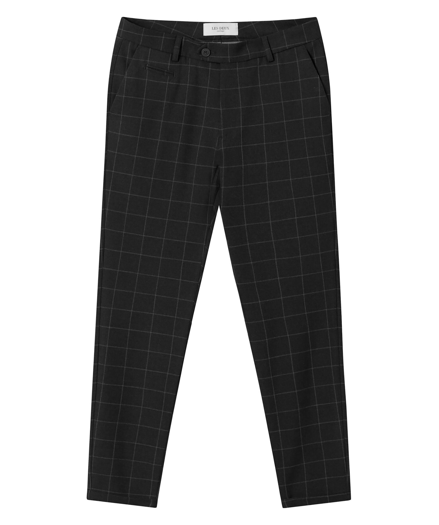 Gråa kostymbyxor med ett ljust rutigt mönster från Les Deux. Slim fit modell, stretchigt material, snedställda fickor fram, två bakfickor, stängs med dragkedja i gylfen.