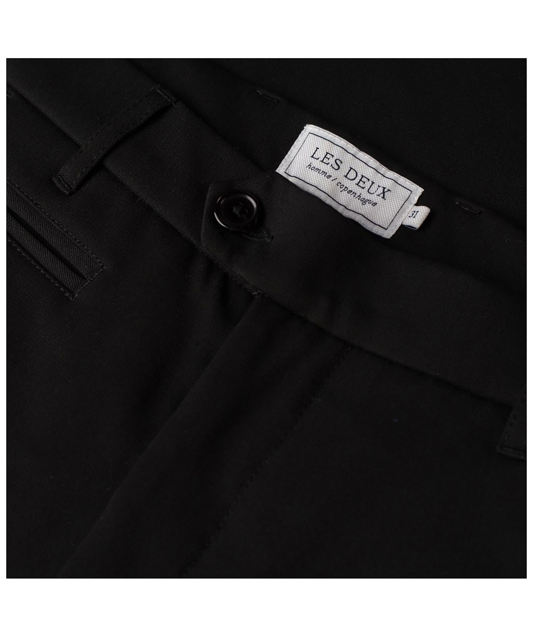 Svarta slim-fit byxor från Les Deux. Stretchmaterial och en smal fotöppning med uppvikt kant. Två framfickor samt två bakfickor med knapp. Gylf med dragkedja och knappar.