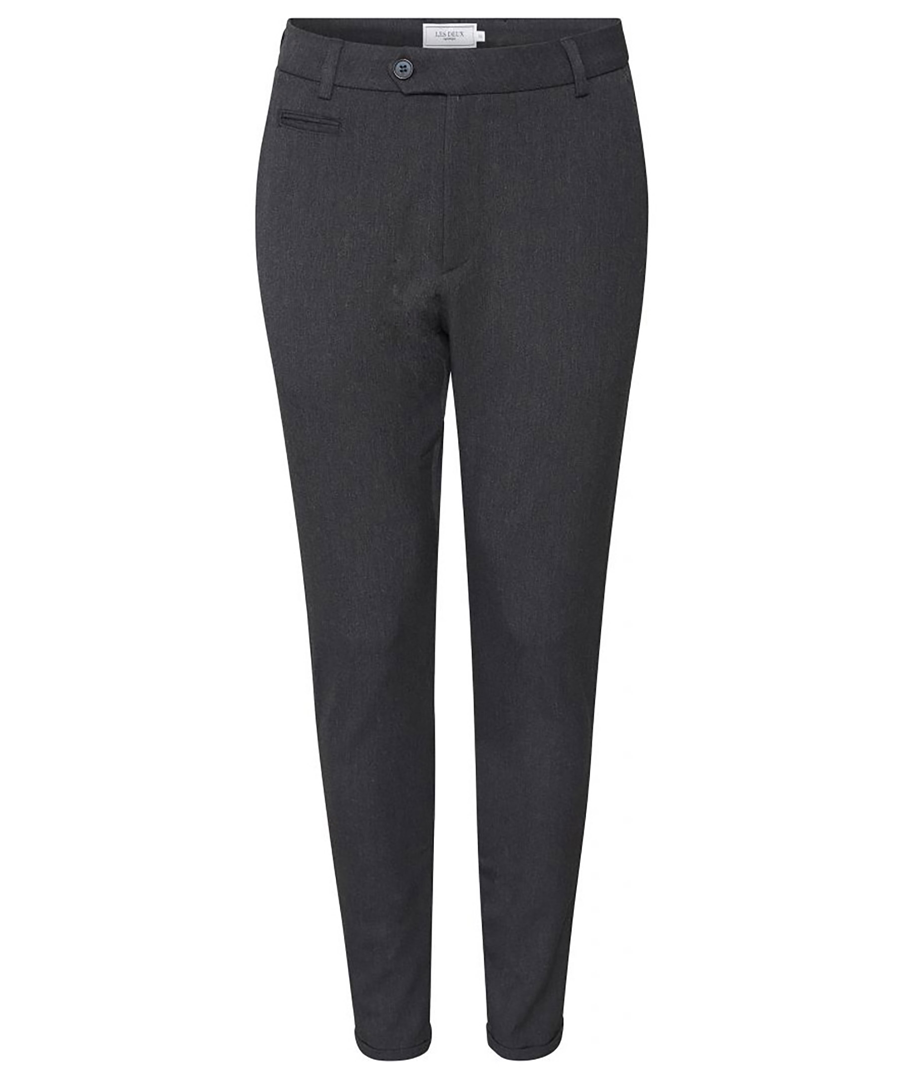 Mörkgrå kostymbyxor i slim-fit modell från Les Deux. Byxorna är lätt melerade och har en skön stretch, uppvikta vid fotkanten, stängs med två knappar och dragkedja vid gylfen. Två öppna sidofickor och två bakfickor med knapp.