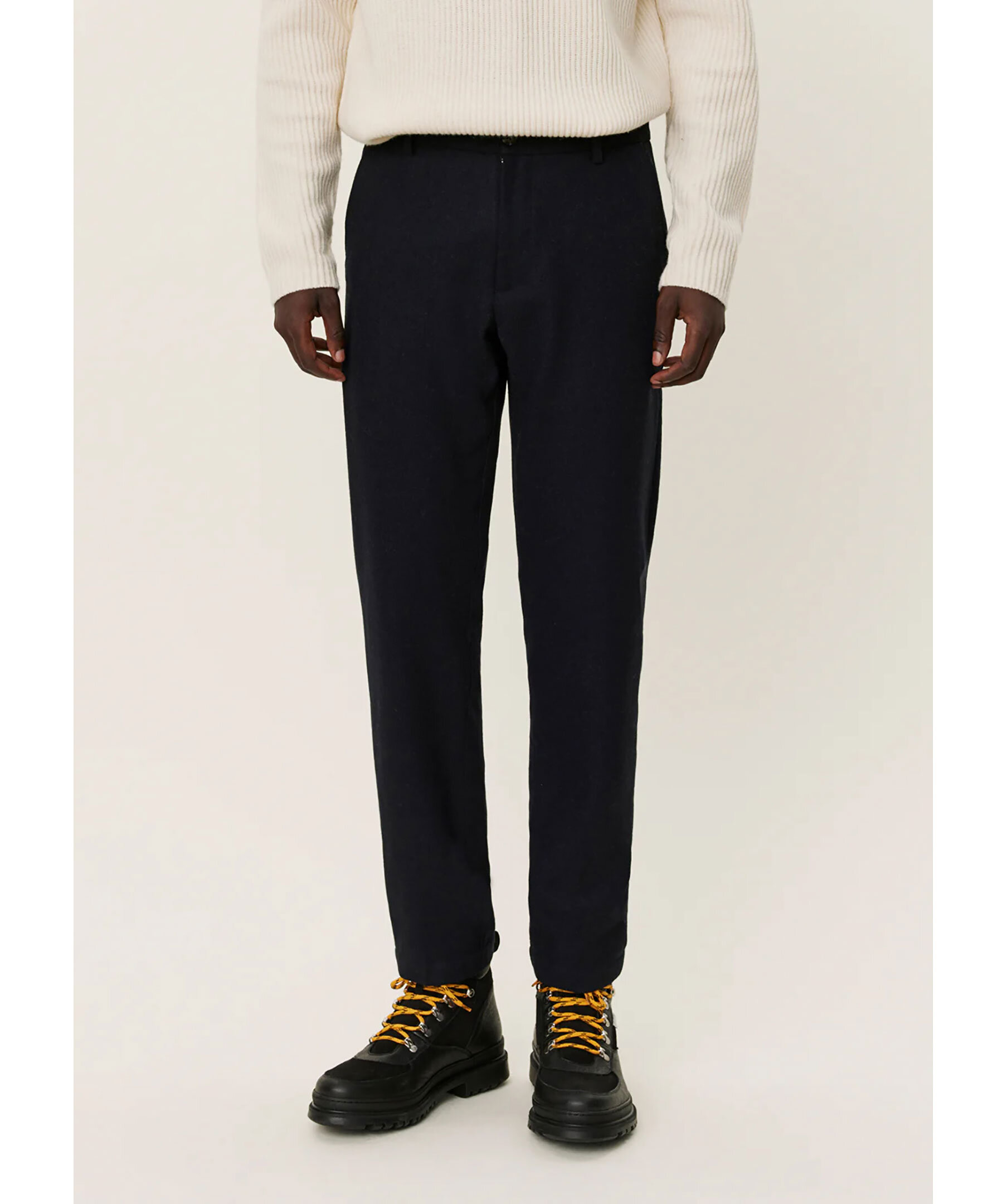 Mörkblåa kostymbyxor i borstad ullblandning från Les Deux. Byxorna har silkeslent innerfoder, pressveck, två sidfickor, två passpoalbakfickor med broderad logotyp samt bälteshällor i midjan.