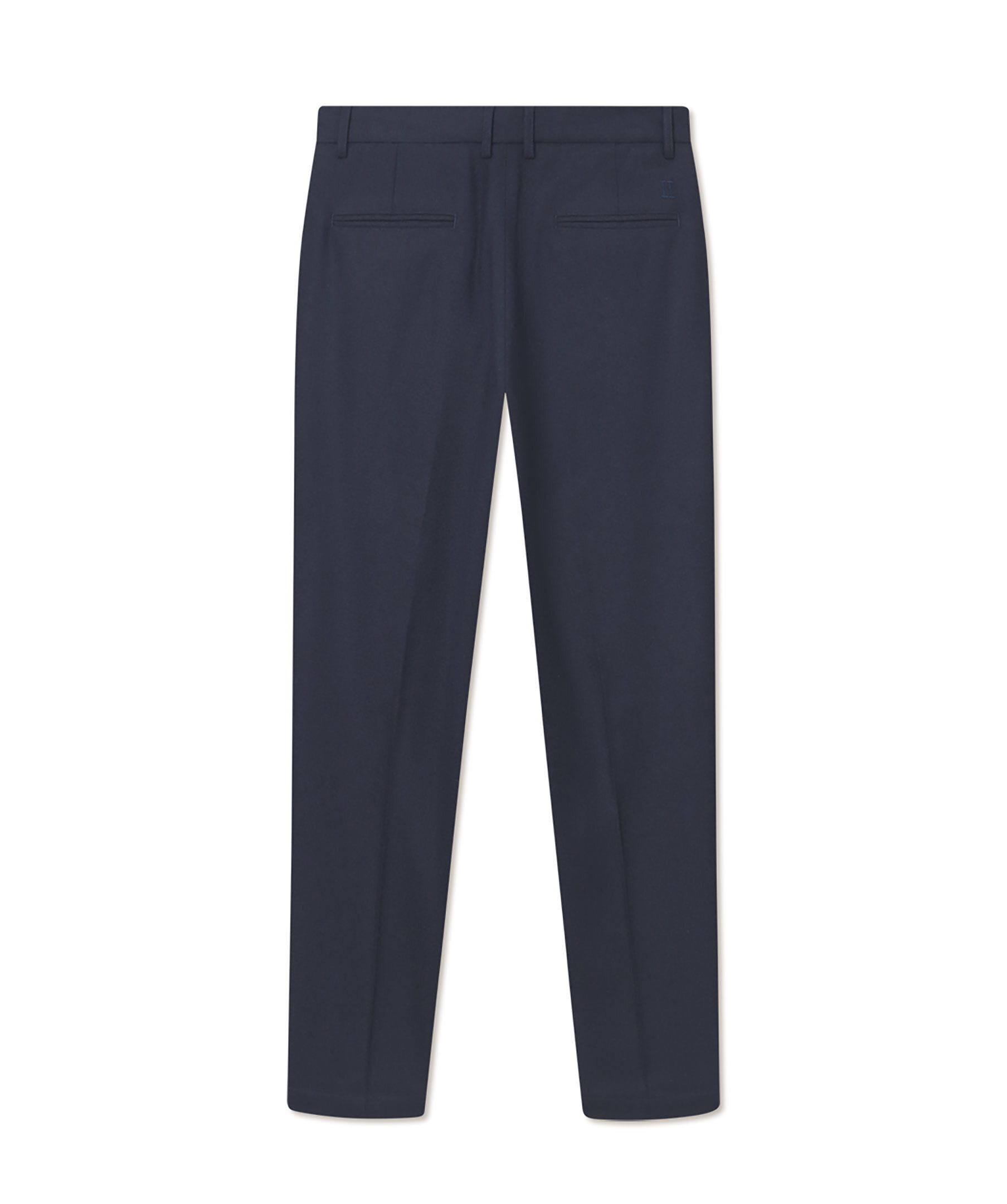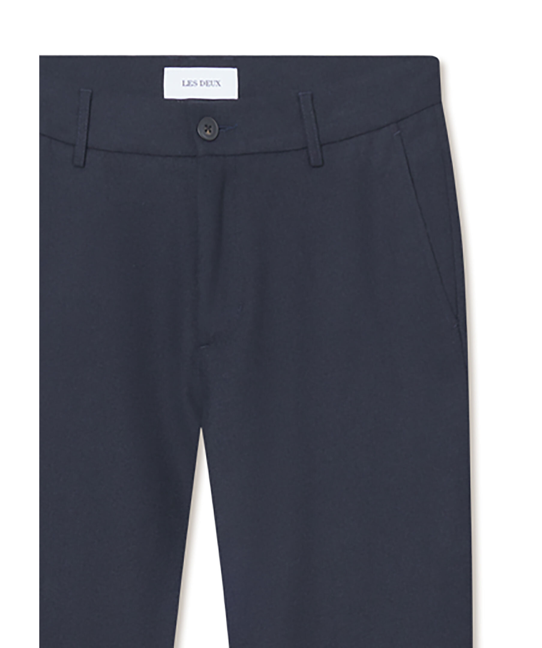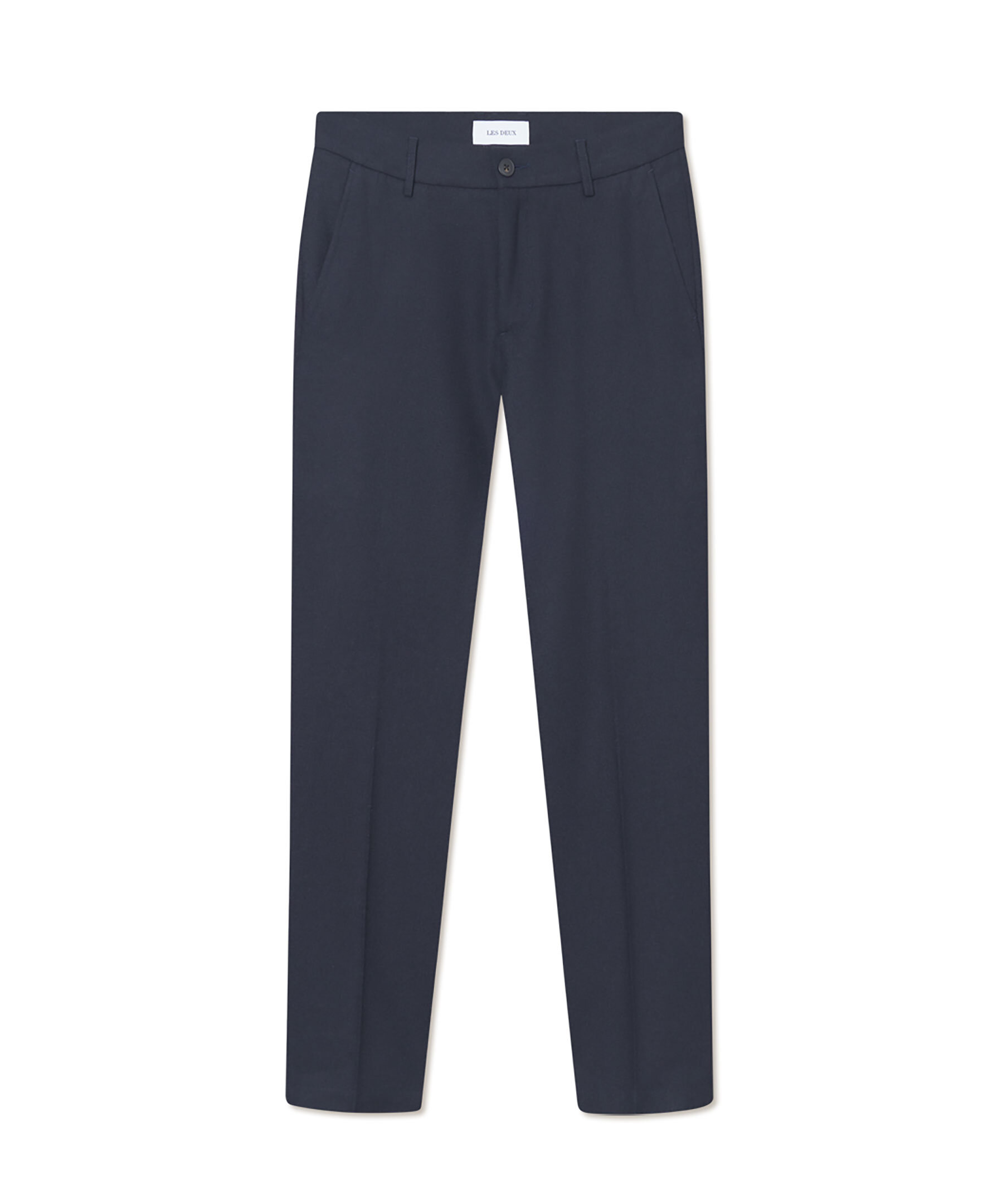 Mörkblåa kostymbyxor i ull från Les Deux. Byxorna har bälteshällor i midjan, två sidfickor, två passpoalfickor baktill, knapp- och dragkedjestängning samt pressveck framtill. Tillverkade i en borstad ullblandning.