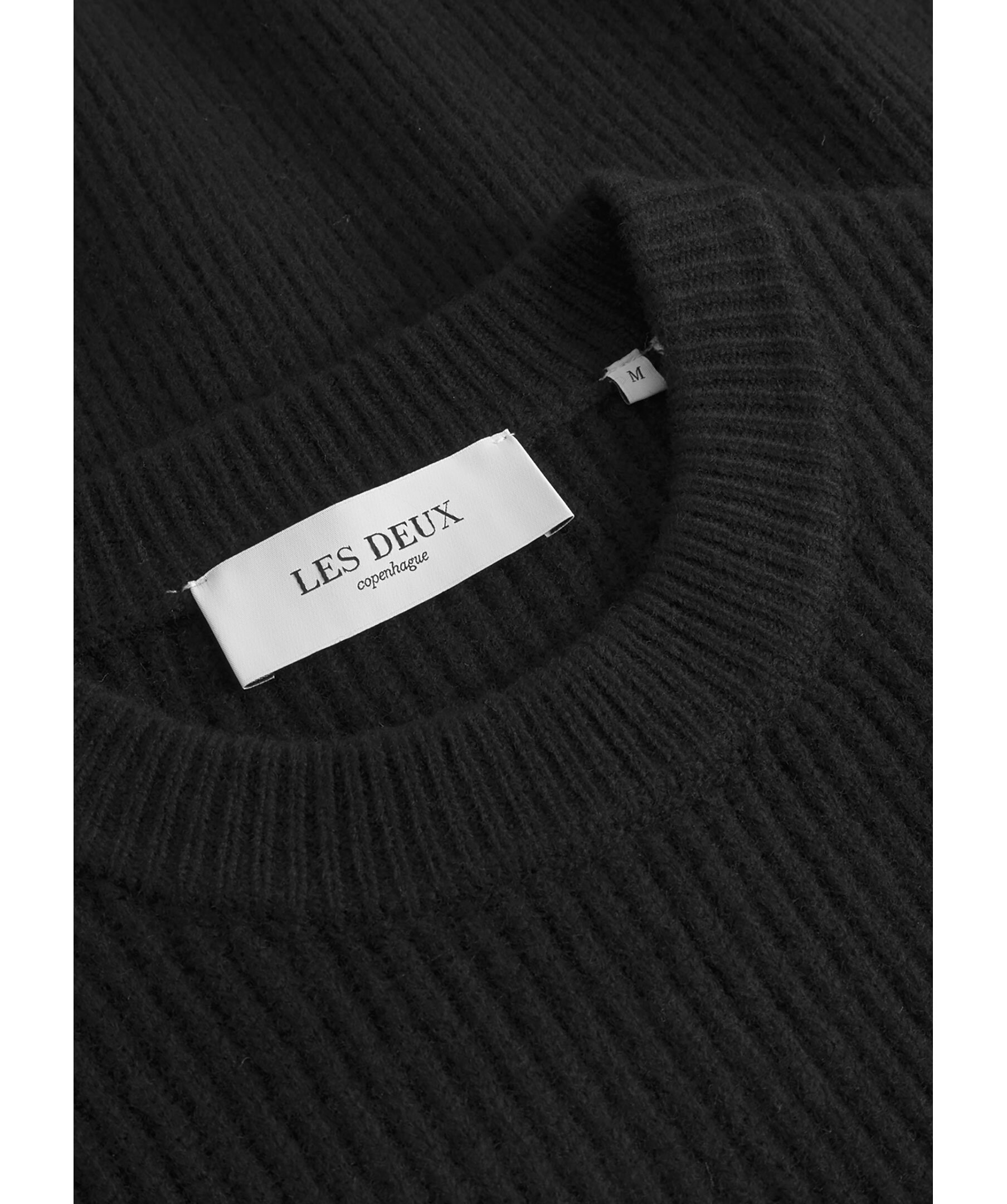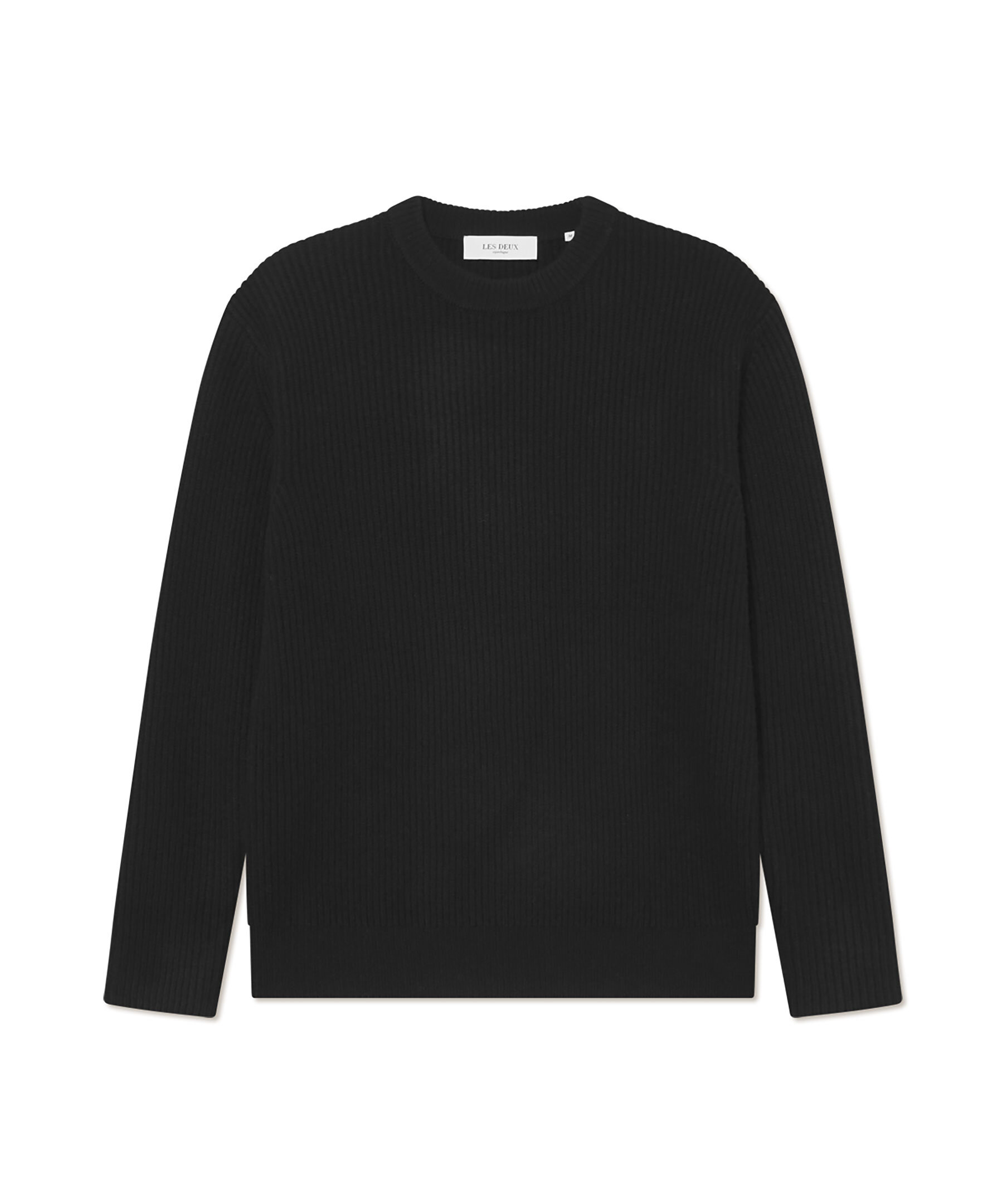 Svart, ribbstickad pullover från Les Deux. Tröjan har en klassisk crewneck och rak fåll. Tillverkad i 100% merinoull.
