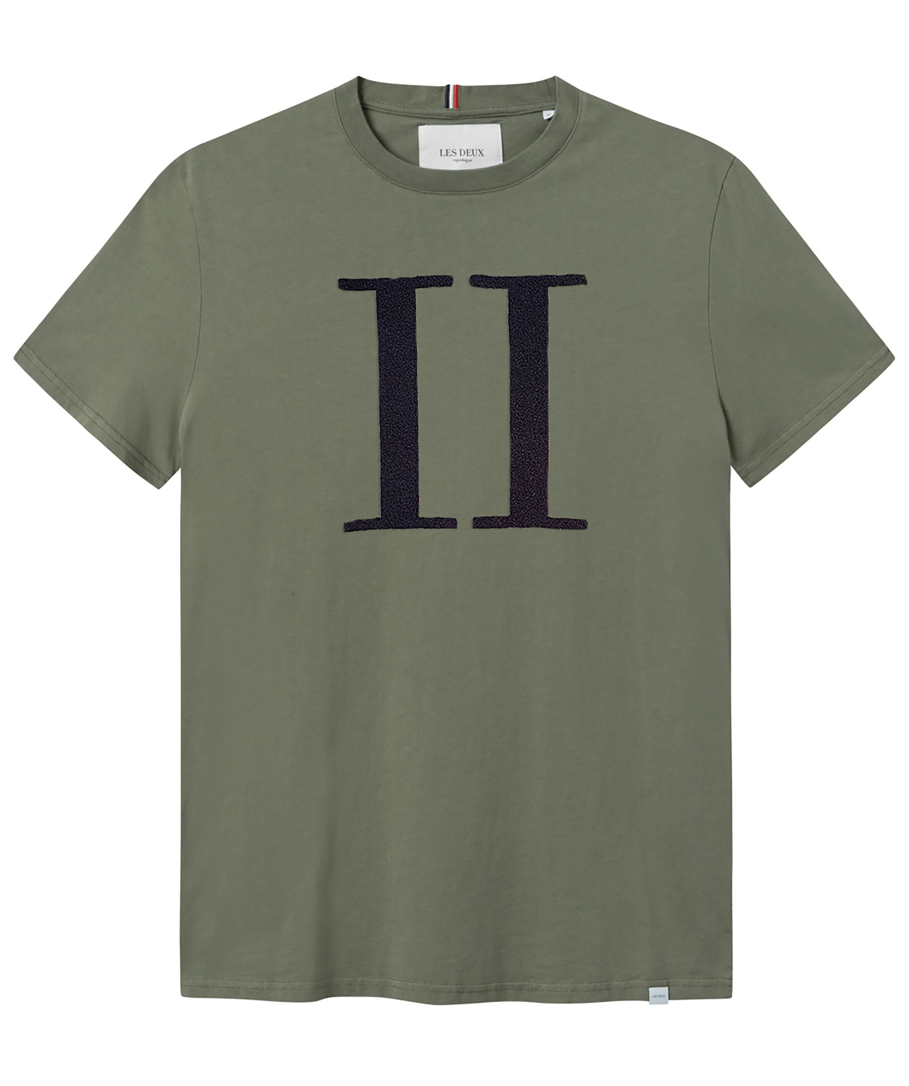 Olivgrön t-shirt från Les Deux. Stor, svart logotyp i frotté på bröstet, crewneck, tillverkad i bomull.