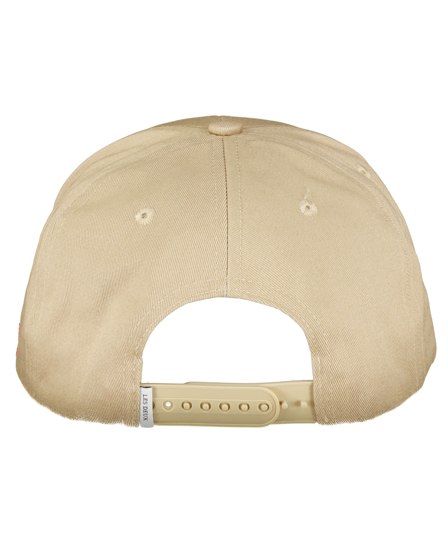 Beige keps från Les Deux med broderad, ljusbeige logotyp på framsidan. Justerbart spänne bak och tre broderade streck i vitt, rött och blått på den vänstra sidan. Tillverkad i 100% bomull. * 100% bomull * Broderad logotyp * Justerbart spänne