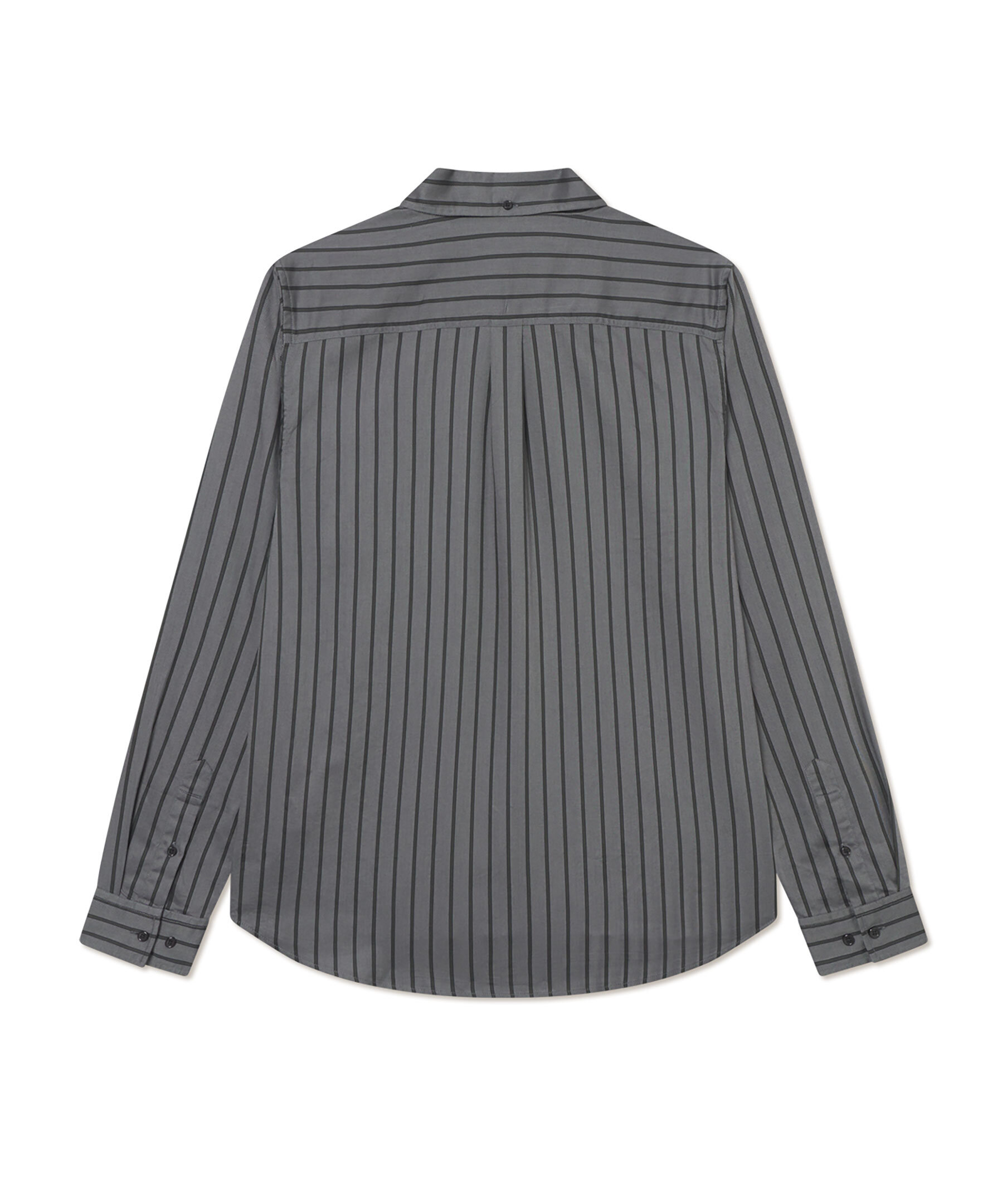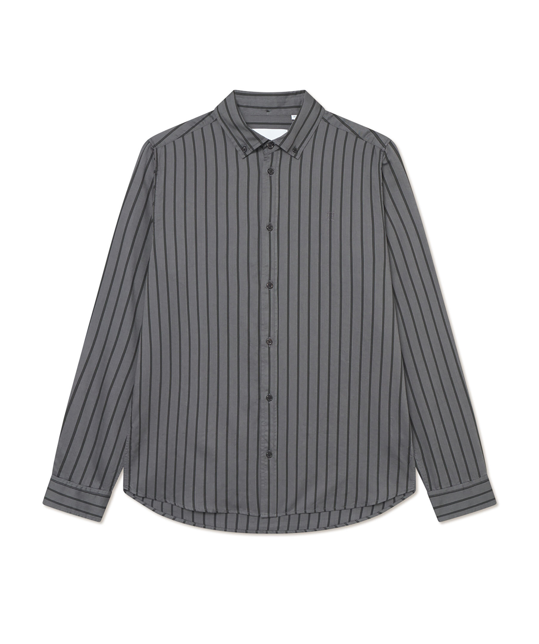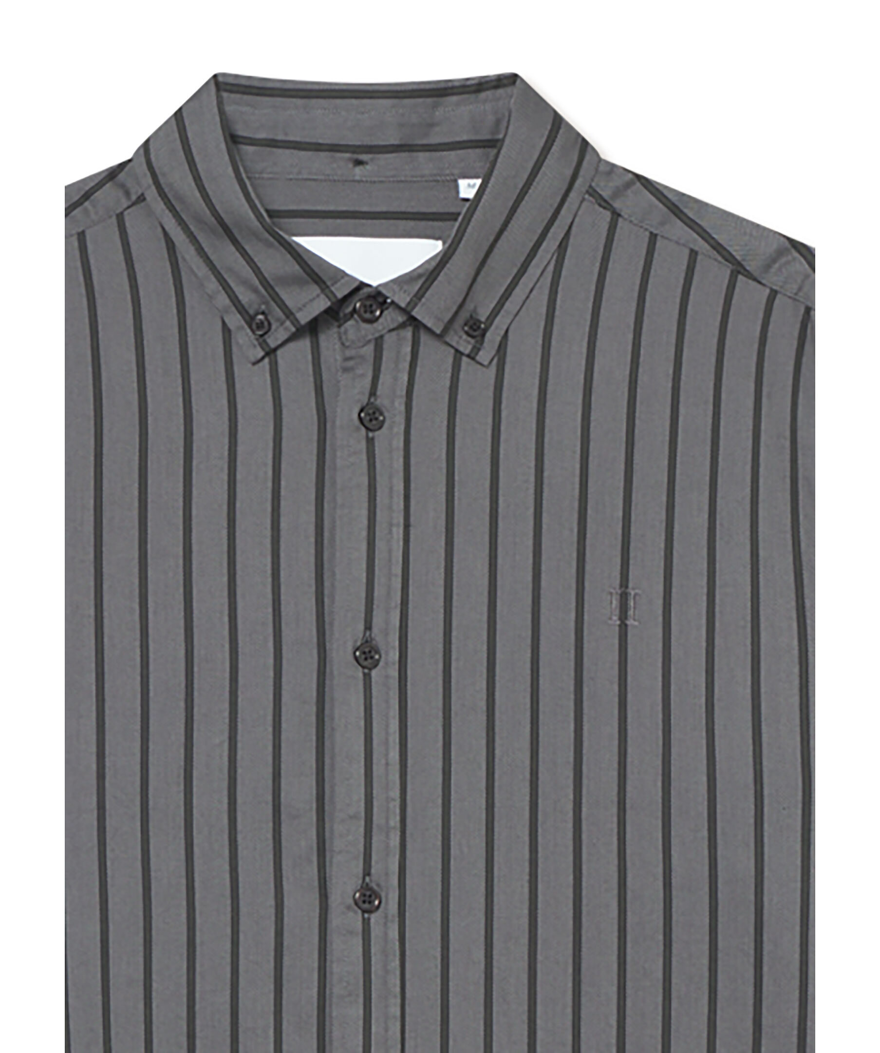 Mörkgrå, randig skjorta med subtilt fiskbensmönster från Les Deux. Skjortan har button-down krage, rundad fåll, samt ok med boxveck. Tillverkad i bomull.