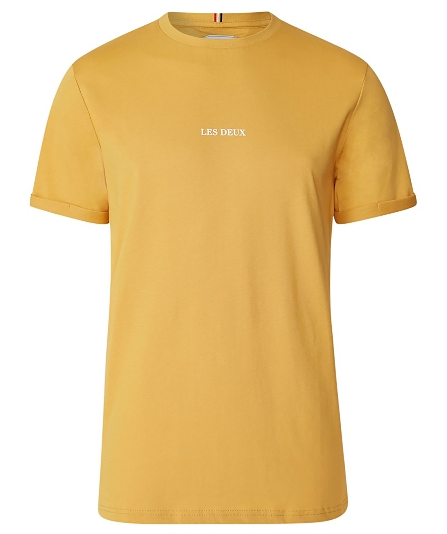 Senapsgul t-shirt från Les Deux. Gjord i 100% bomull, tryckt logga i vitt på bröstet och upprullade ärmar.