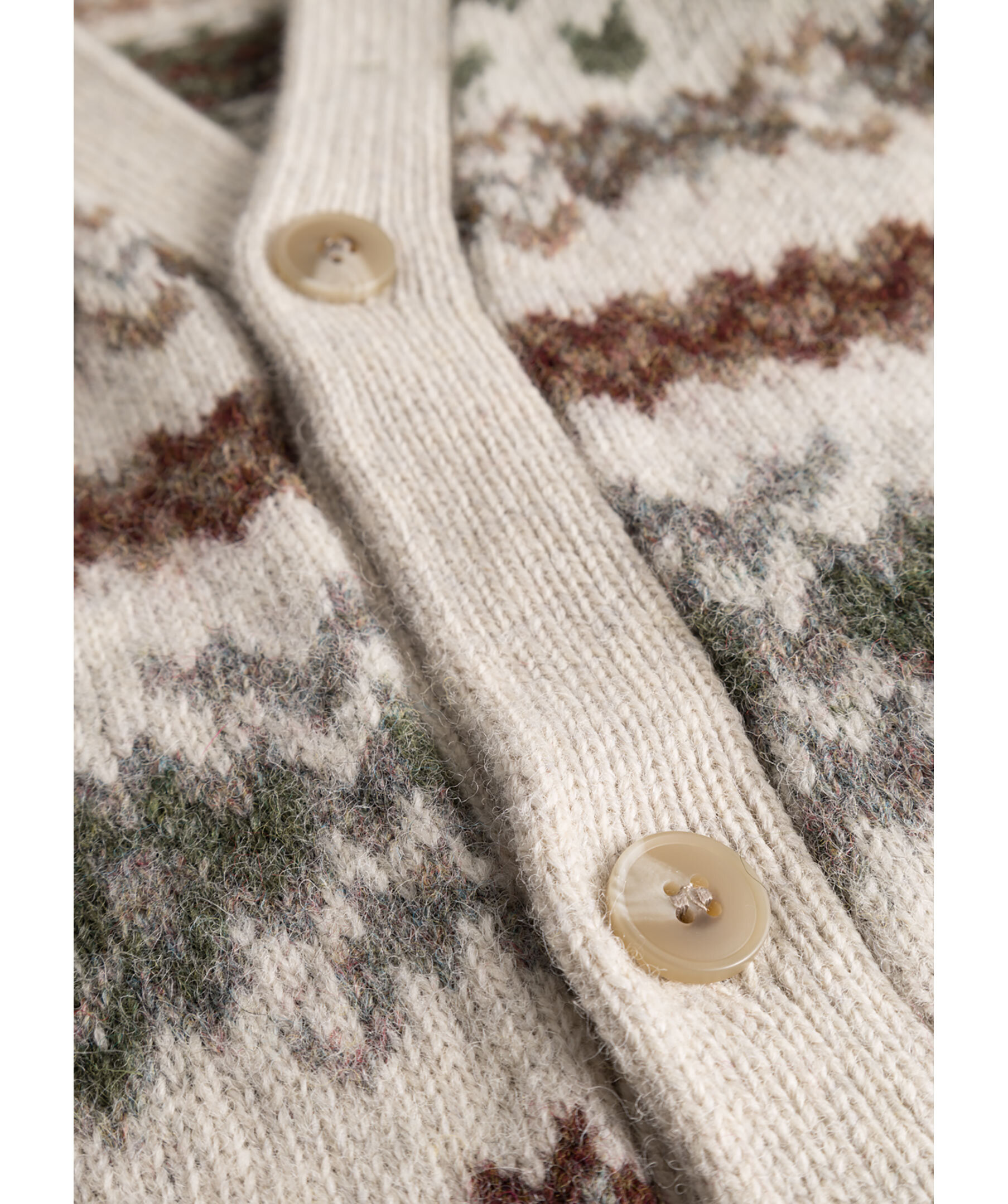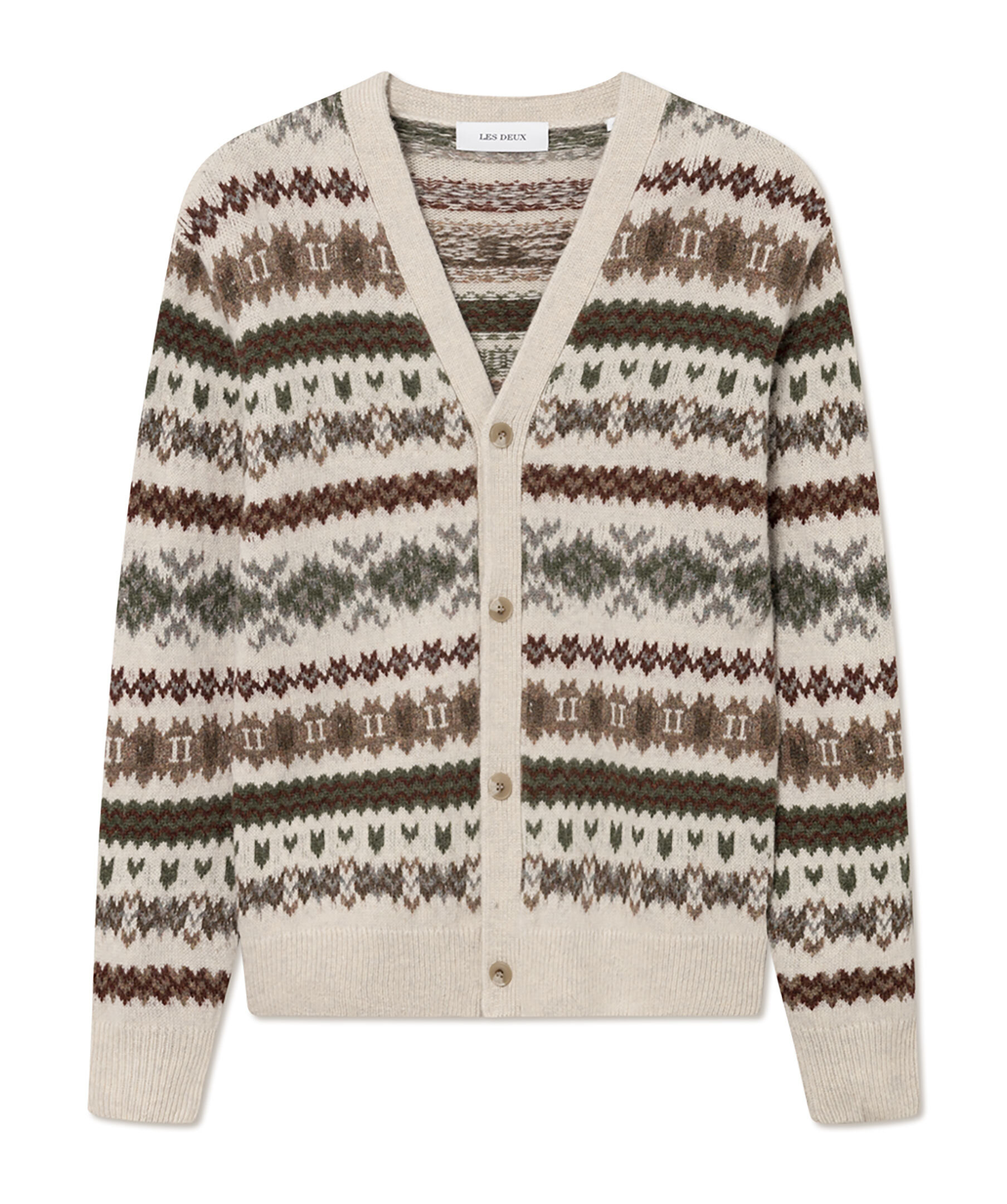 Stickad cardigan i Fair Isle-mönster från Les deux. Koftan har v-ringning och knappar framtill. Tillverkad i 100% ull.