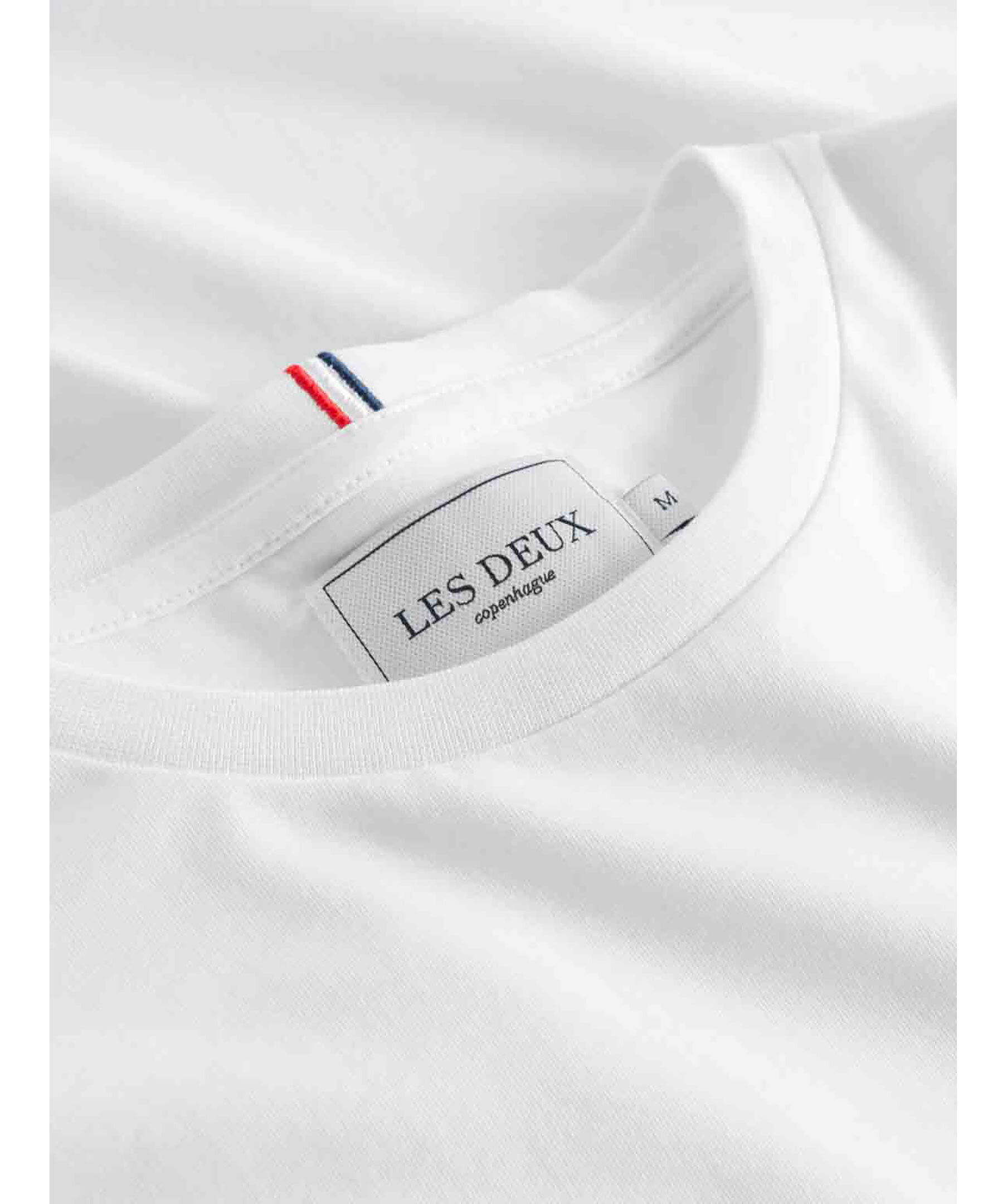 Vit t-shirt från Les Deux. Rundad halsrining. Broderad logotyp i orange på vänster bröst. Tillverkad i 100% bomull. Uppvikta ärmar.