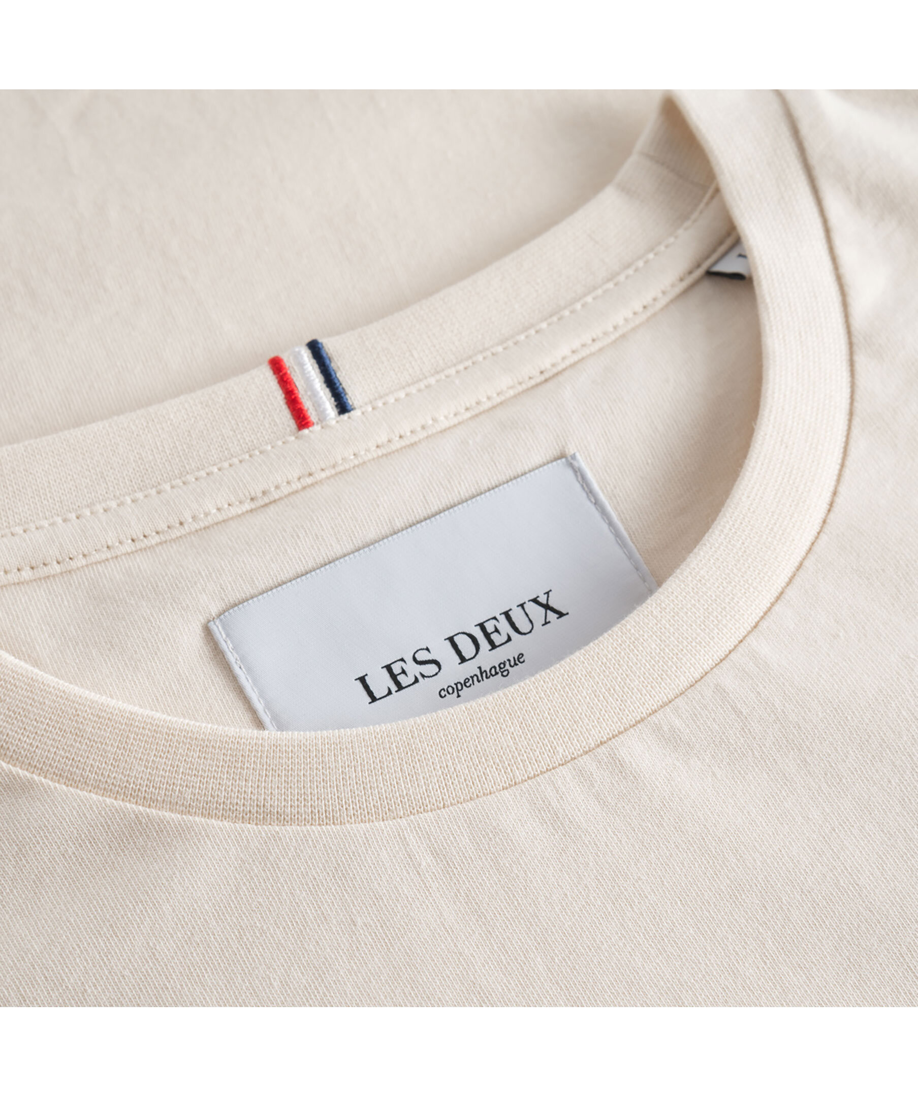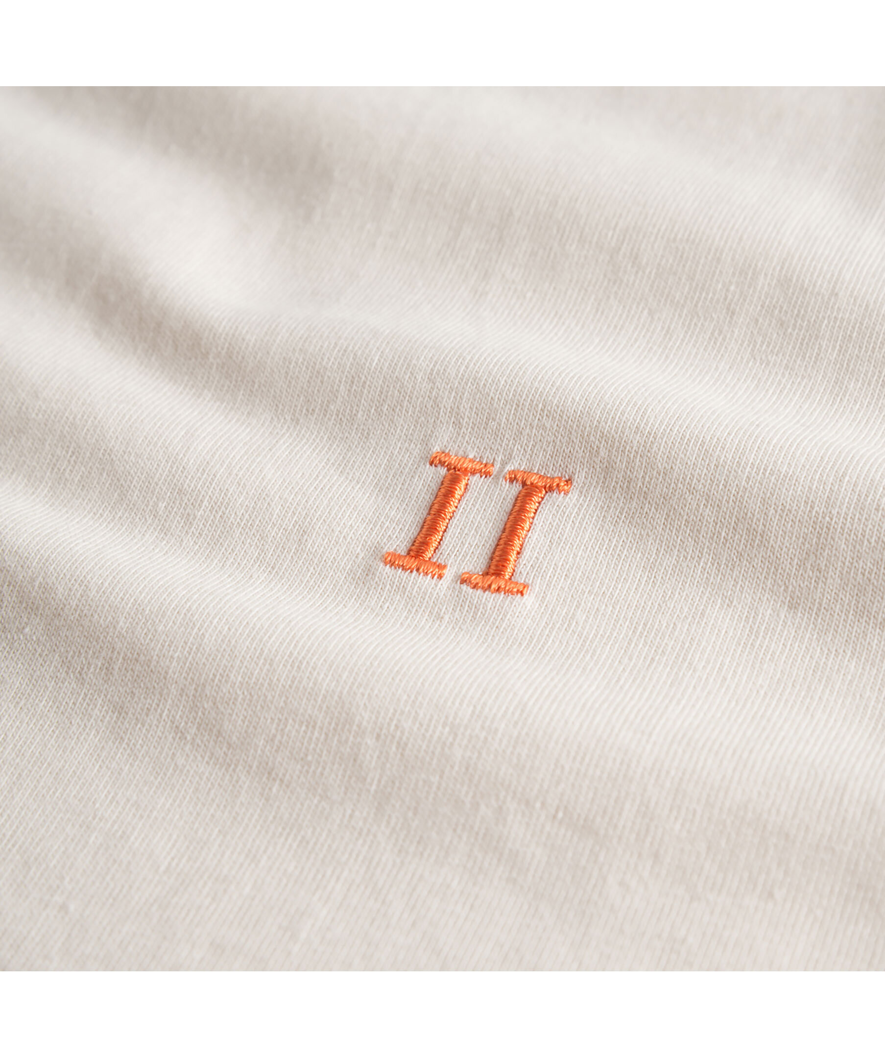 Krämvit t-shirt från Les Deux. Rundad halsrining. Broderad logotyp i orange på vänster bröst. Tillverkad i 100% bomull. Uppvikta ärmar.