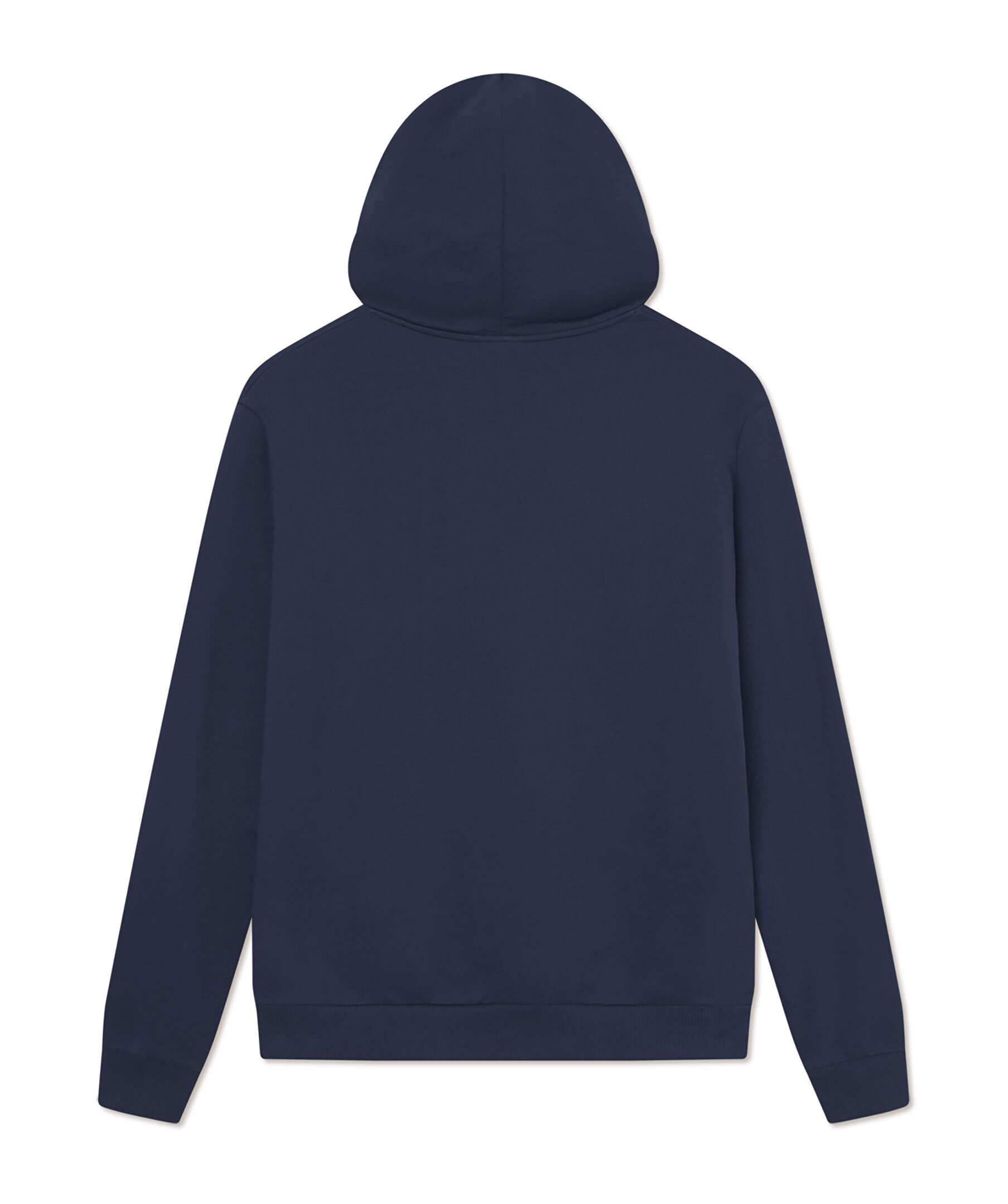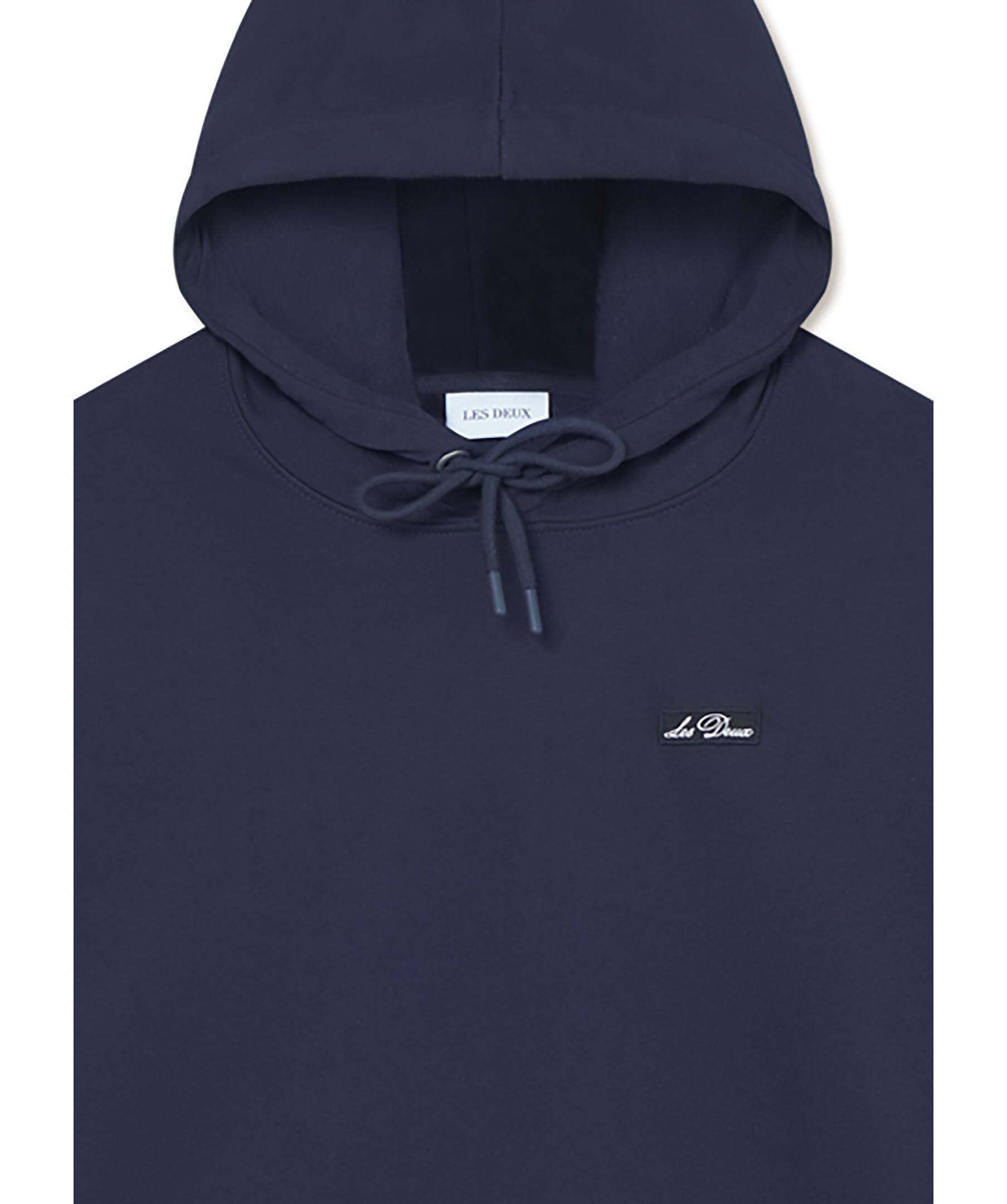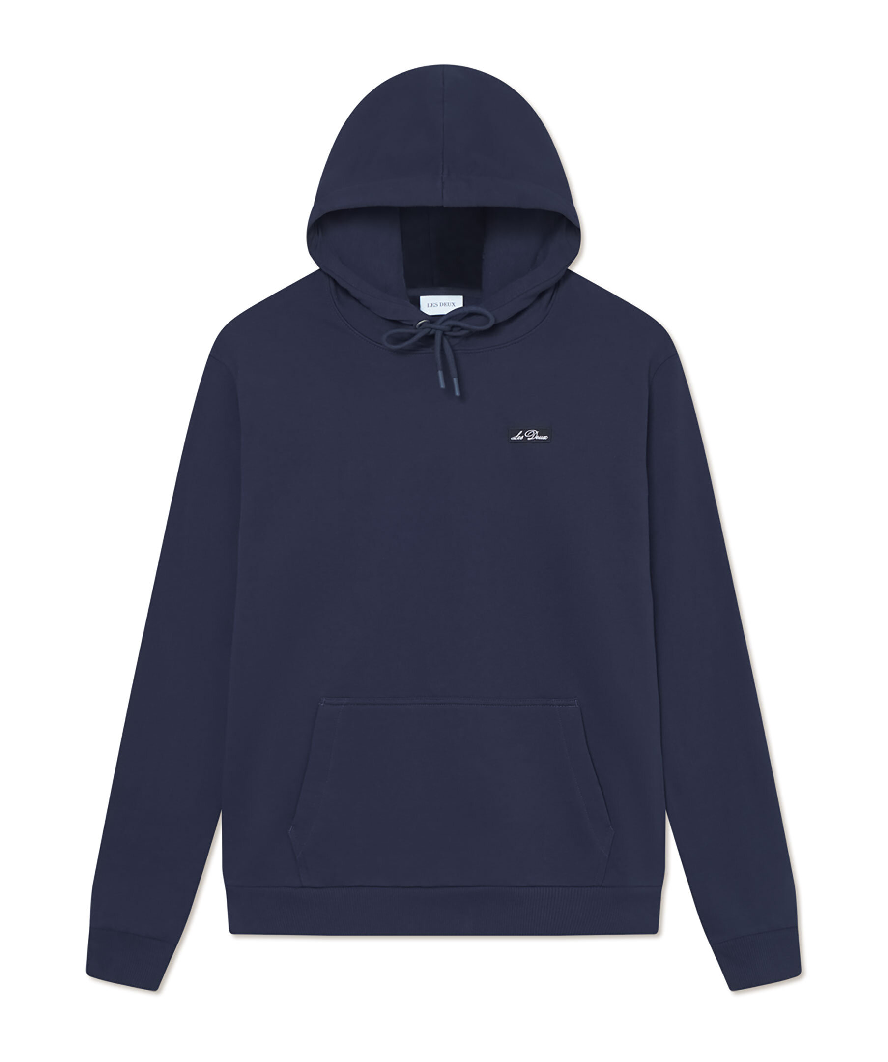 Mörkblå hoodie från Les Deux. Tröjan har en klassisk känguruficka på magen, huva med dragsko samt en patch med kontrastfärgad kursiv text på bröstet. Tillverkad i ekologisk bomull.