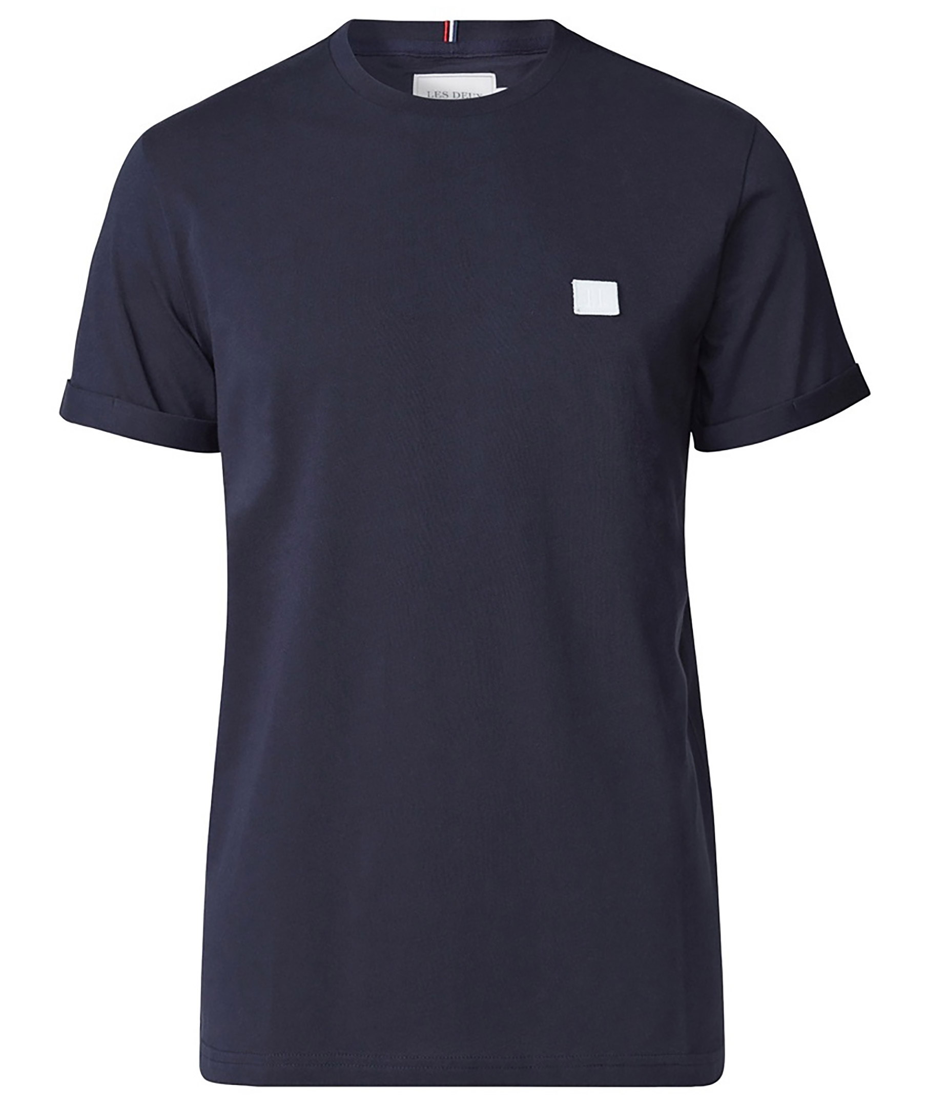 Marinblå t-shirt i normal passform från Les Deux. Gjord i 100% skön bomull. Rundad hals, ljusblå patch med logga på bröstet. T-shirten har även uppkavlade ärmar.