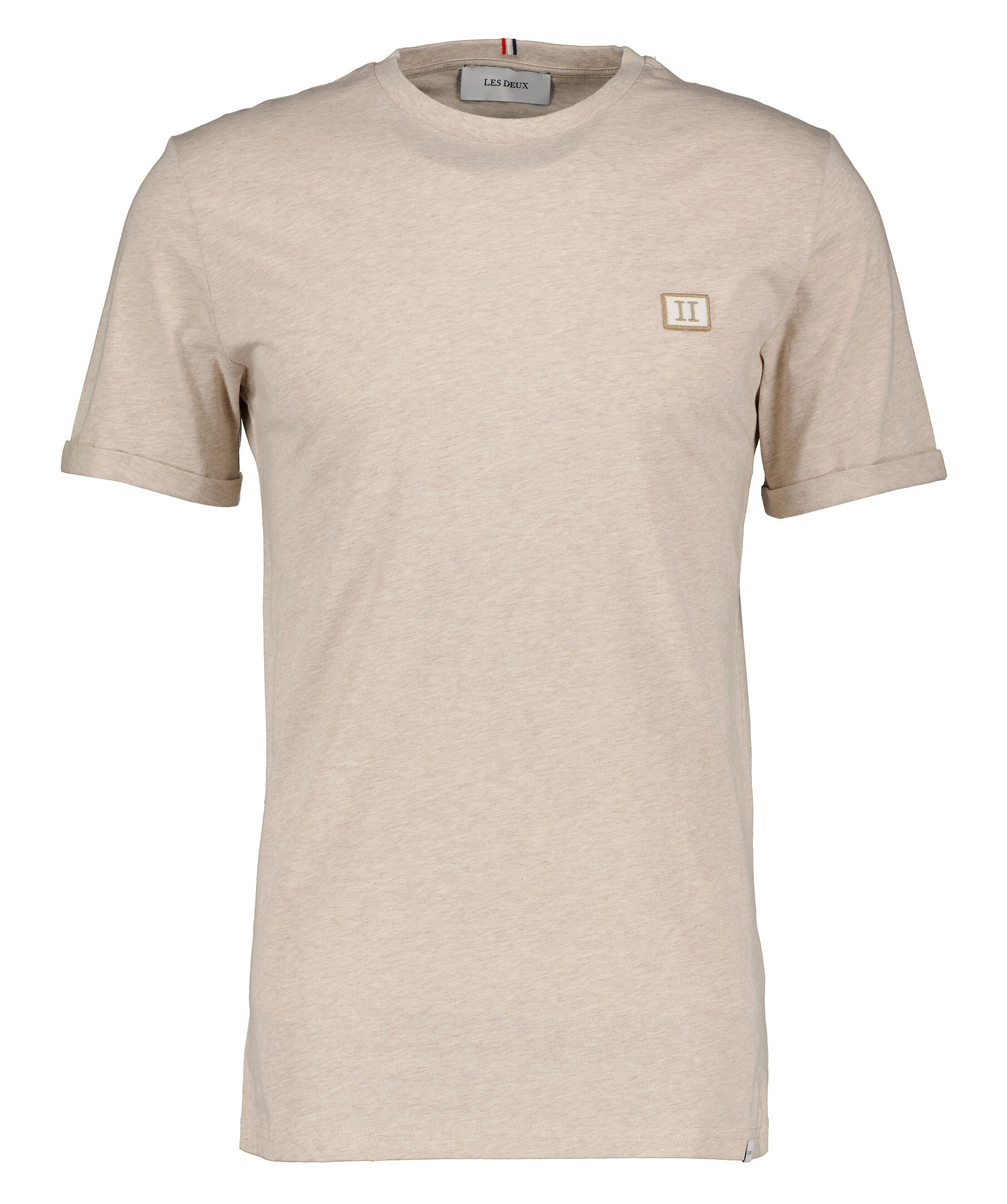 Sandfärgad t-shirt från Les Deux. Tröjan är gjord i 100% bomull och har en mjuk borstad insida. Broderad patch med logotyp på bröstet. T-shirten har uppvikta ärmar.