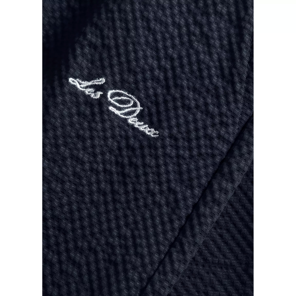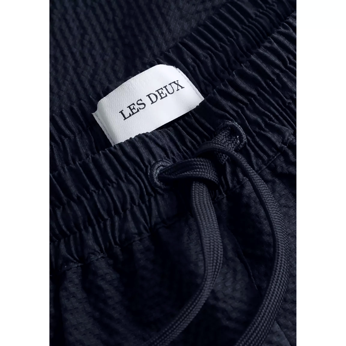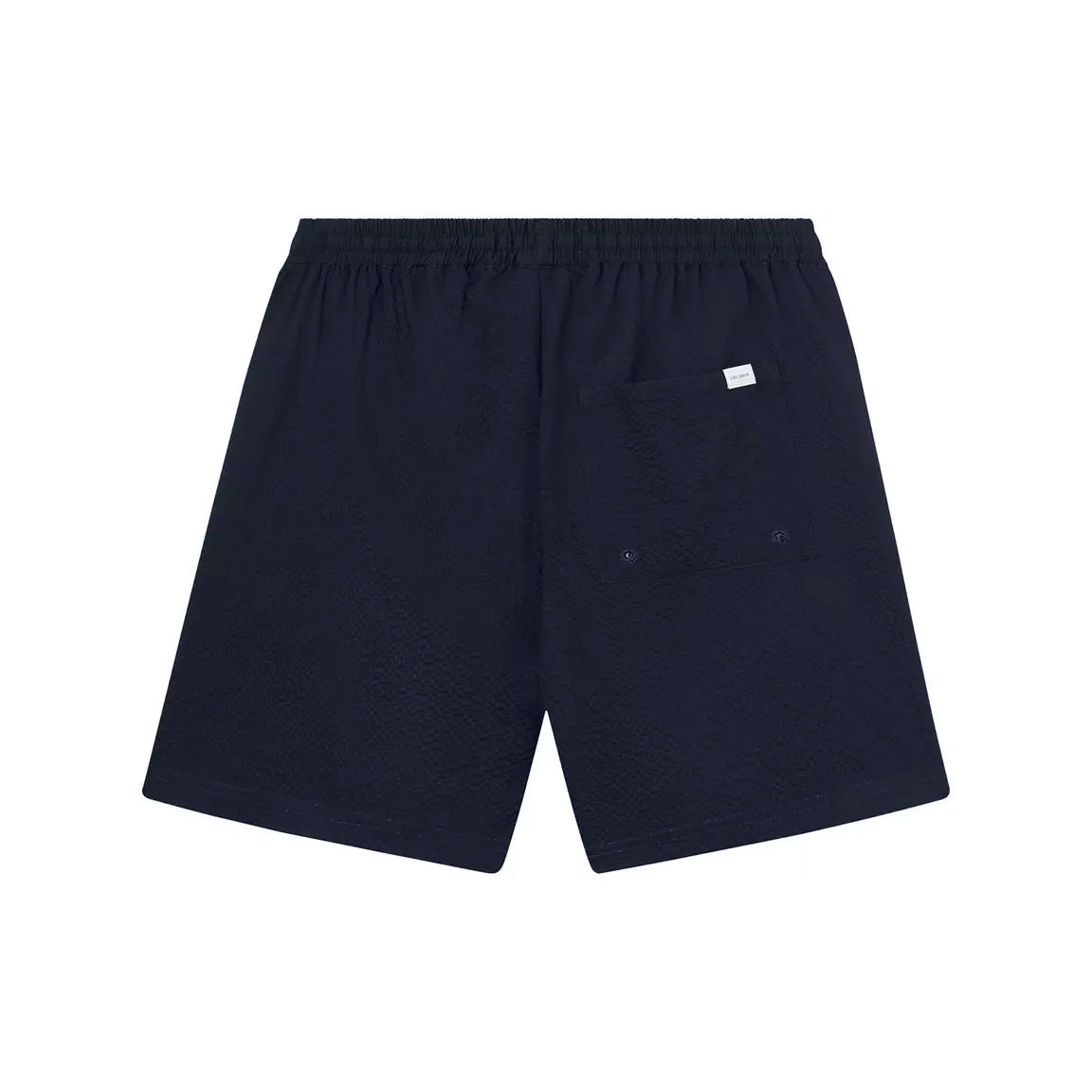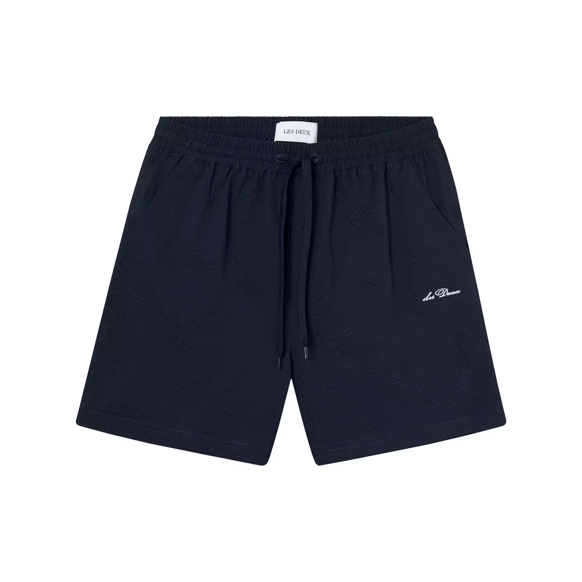 Marinblåa badshorts från Les Deux. Tillverkade i ett skrynkligt, snabbtorkande seersucker-tyg. Två sidfickor samt en bakficka. Logotyp i kursiv på låret. Elastisk midja med dragsko.