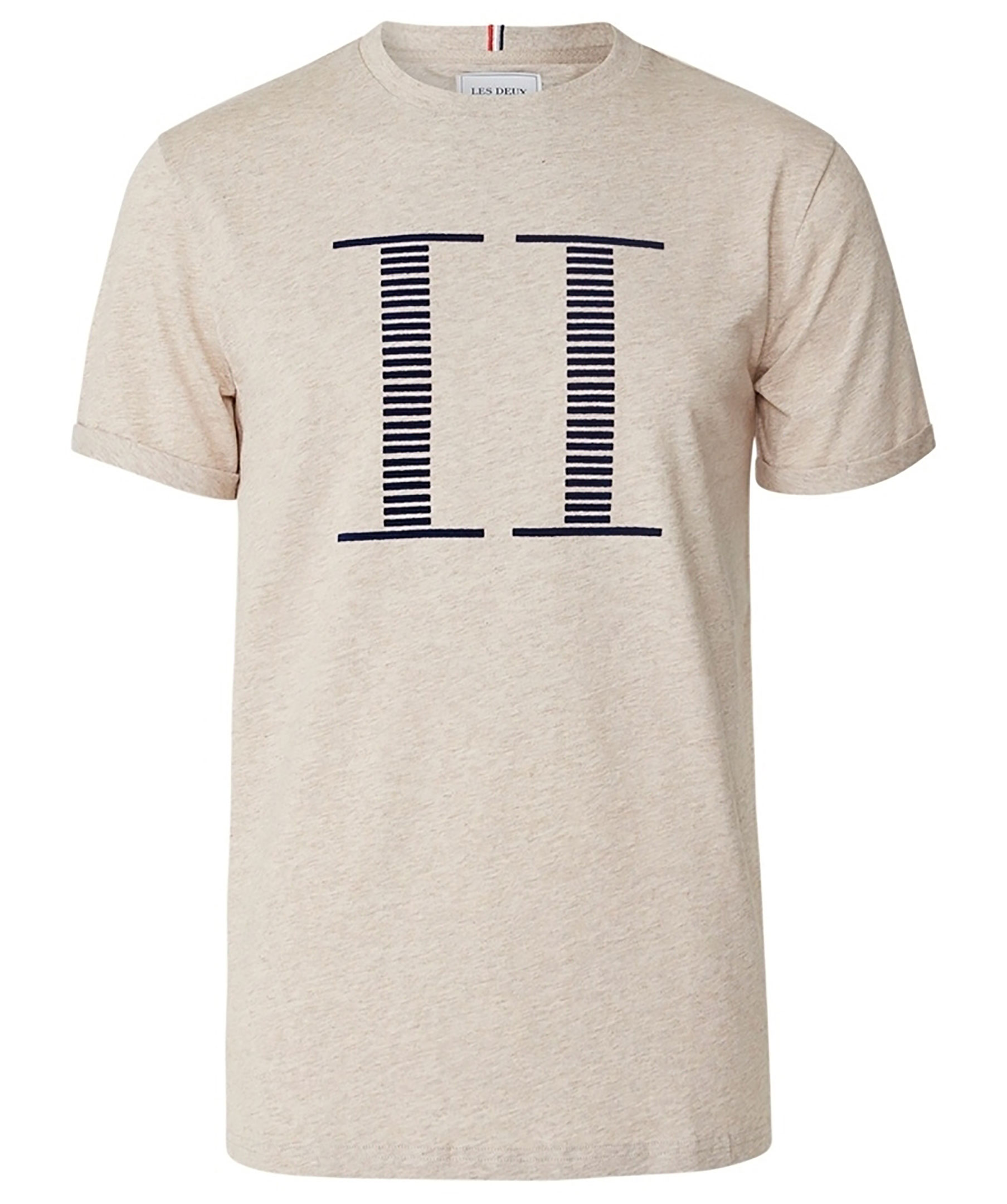 Beige t-shirt från Les Deux. Tröjan är tillvekad i 100% bomull, har uppkavlade ärmar, stor logotyp på bröstet i blått sammetstyg.