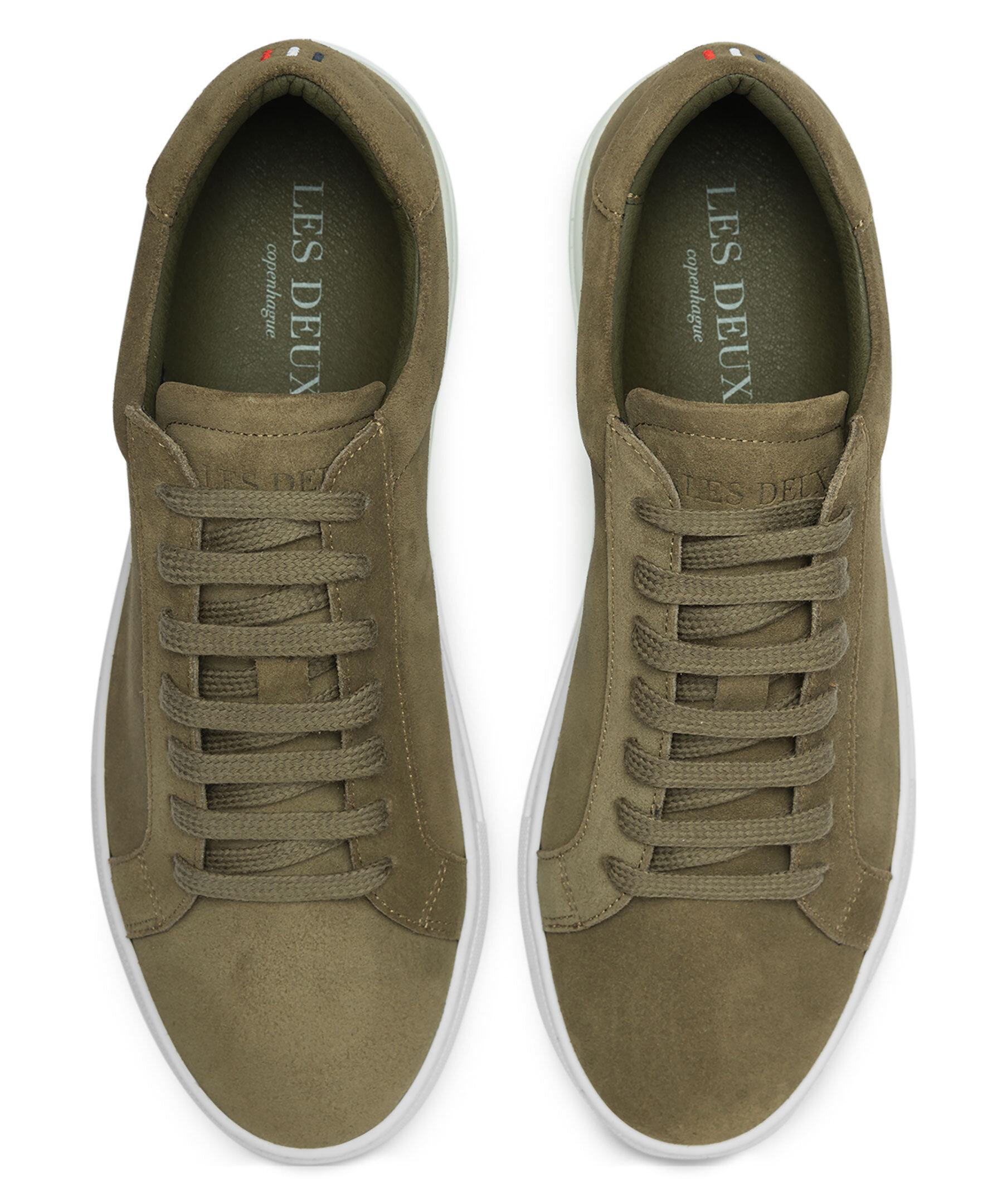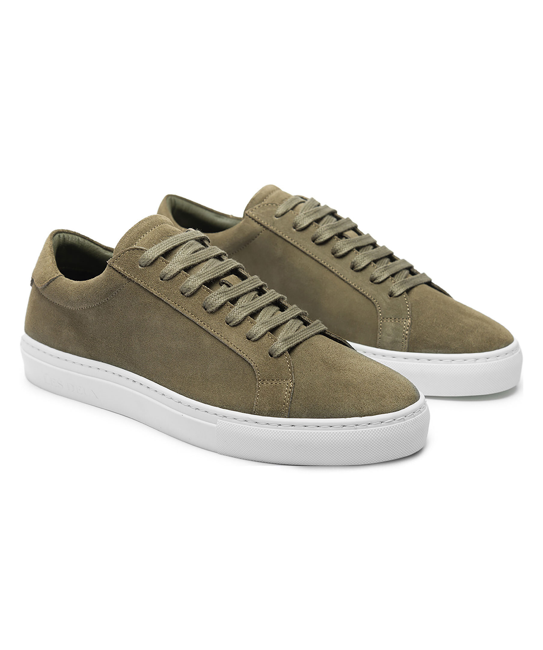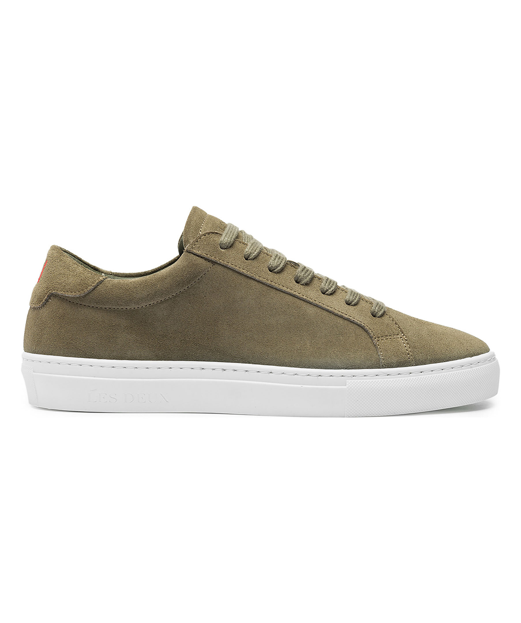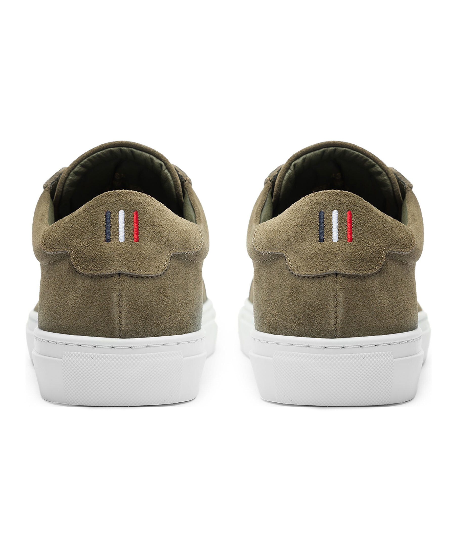 Olivgröna skor från Les Deux. Precis som den ursprungliga läderversionen är den här mockautgåvan av de enkla Theodor-sneakersen bekväma och mångsidiga lågskor. De passar till allt tack vare den klassiska vita sulan och den enfärgade överdelen, och är handgjorda i Portugal av A-klassig mocka. Skorna har Tricolore-broderi på vristen och märkestext på tungan.