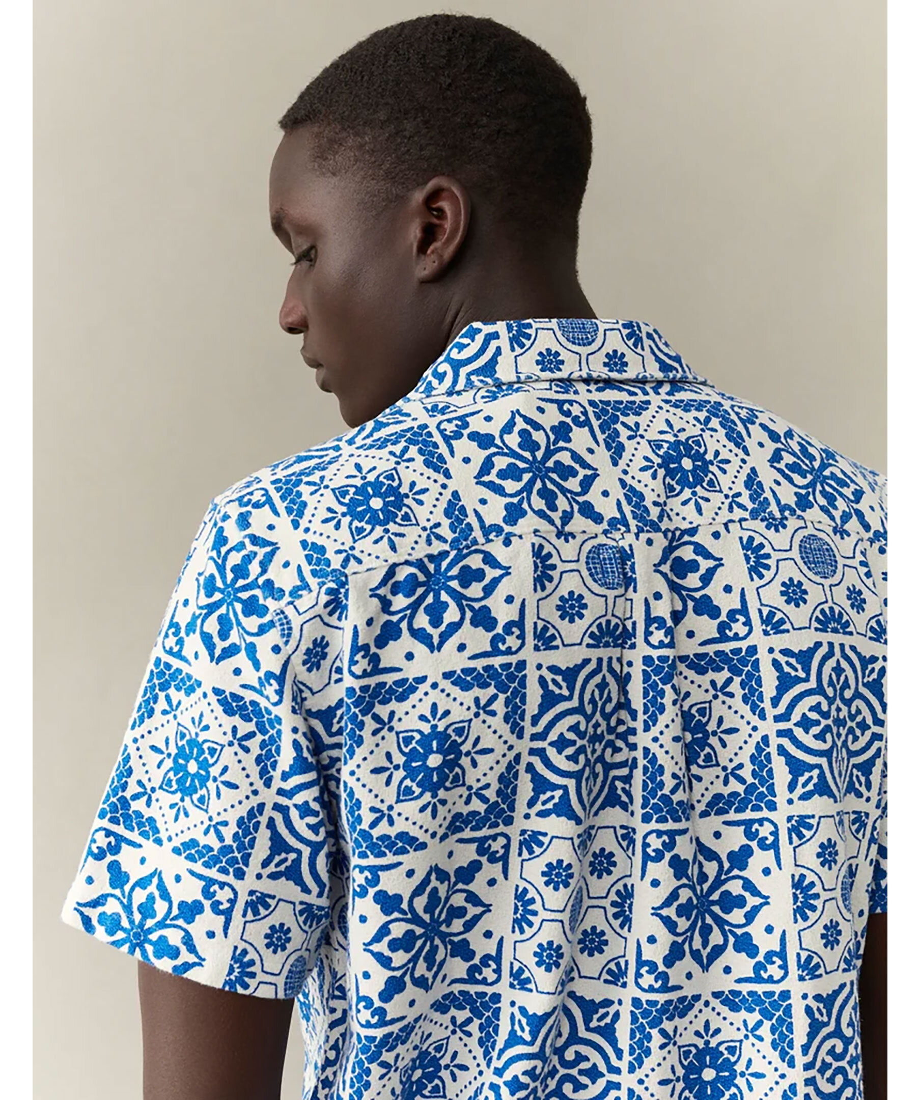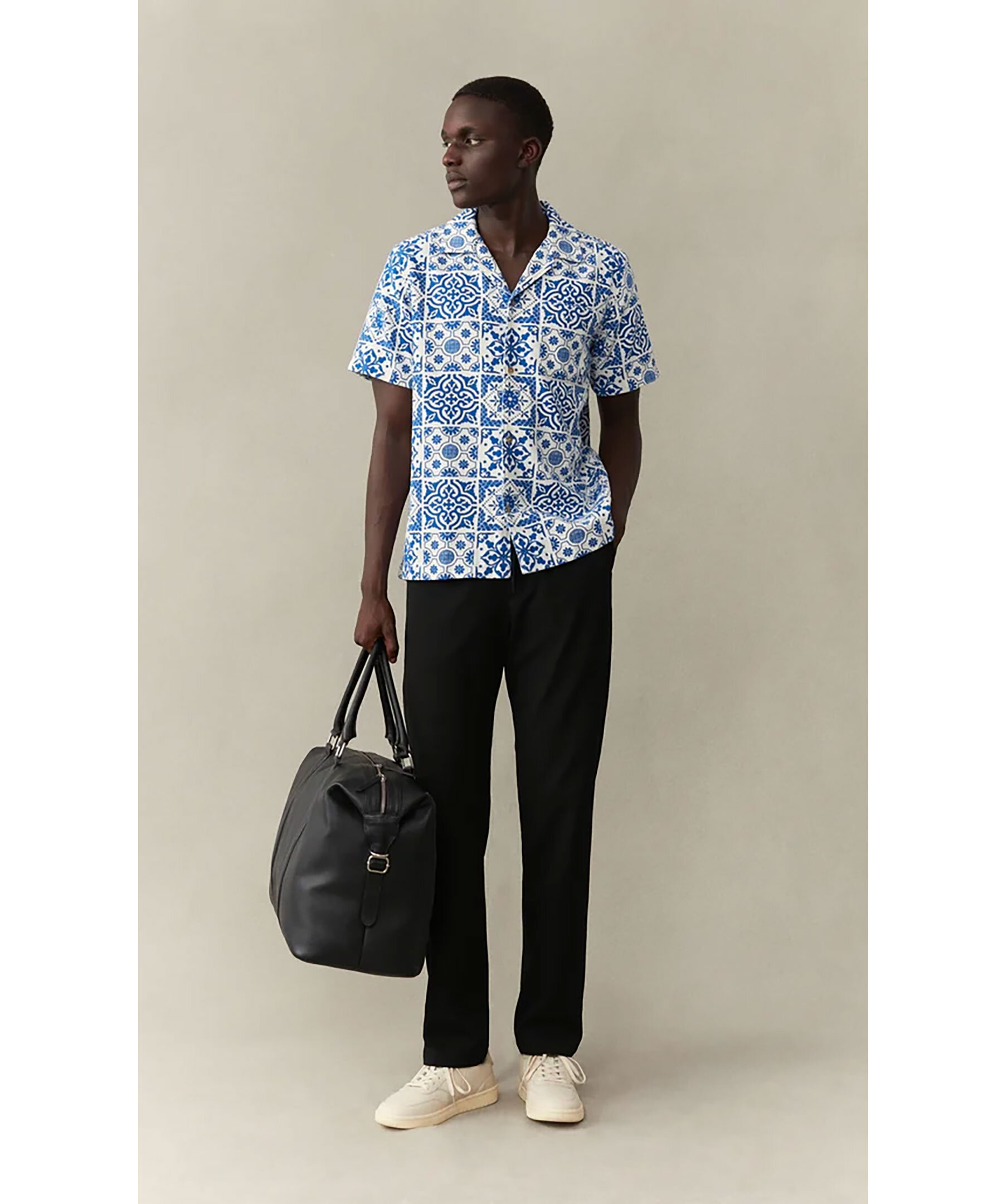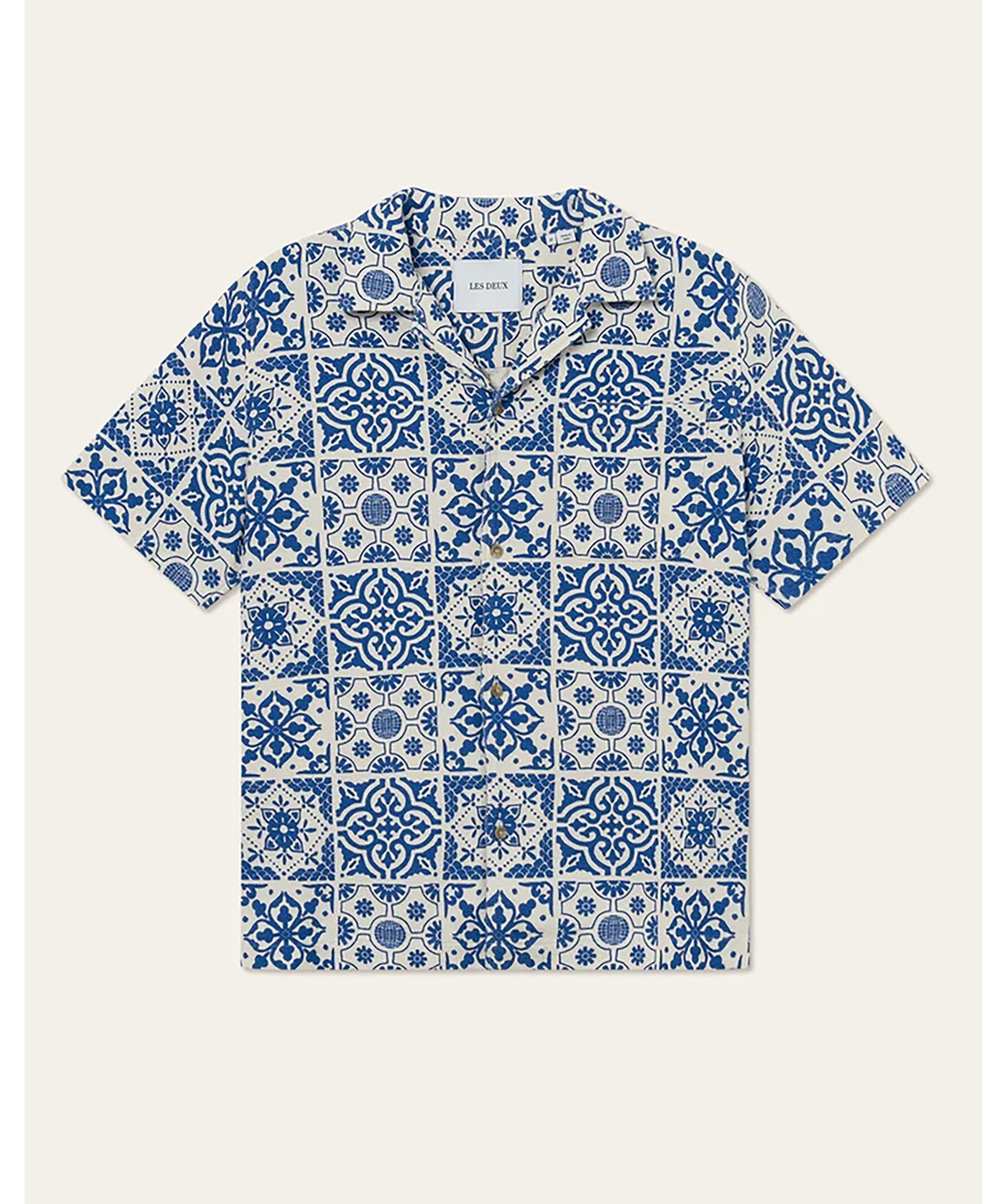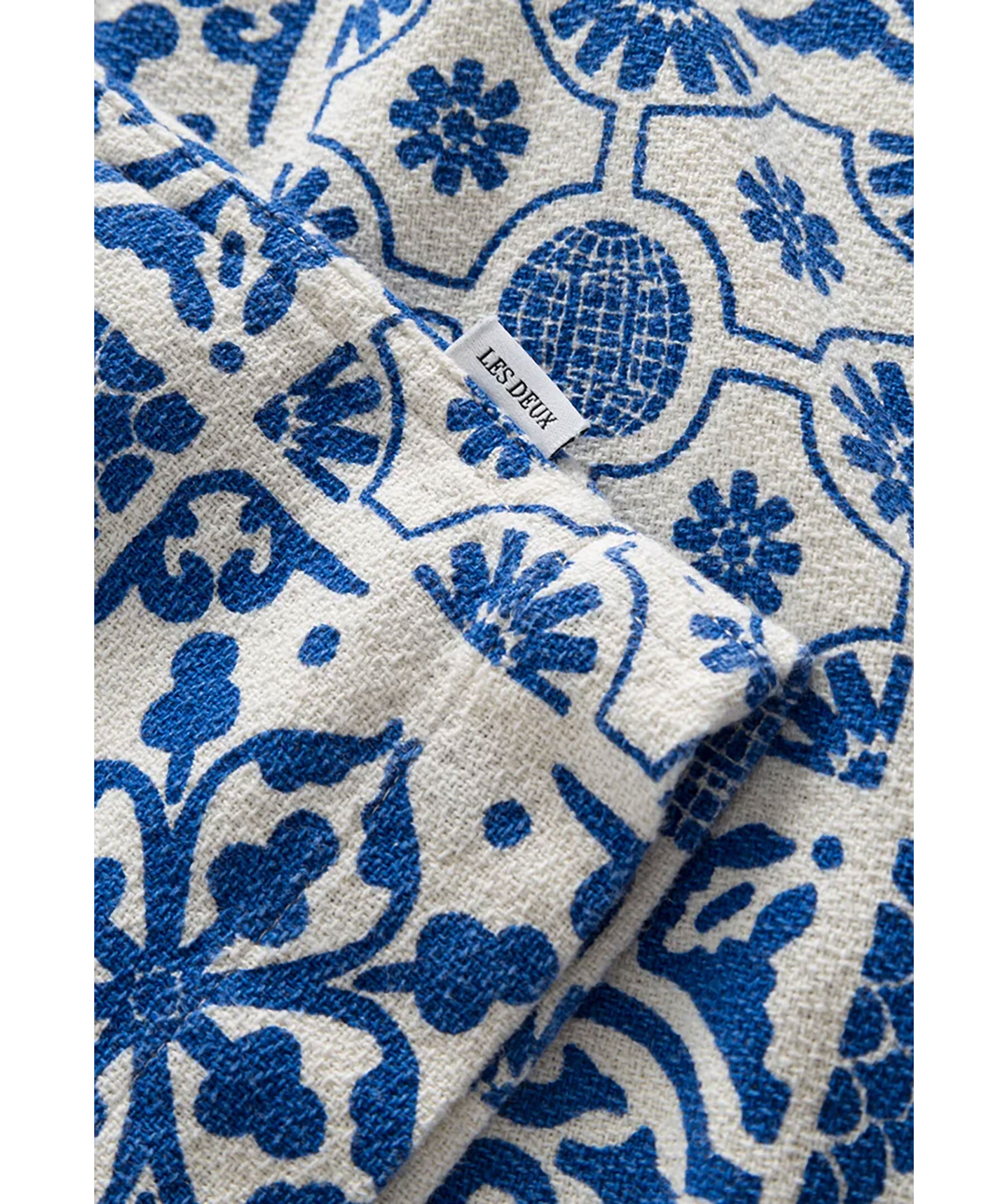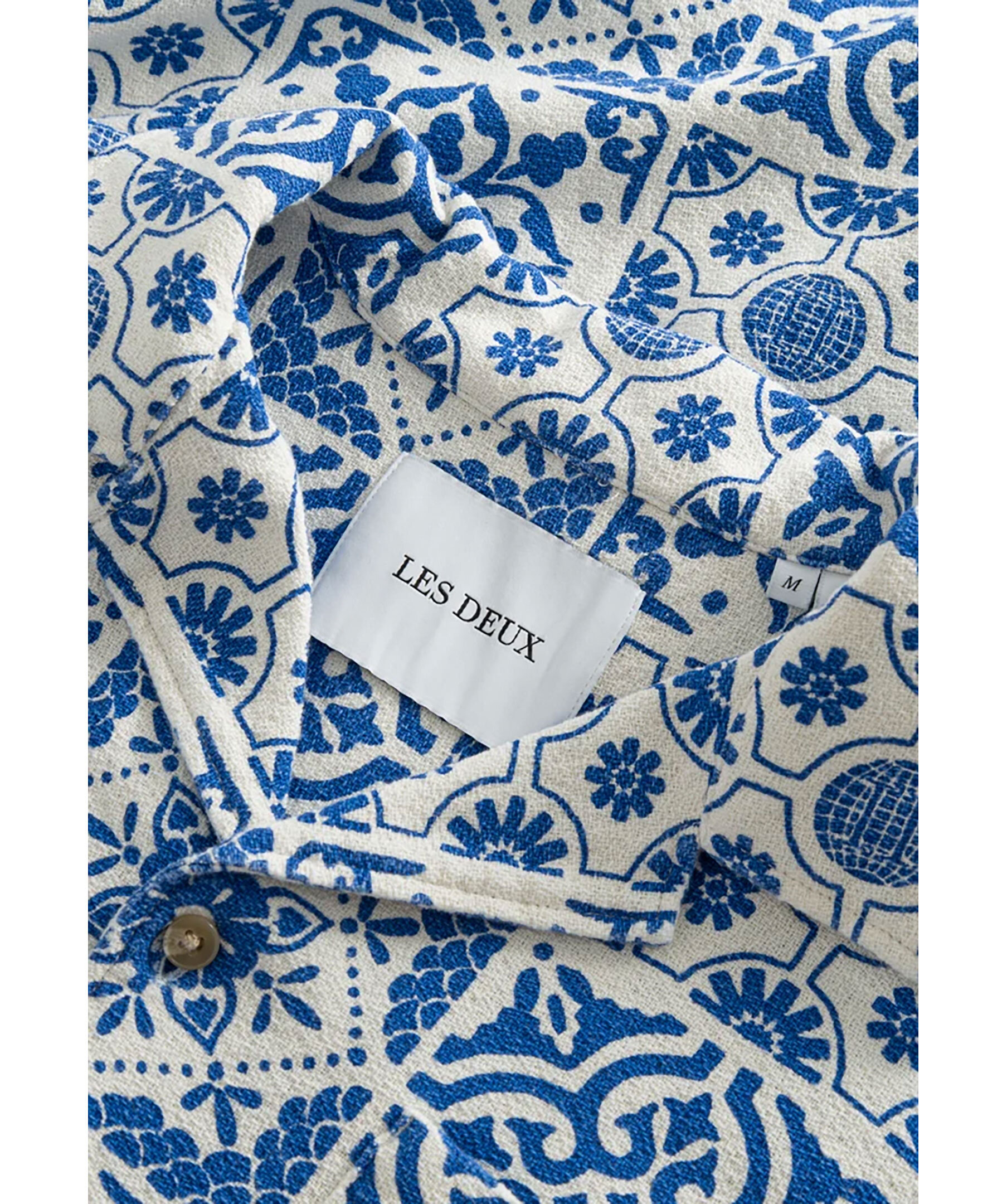 Blå och vit mönstrad kortärmad skjorta från Les Deux. Stängs framtill med knappar. Bowlingkrage. Lapp med liten logotyp på vänster sida av skjortan. Tillverkat i 100% bomullstyg med struktur.
