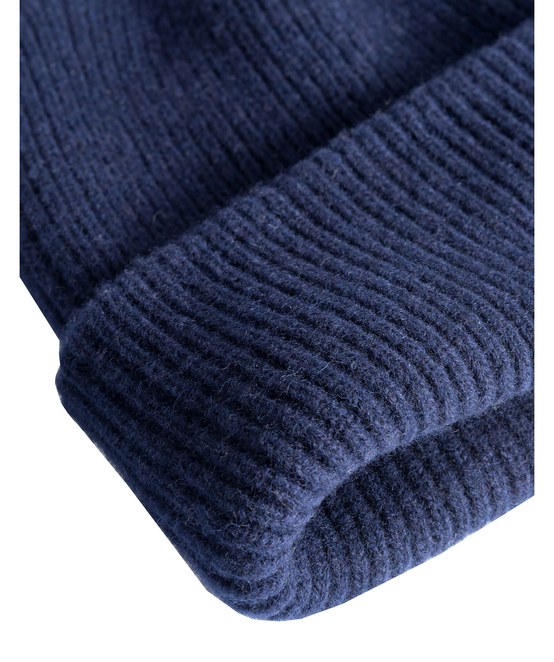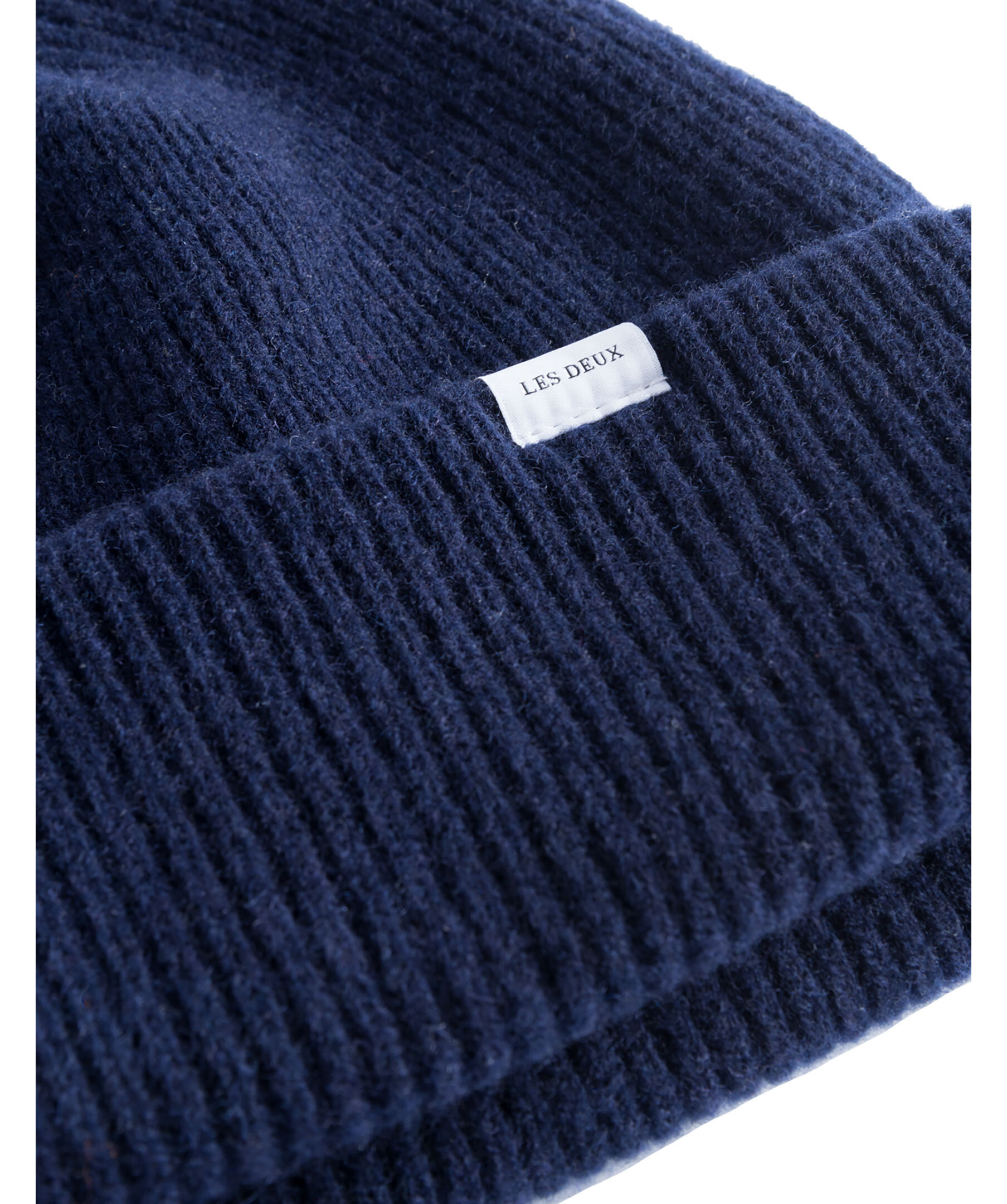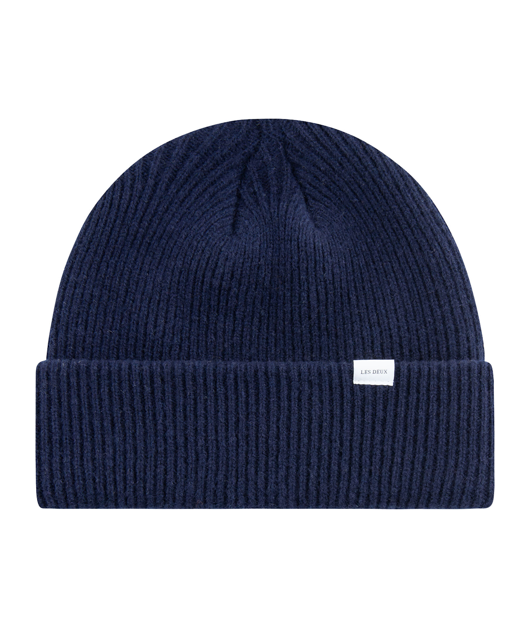 Marinblå ribbstickad mössa i Ull från Les Deux. Uppvikt kant med liten logotyp.