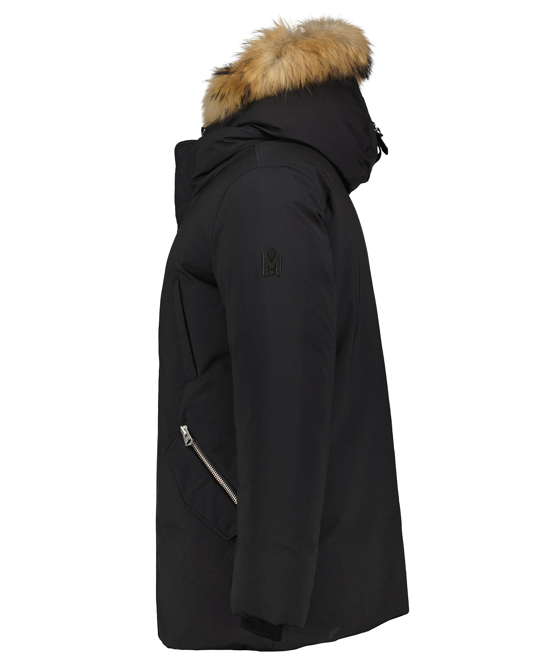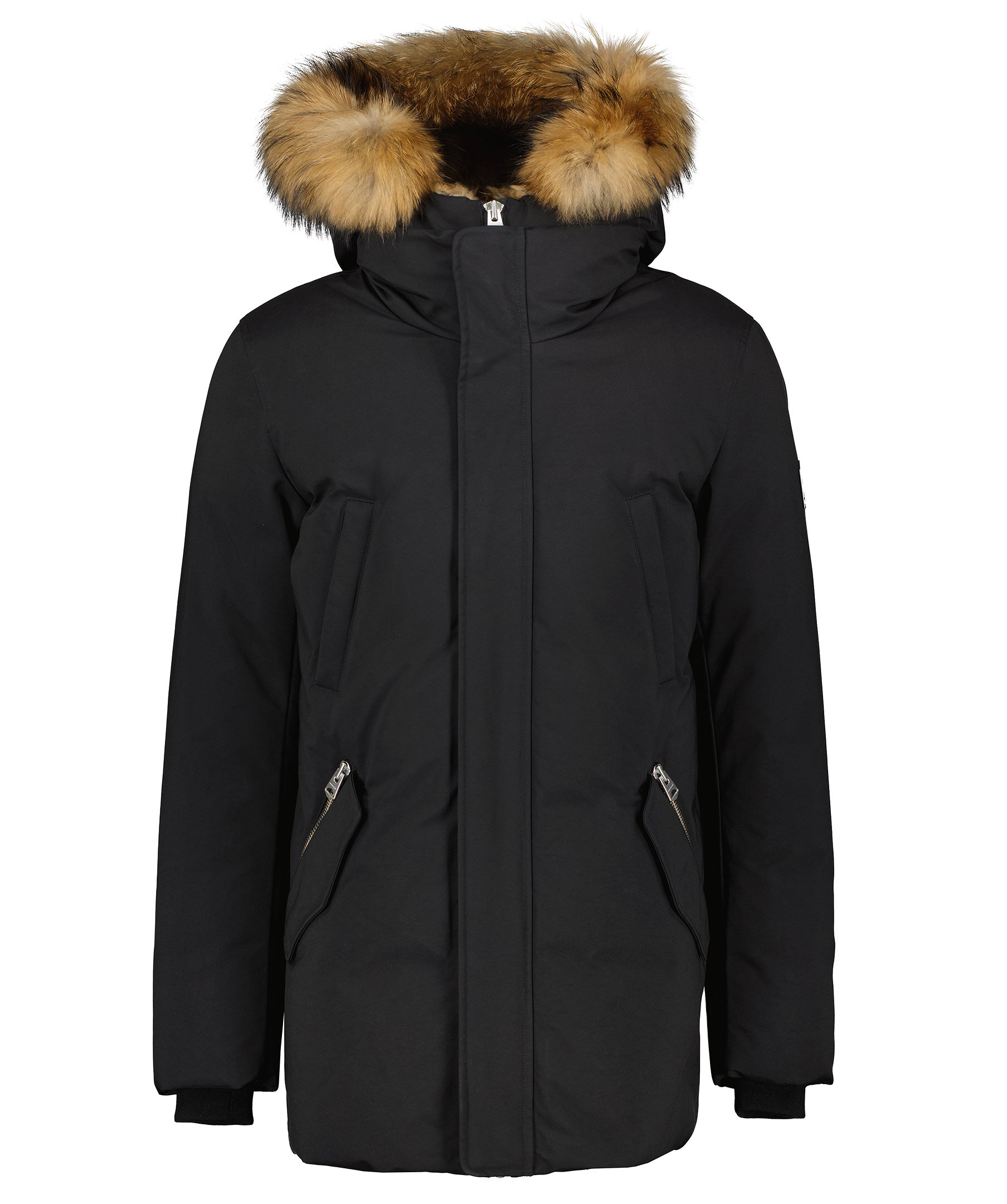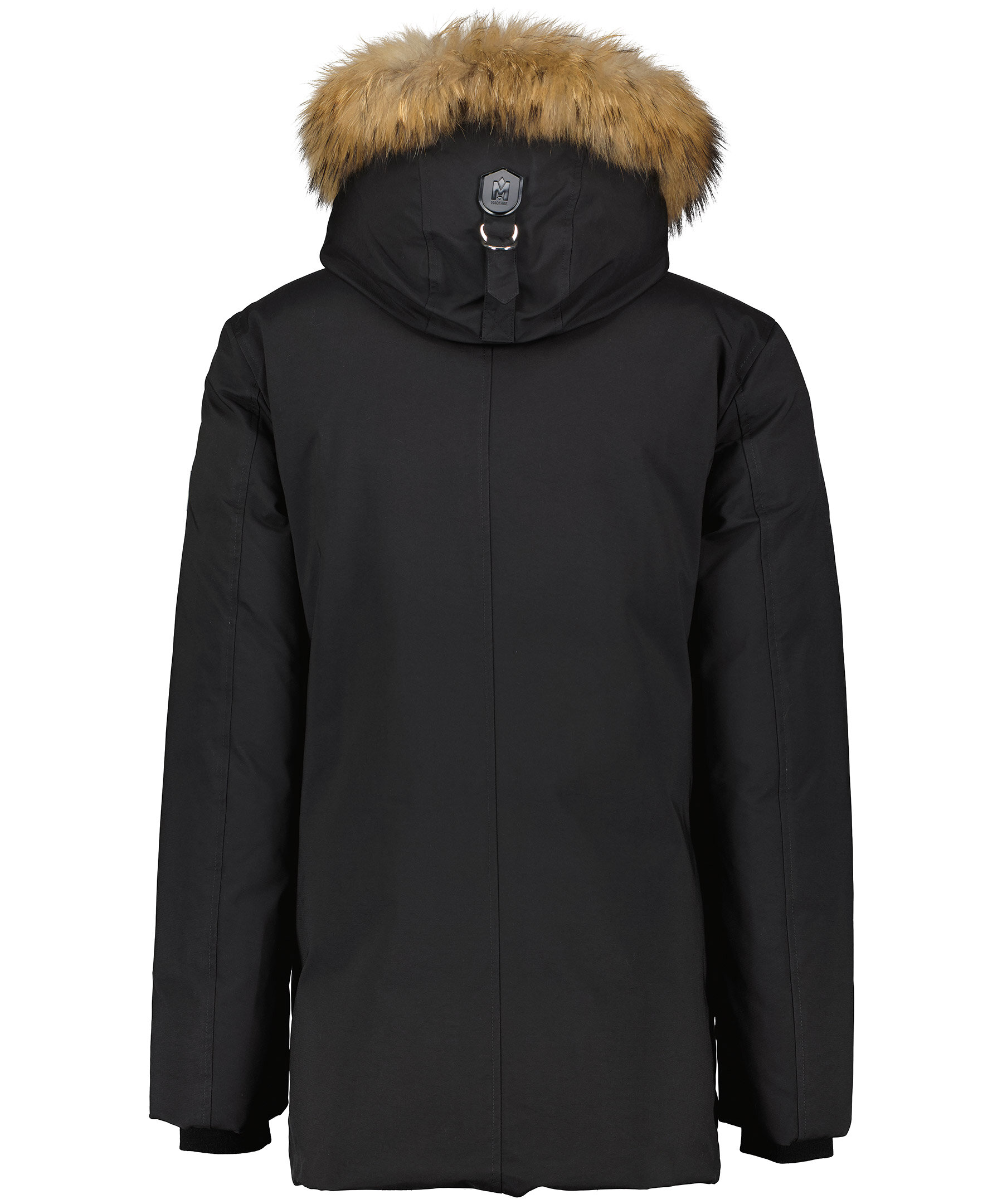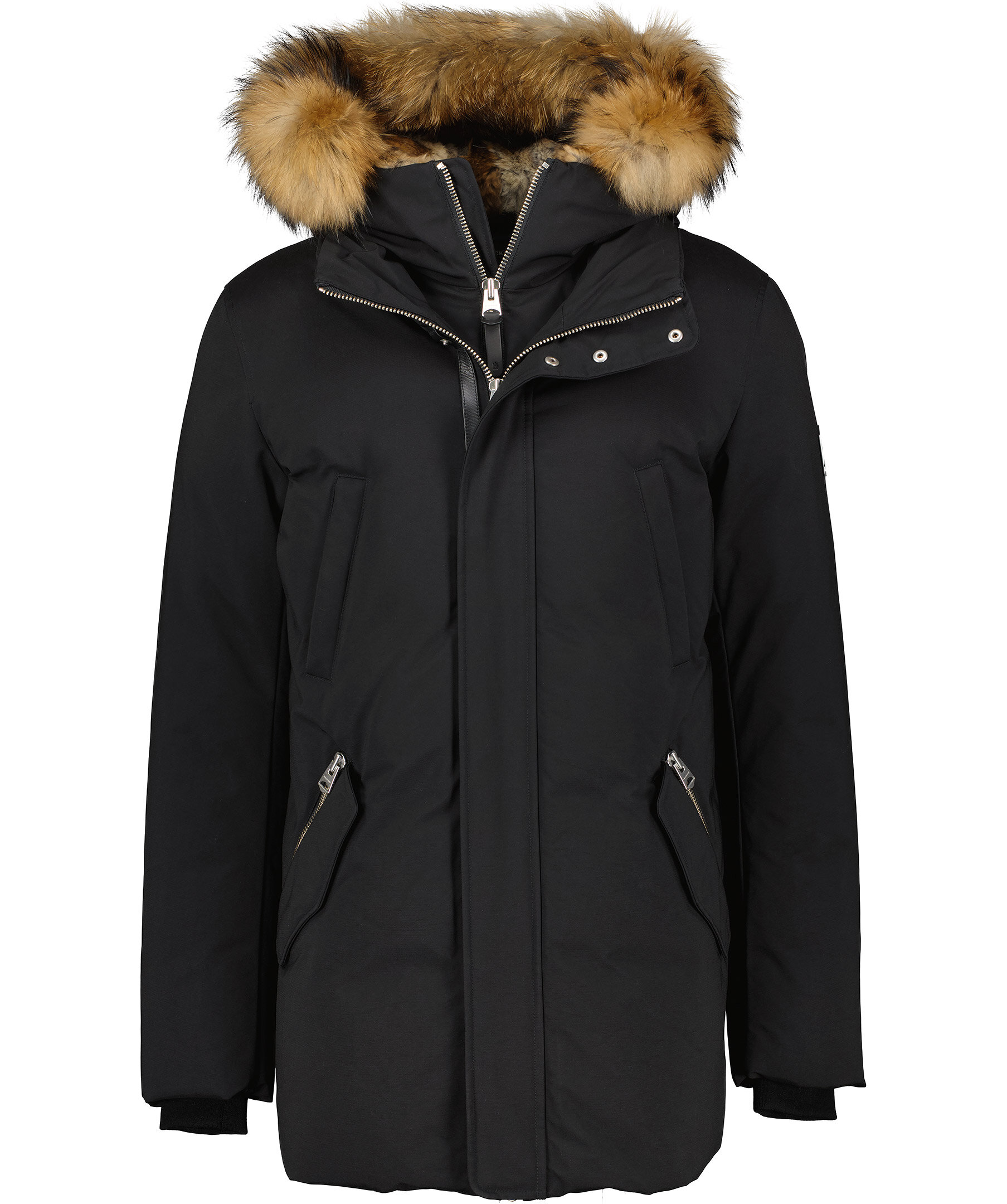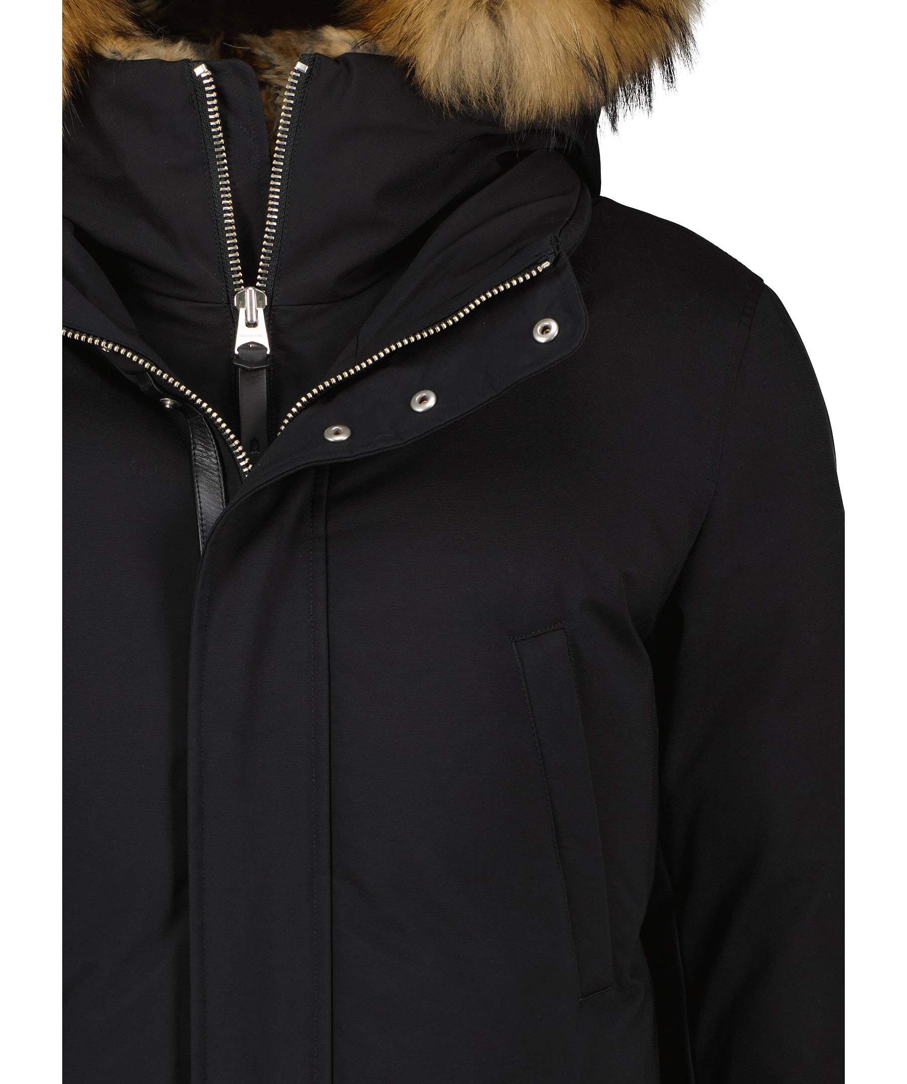 Svart dunjacka från Mackage med dubbla dragkedjor i höftlängd. Jackan har en kaninfodrad luva med pälskant som är avtagbar. Två snedställda frontfickor framtill samt två snedställa bröstfickor med fleecefoder. Två innerfickor med dragkedja samt värmande mudd i slutet av ärmar.