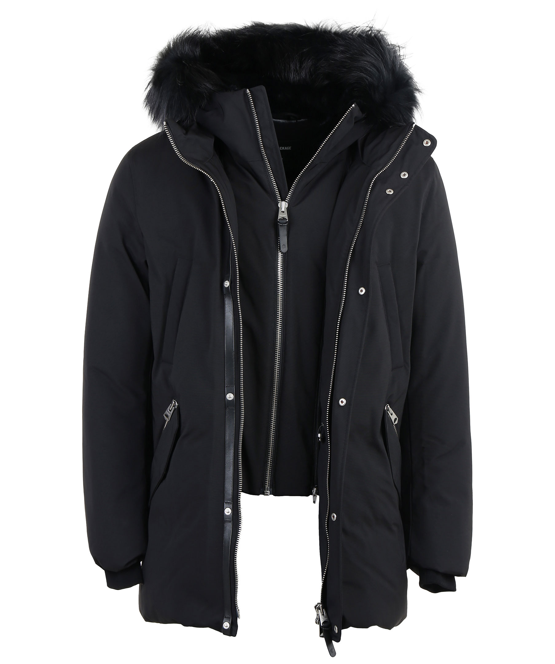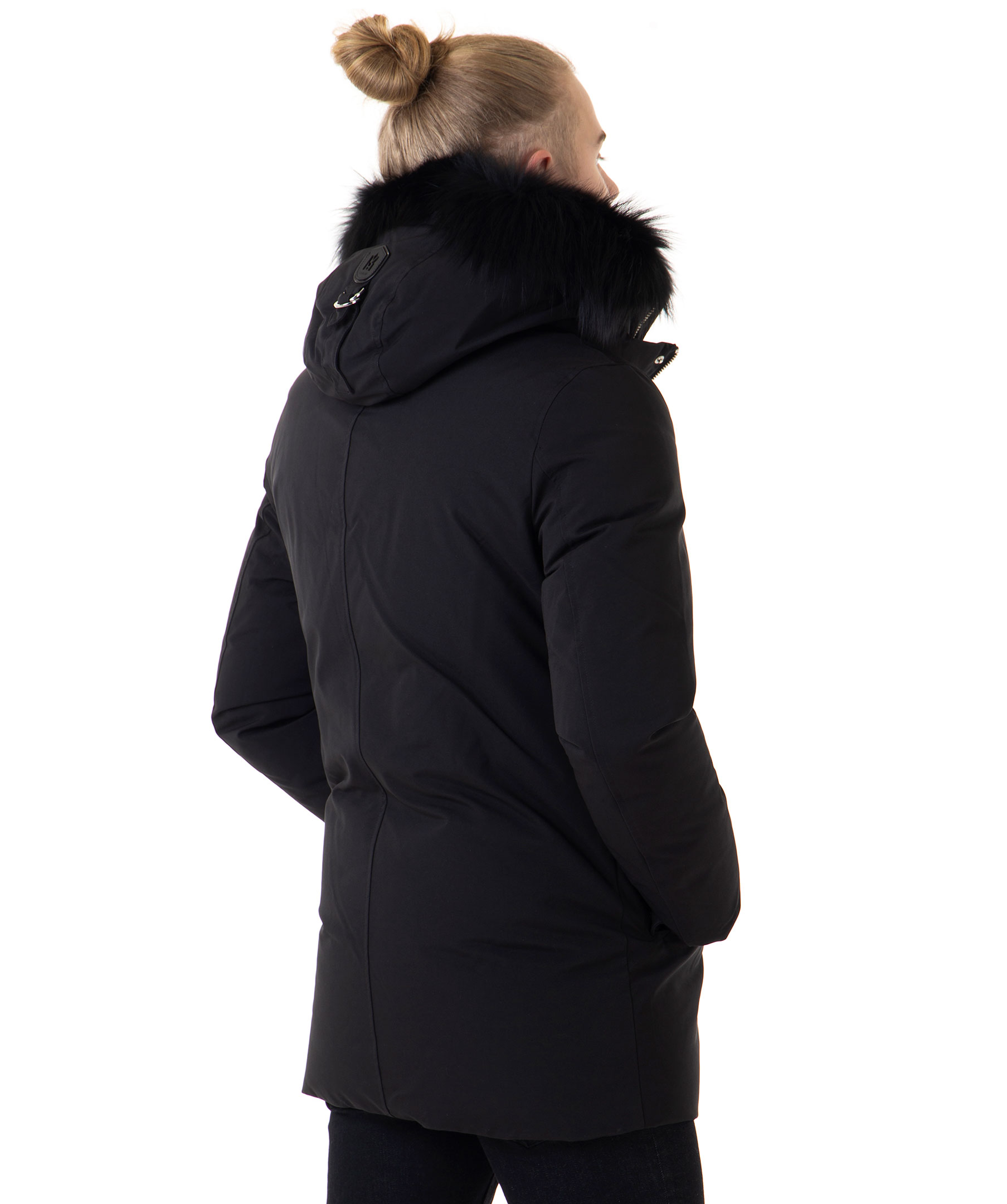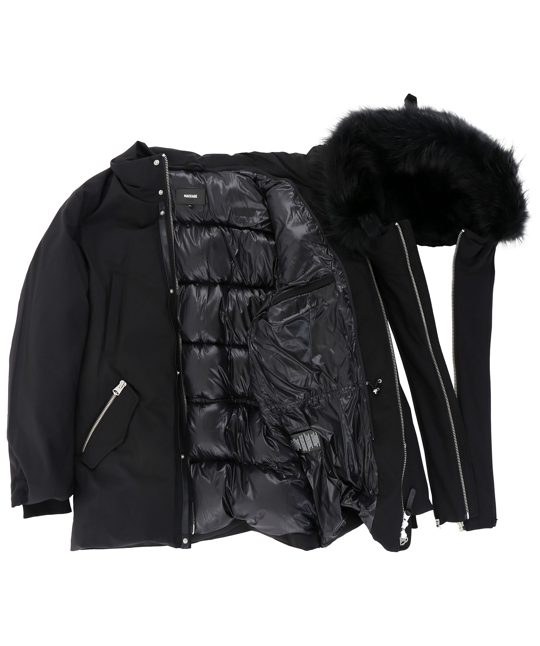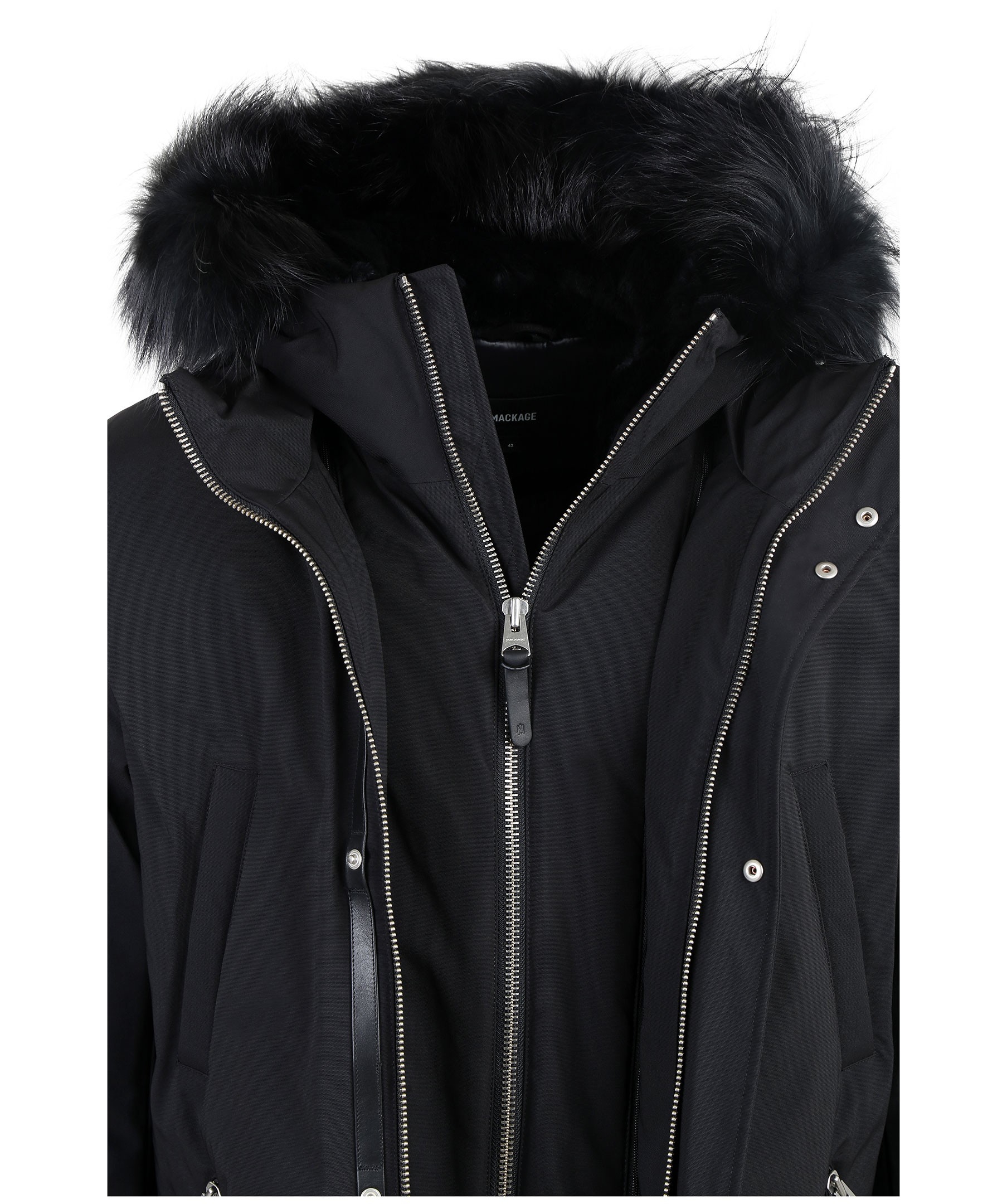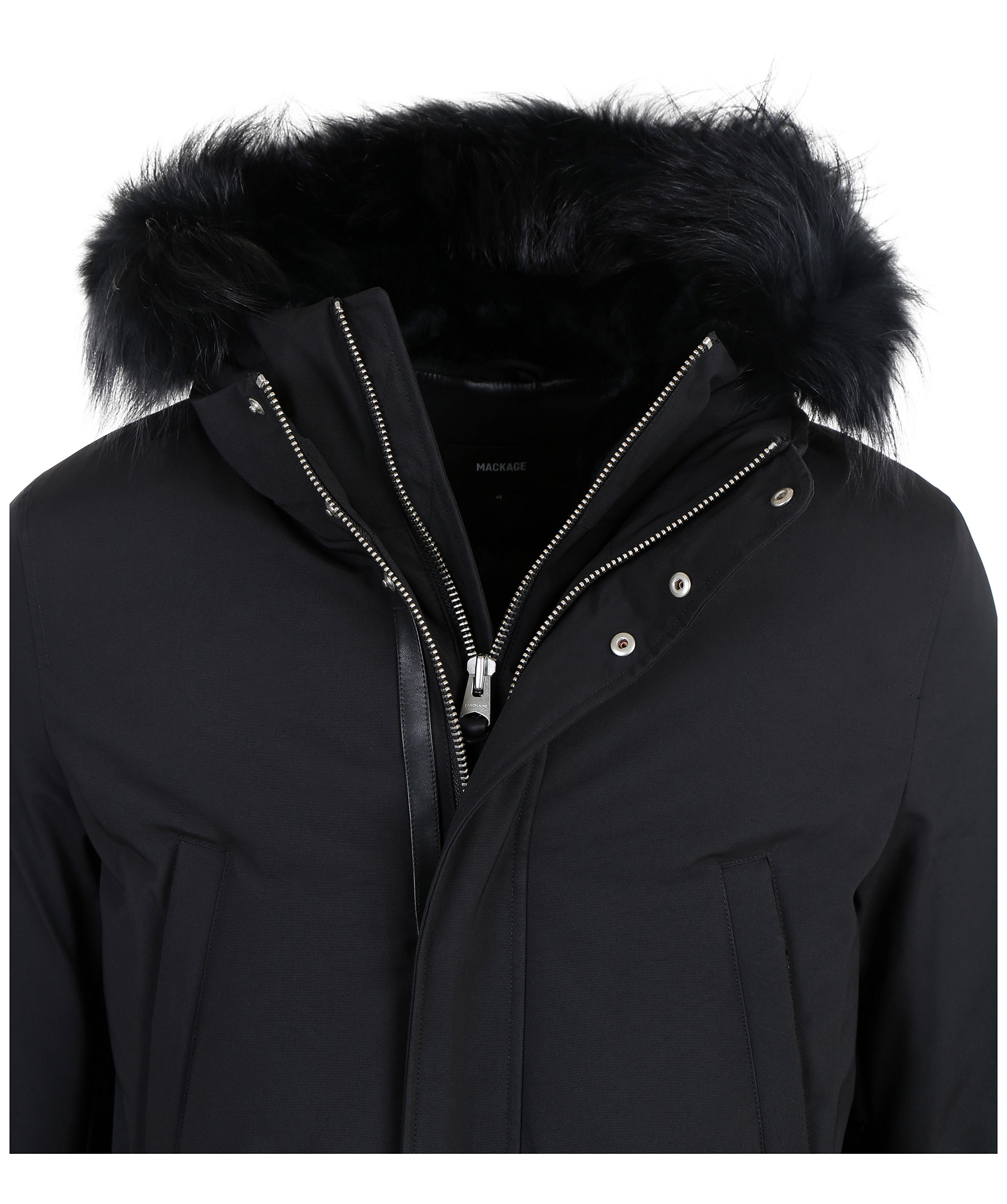 Edward XR från Mackage är en lyxig dunjacka med dubbla dragkedjor i höftlängd. Jackan har en svart naturpälsfodrad luva med svart naturpälskant som är avtagbar. Två snedställda frontfickor framtill samt två snedställa bröstfickor med fleecefoder. Två innerfickor med dragkedja samt värmande mudd i slutet av ärmar. Modellen är 186 cm lång och bär storlek 48.