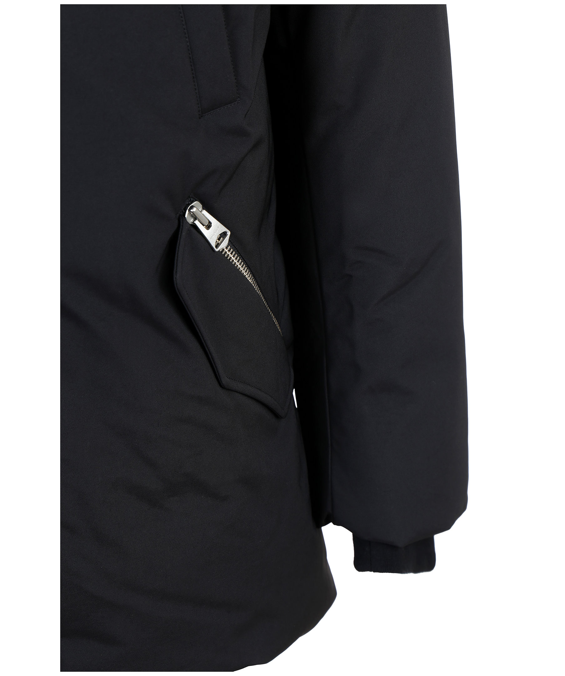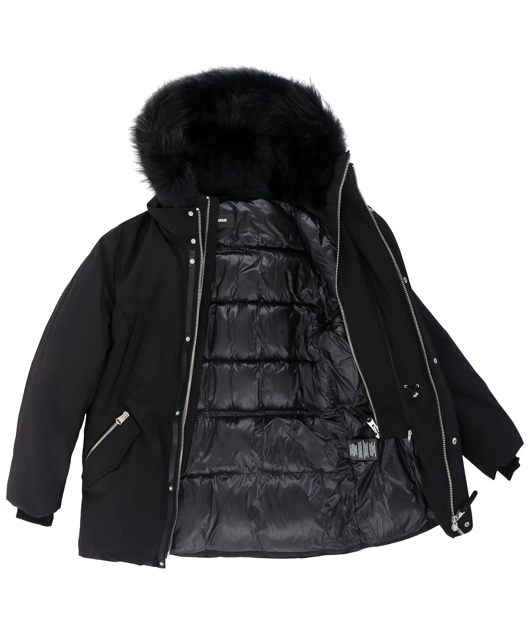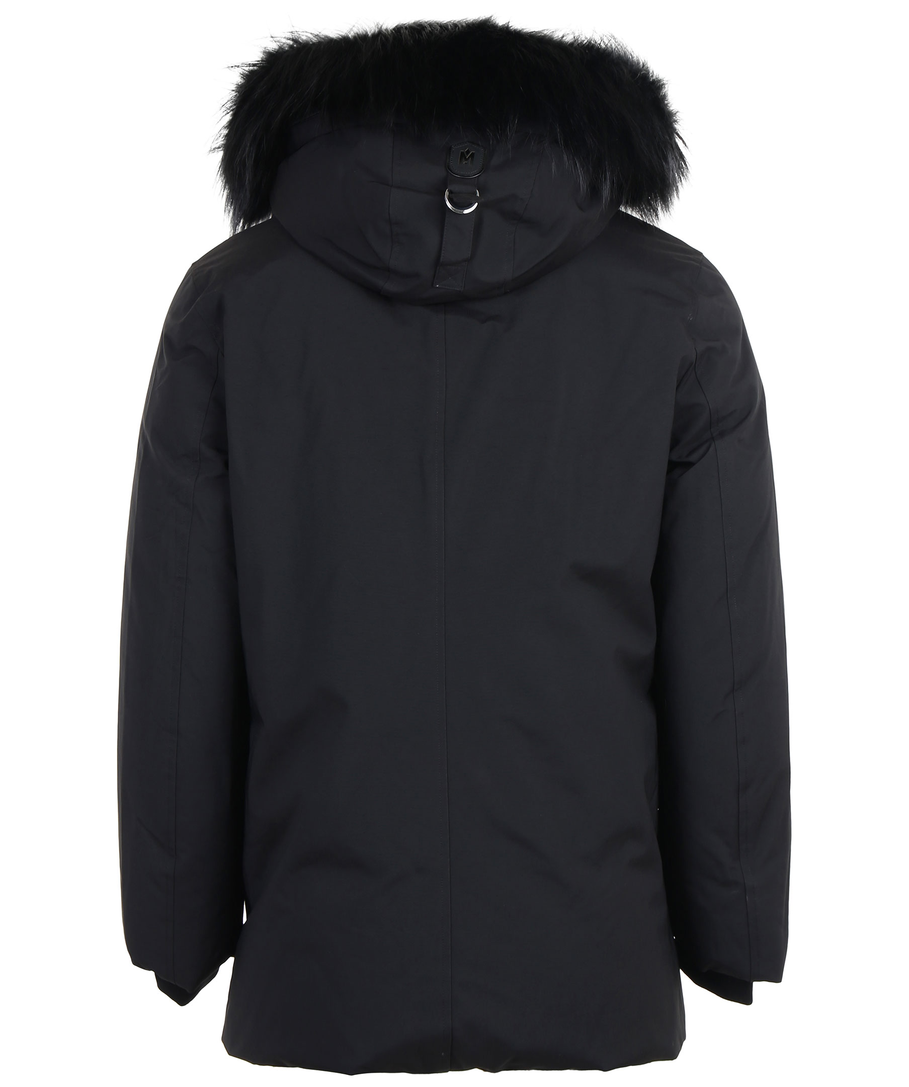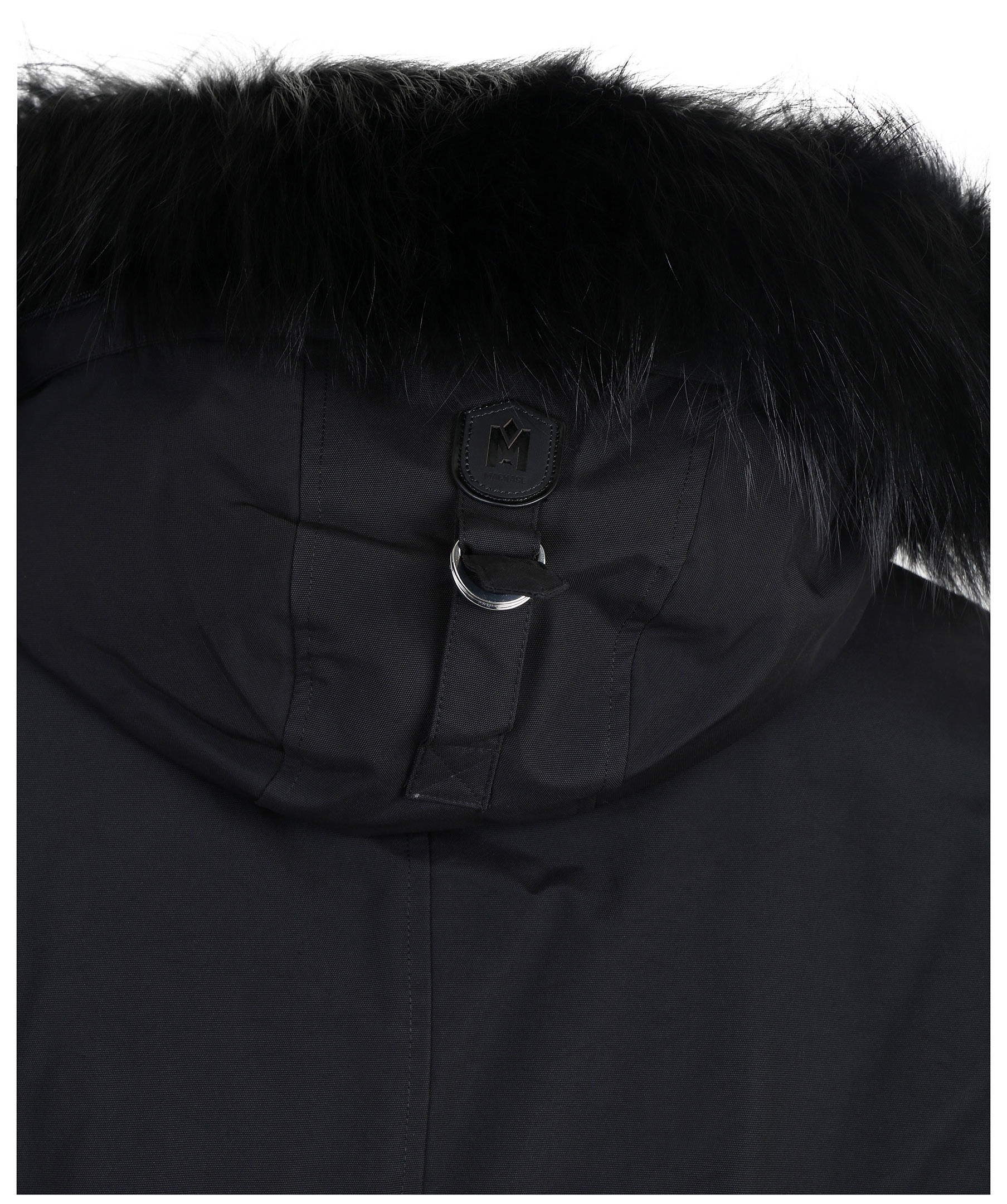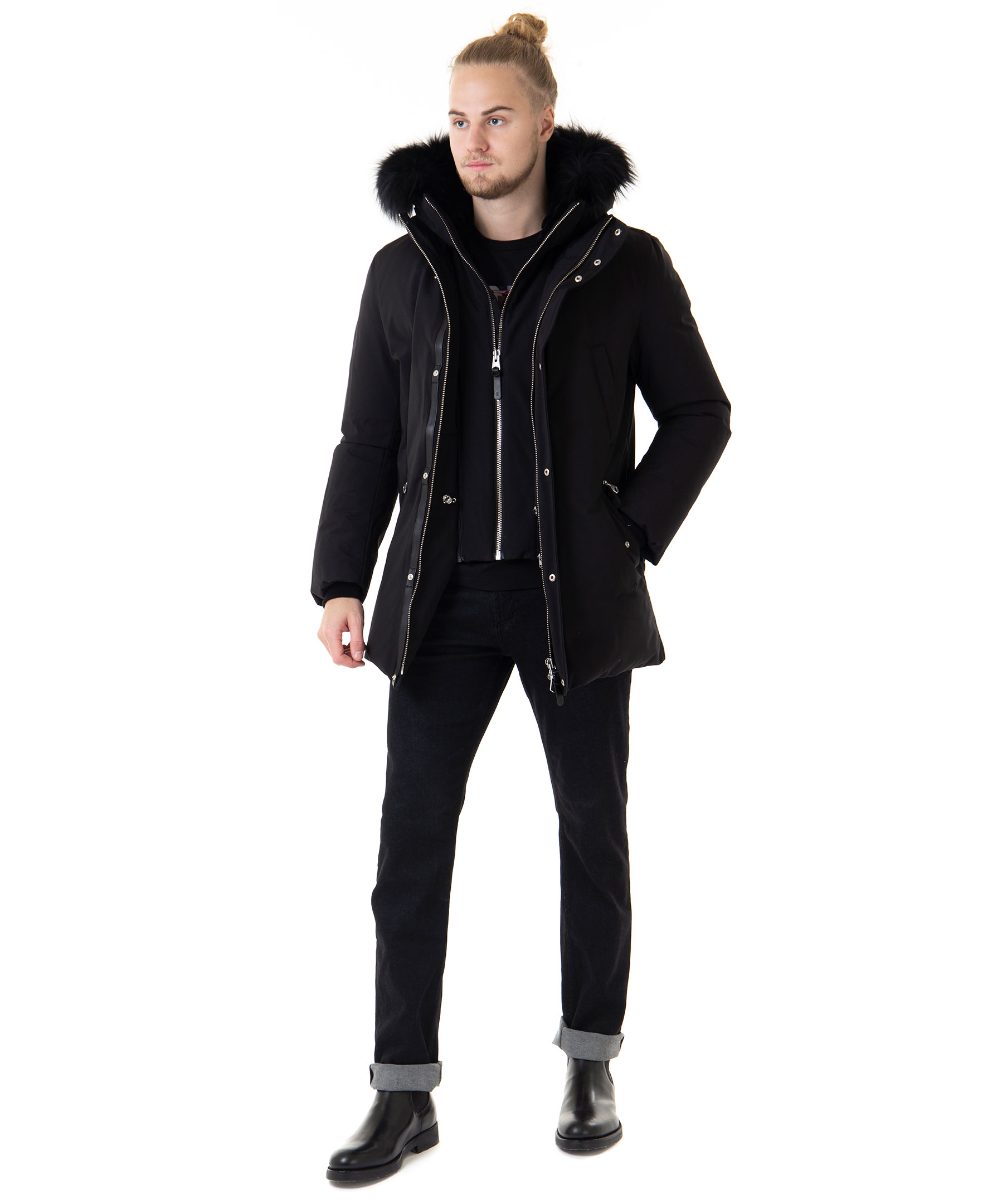 Edward XR från Mackage är en lyxig dunjacka med dubbla dragkedjor i höftlängd. Jackan har en svart naturpälsfodrad luva med svart naturpälskant som är avtagbar. Två snedställda frontfickor framtill samt två snedställa bröstfickor med fleecefoder. Två innerfickor med dragkedja samt värmande mudd i slutet av ärmar. Modellen är 186 cm lång och bär storlek 48.