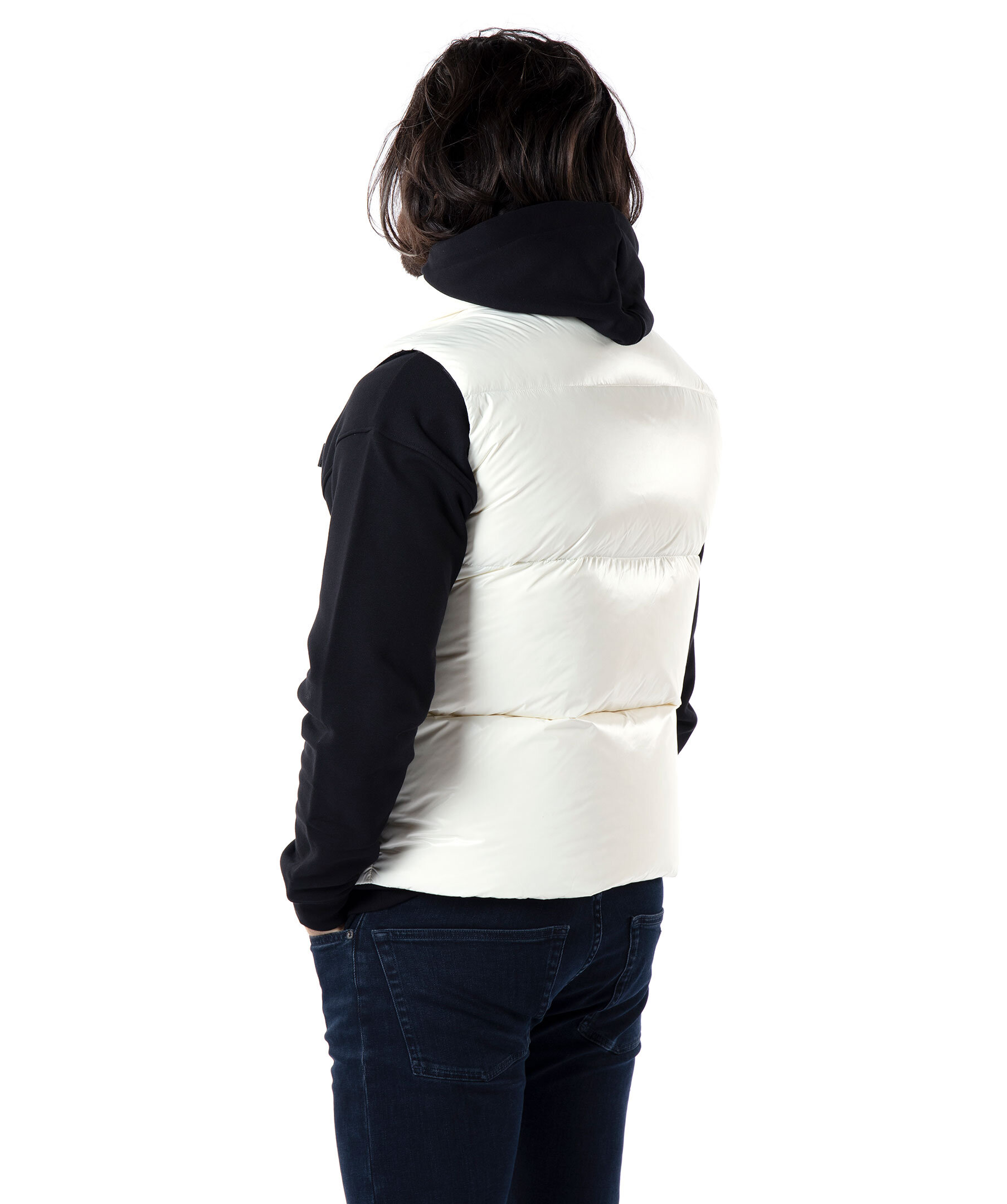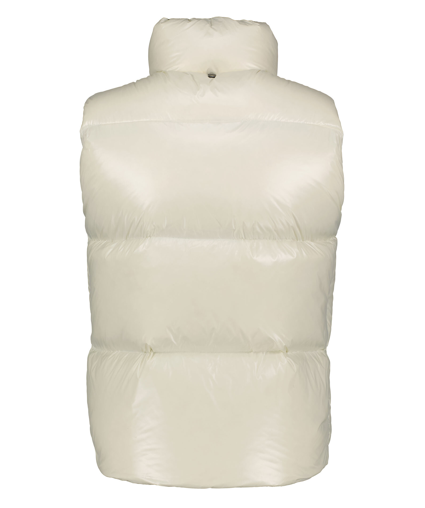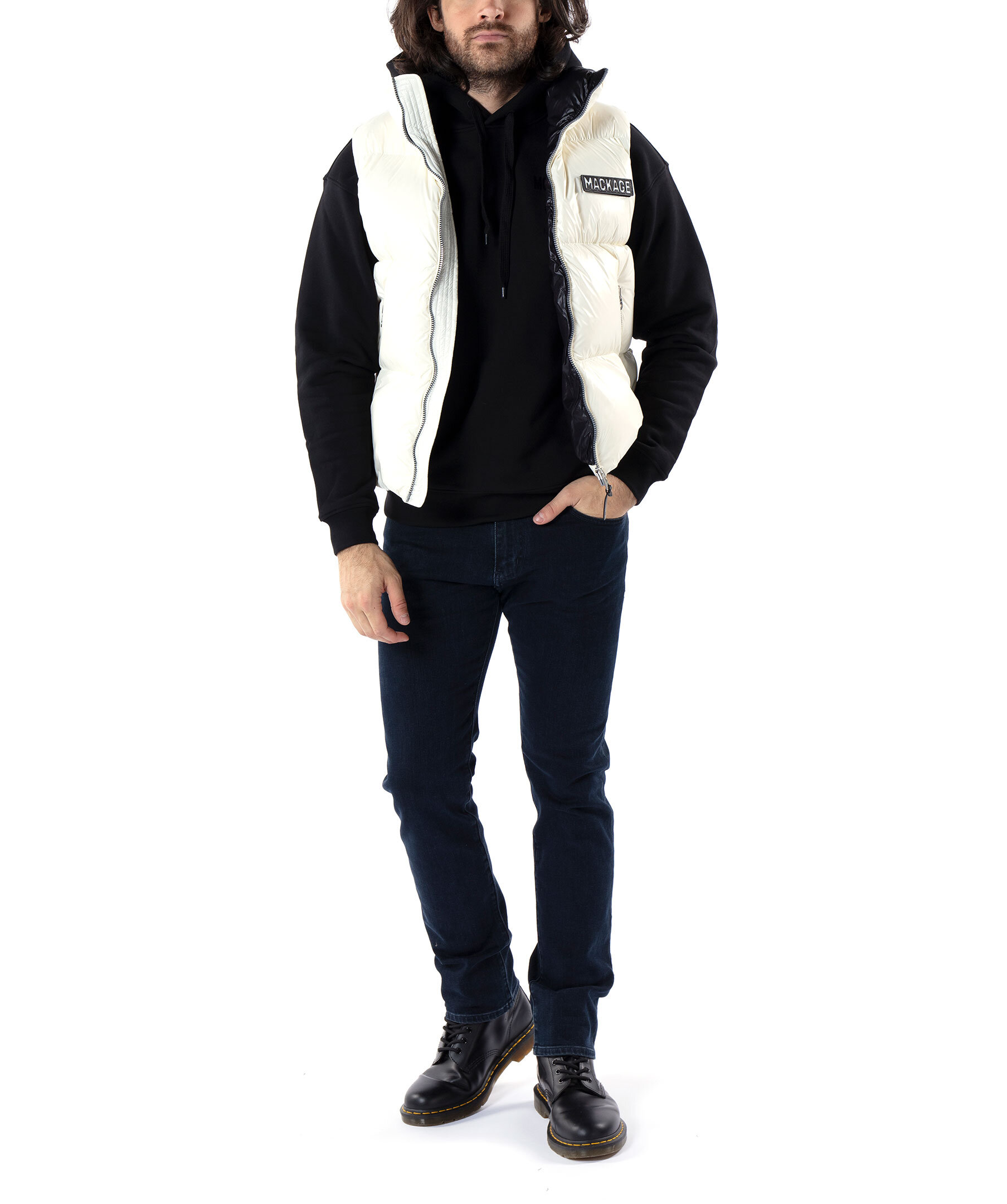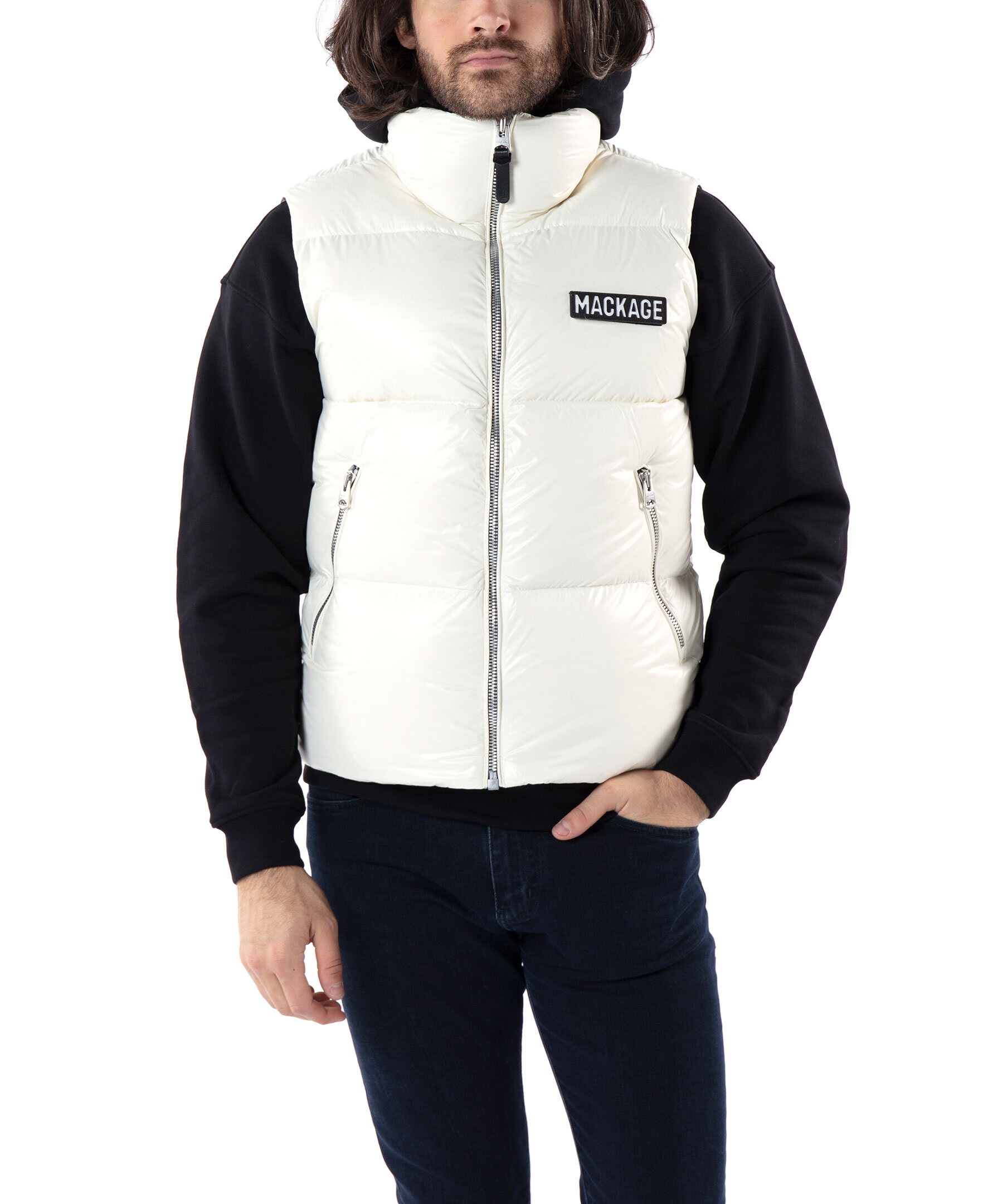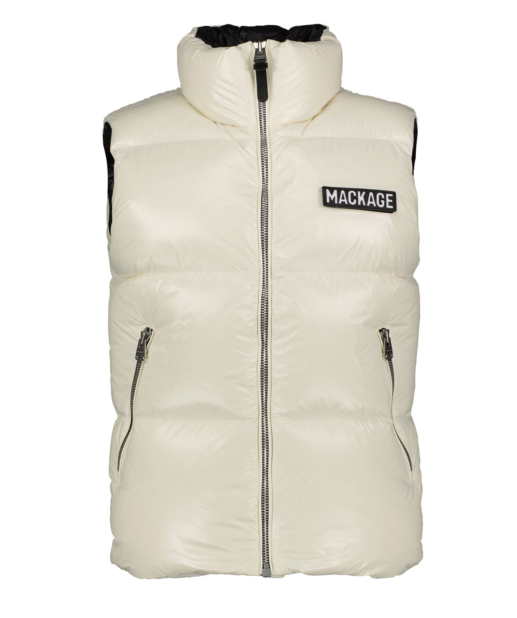 krämvit quiltad dunväst från Mackage i glansigt tyg. Stängs med dragkedja framtill. Två snedställda fickor fram som stängs med dragkedja. Patch med logotyp på vänster bröst. Dragsko i plaggslut. Modellen är 185cm lång och har på sig storlek 48.