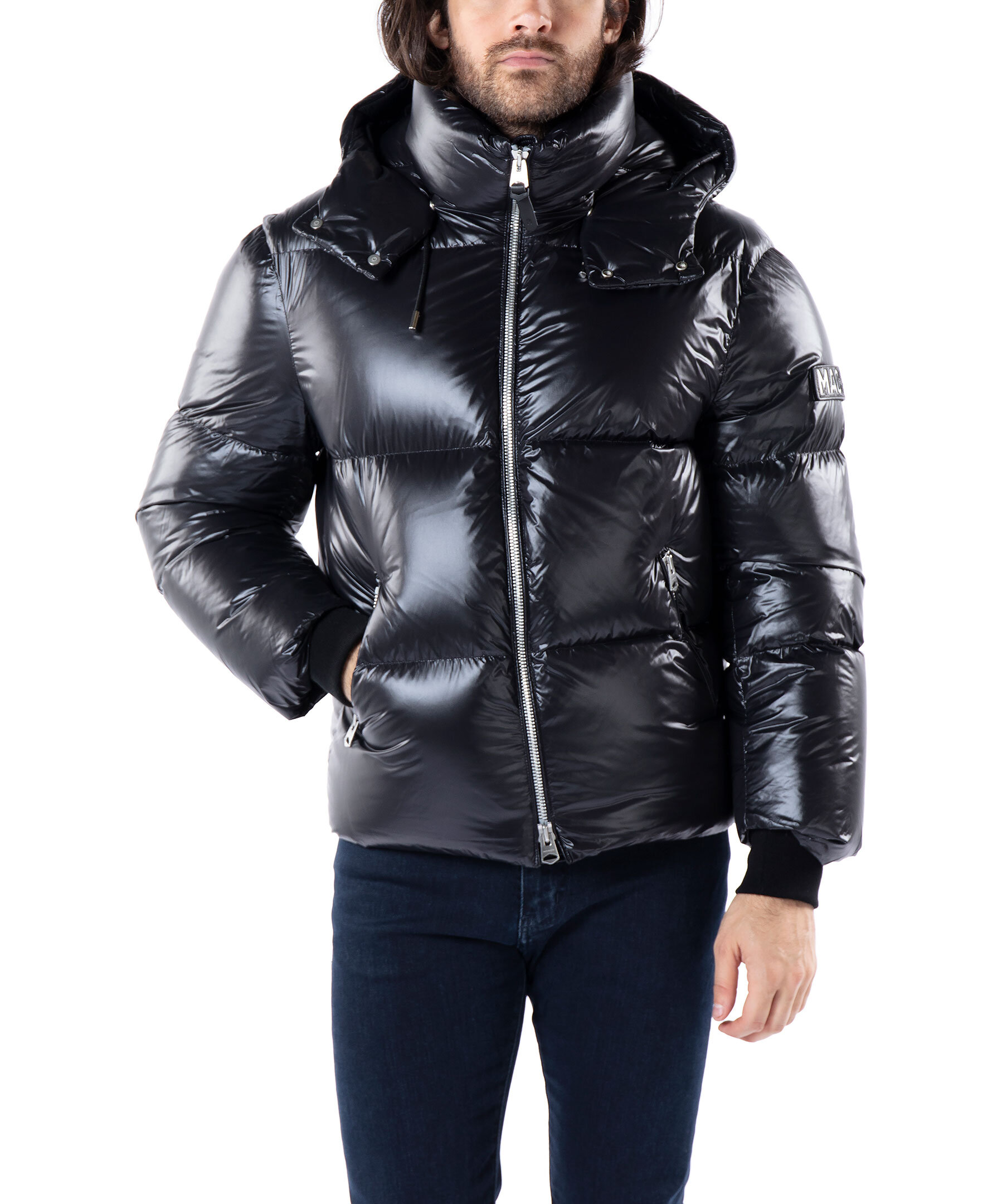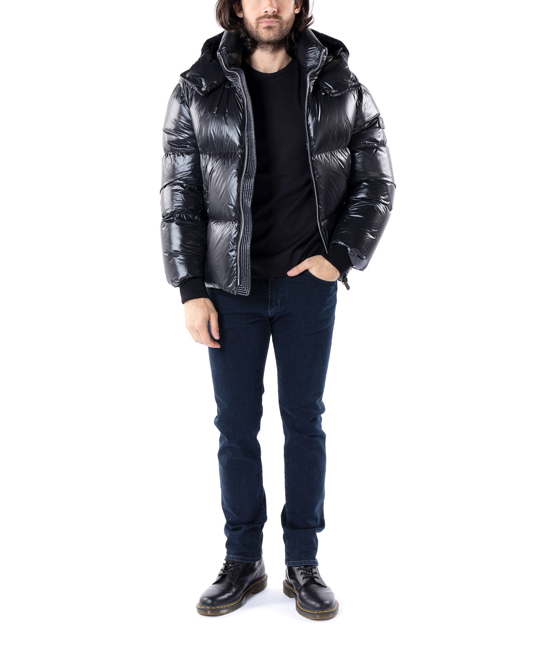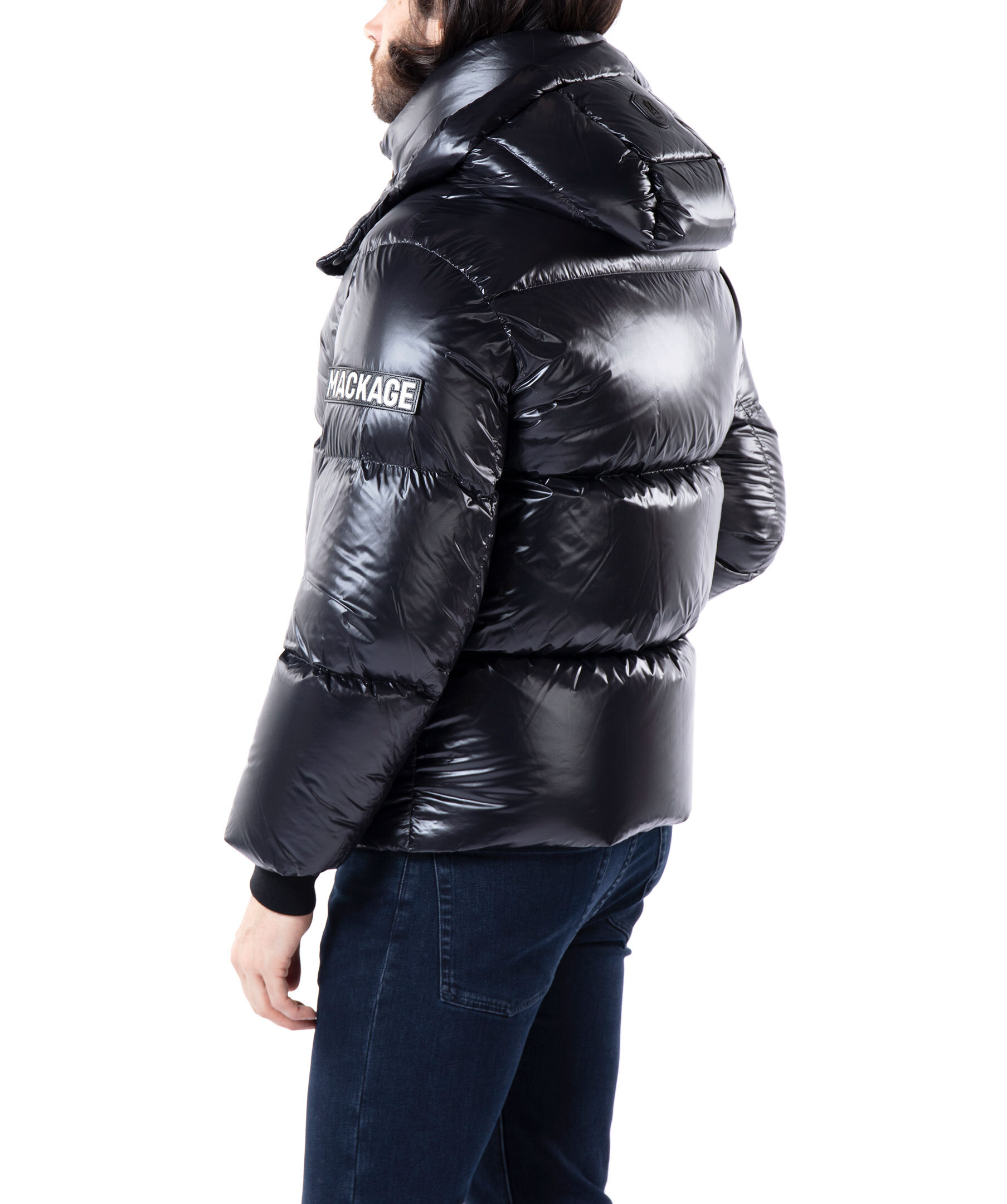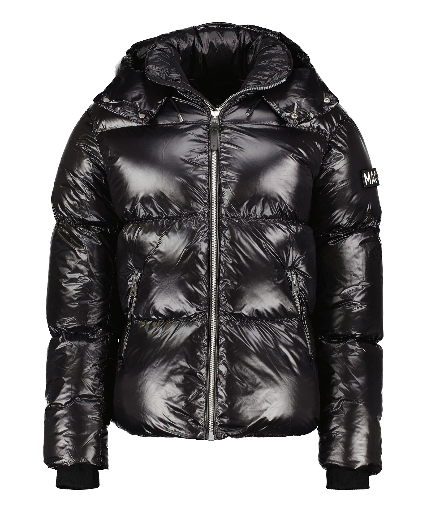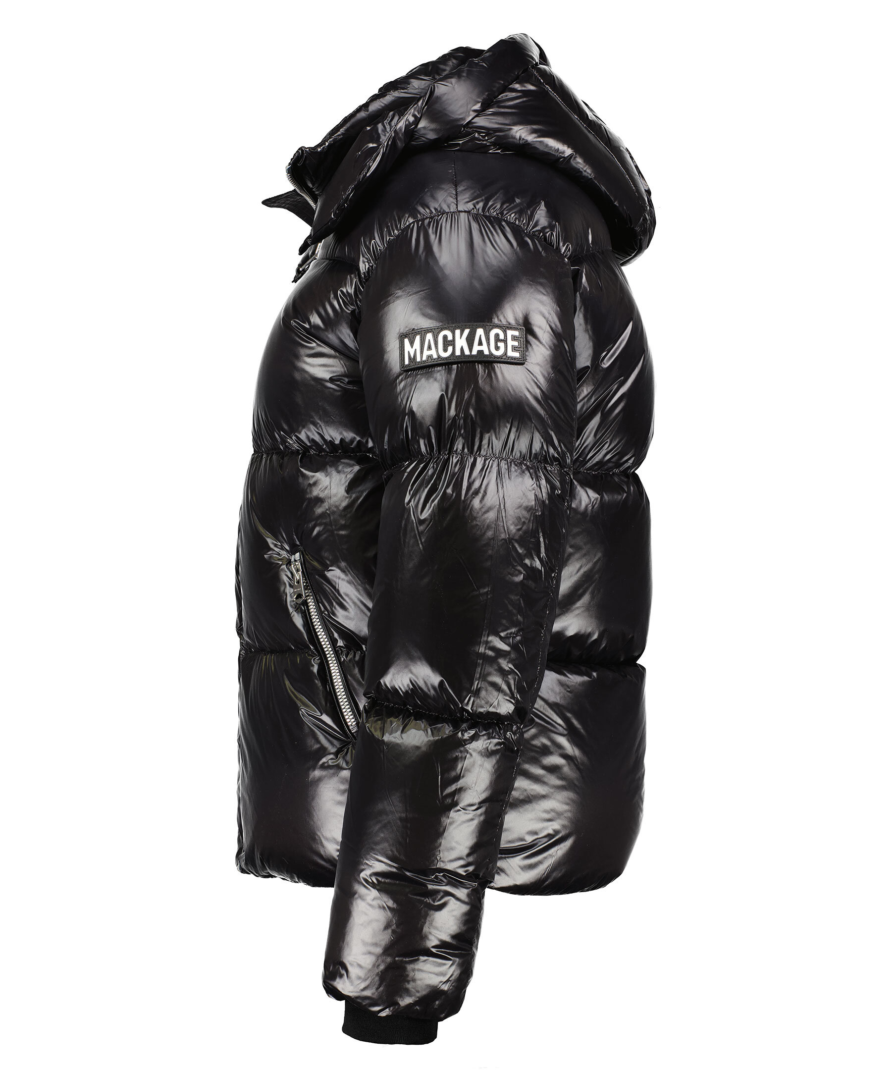 Svart quiltad dunjacka från Mackage i glansigt tyg. Stängs med dragkedja framtill. Avtagbar luva med dragsko i svart läder och tryckknappar. Två snedställda fickor fram som stängs med dragkedja. Avtagbar patch med logotyp på vänster ärm. Dragsko i jackslut. Modellen är 185cm lång och har på sig storlek 48.