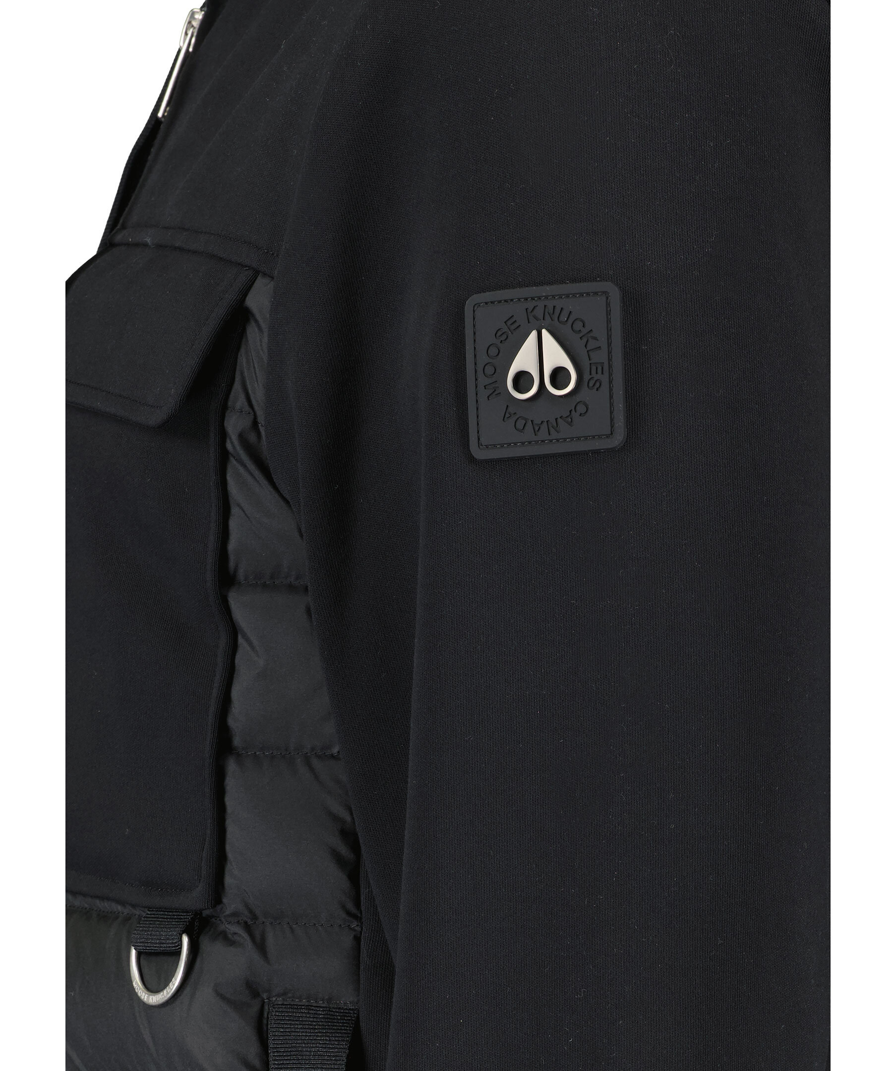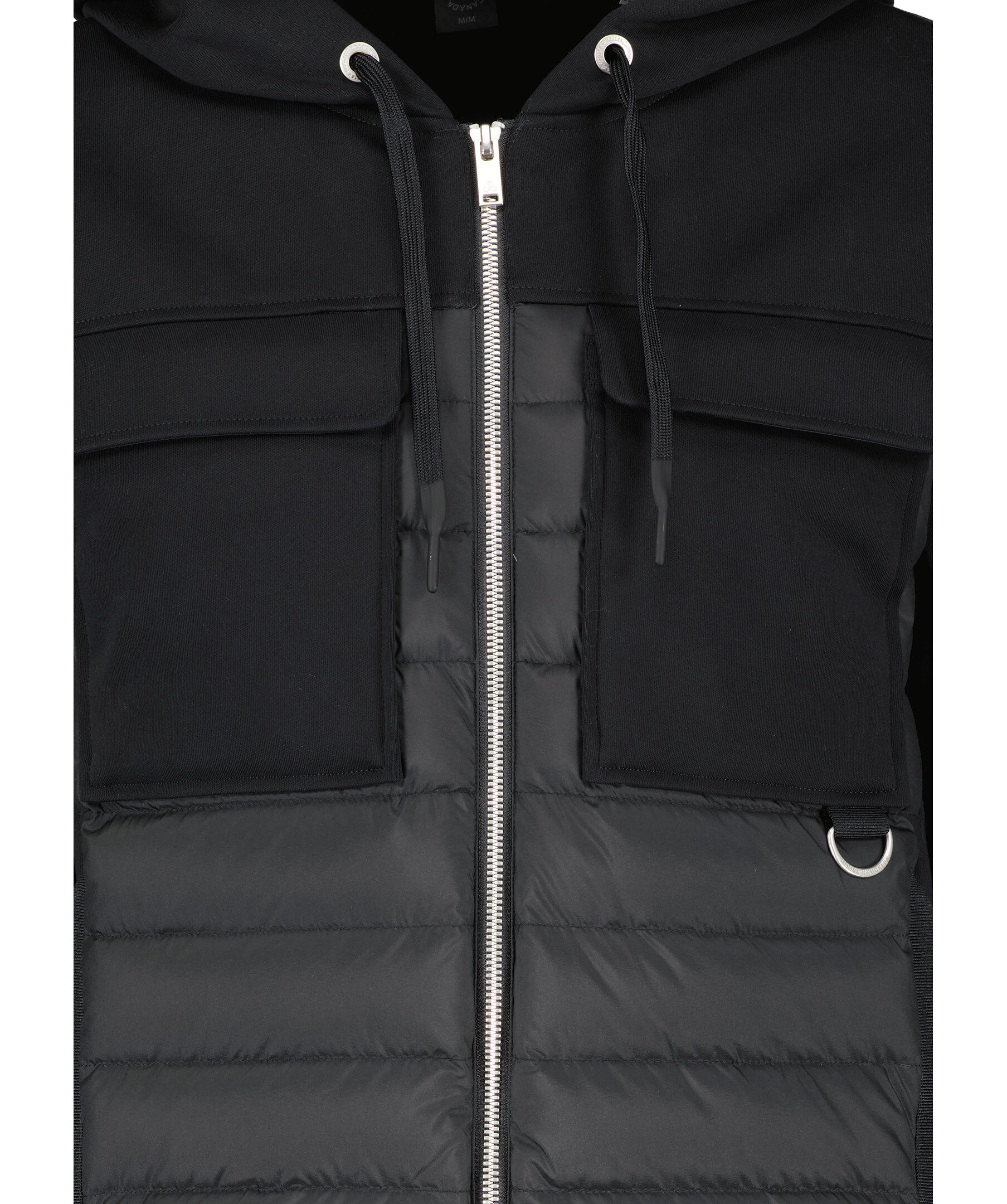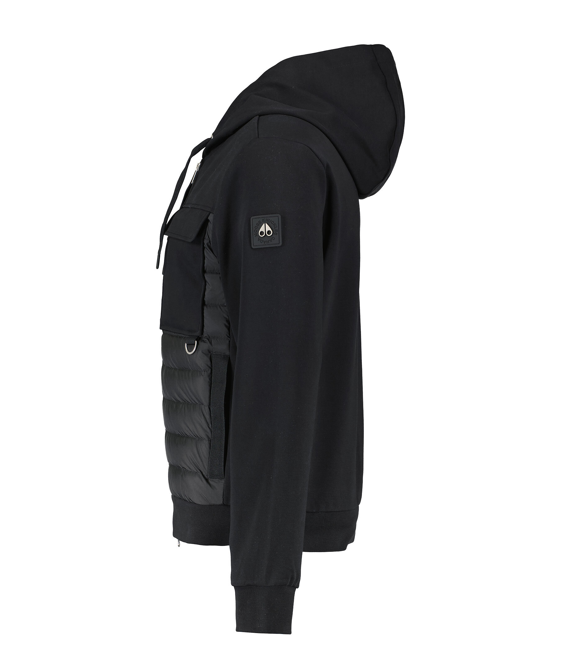 Svart hybridjacka med huva från Moose Knuckles. Stängs med tvåvägsdragkedja, en innerficka med dragkedja, två sidfickor med dragkedja, två patch bröstfickor med lock samt dragsko i huvan. Gummerad logotyp på vänster ärm. Tillverkad i nylon- och bomullsblandning.