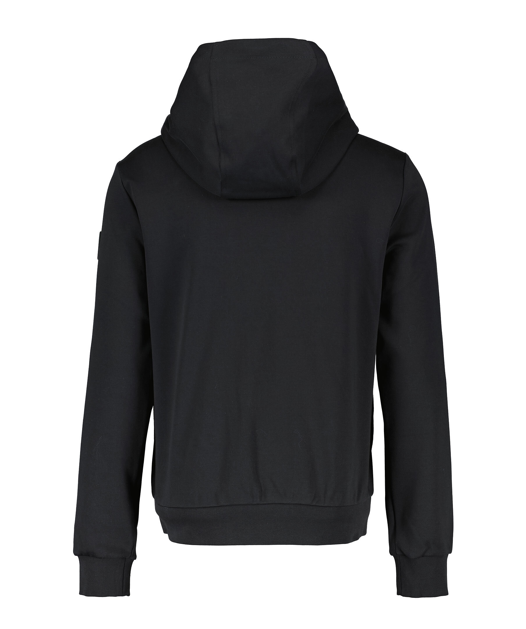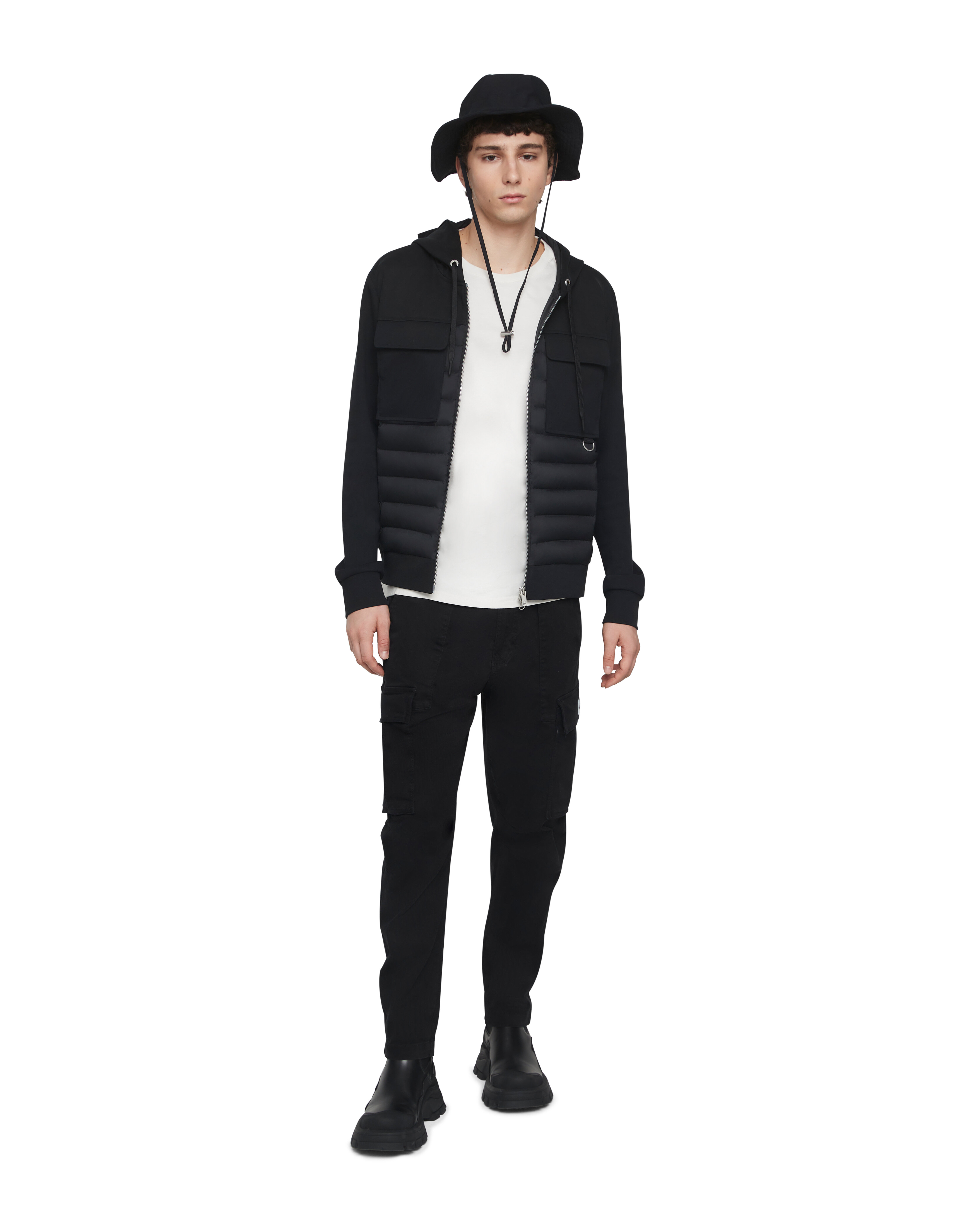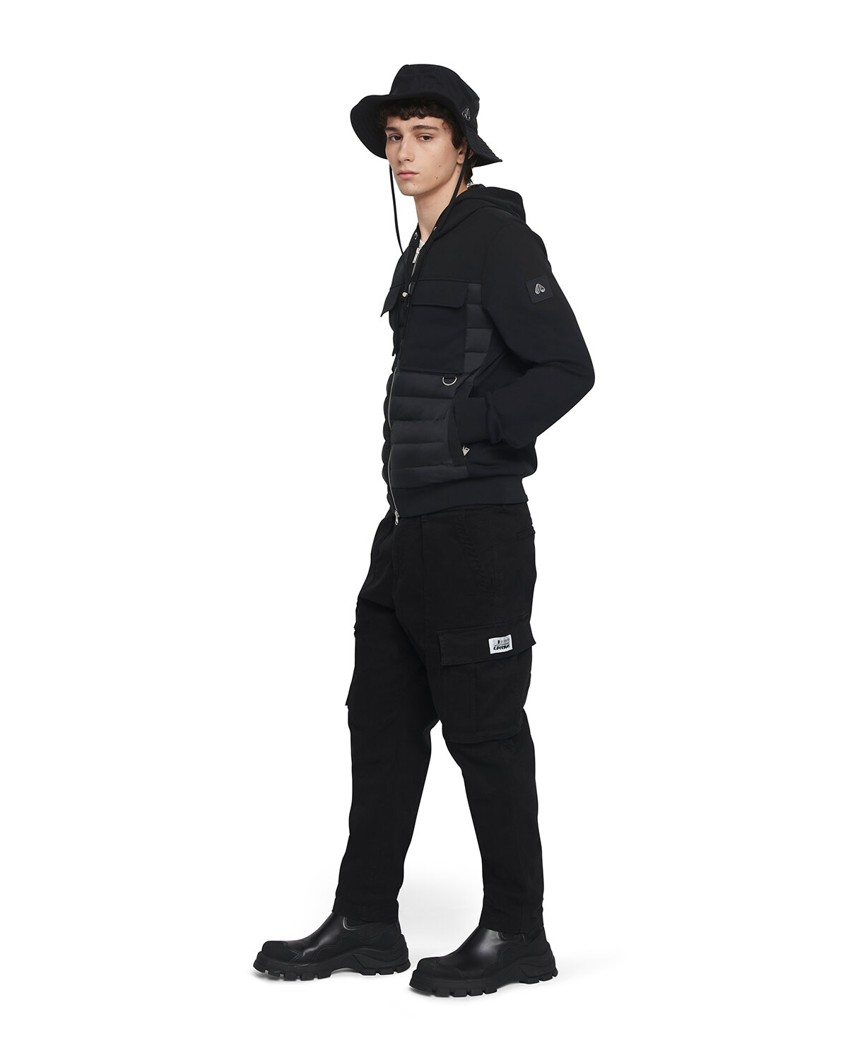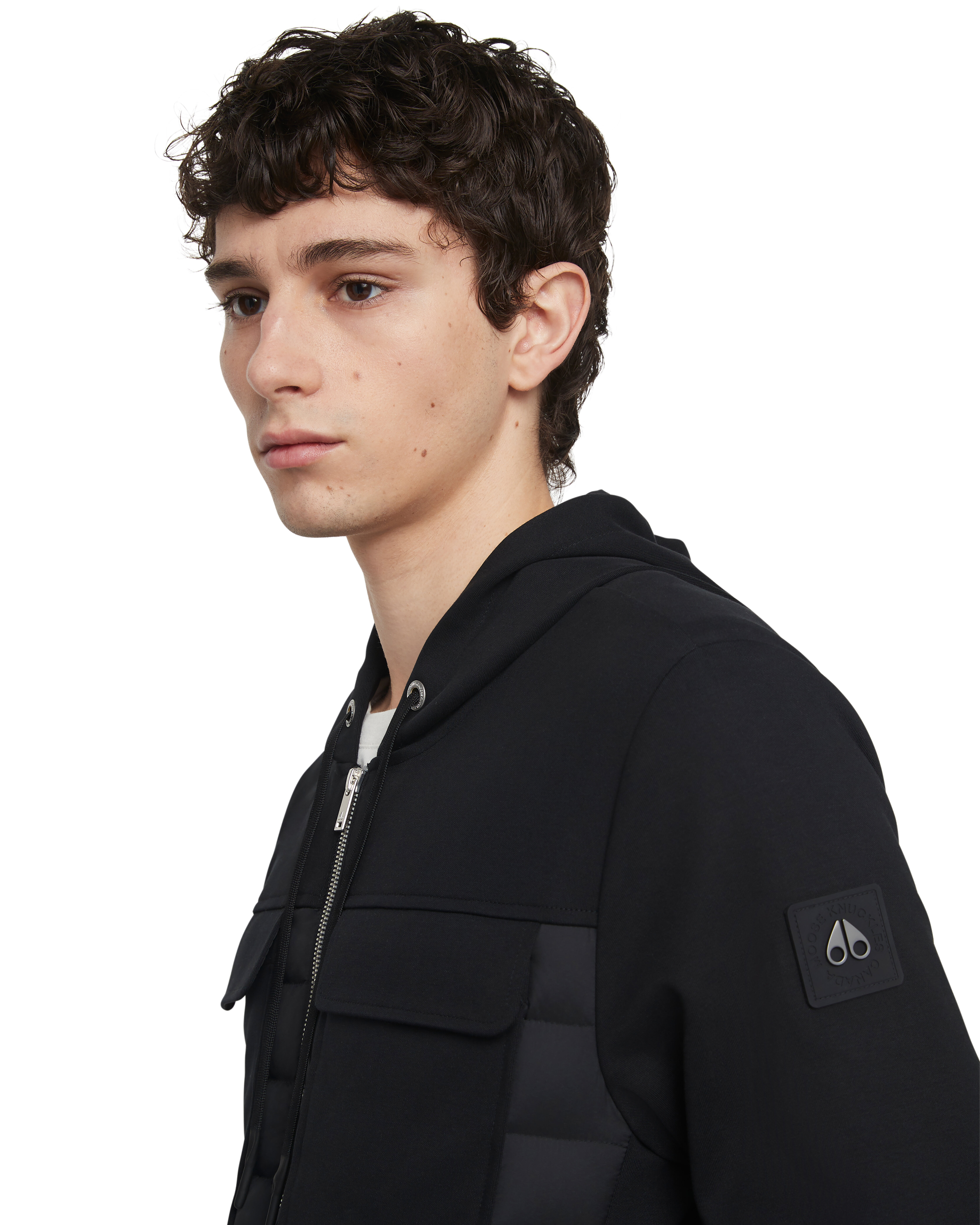 Svart hybridjacka med huva från Moose Knuckles. Stängs med tvåvägsdragkedja, en innerficka med dragkedja, två sidfickor med dragkedja, två patch bröstfickor med lock samt dragsko i huvan. Gummerad logotyp på vänster ärm. Tillverkad i nylon- och bomullsblandning.