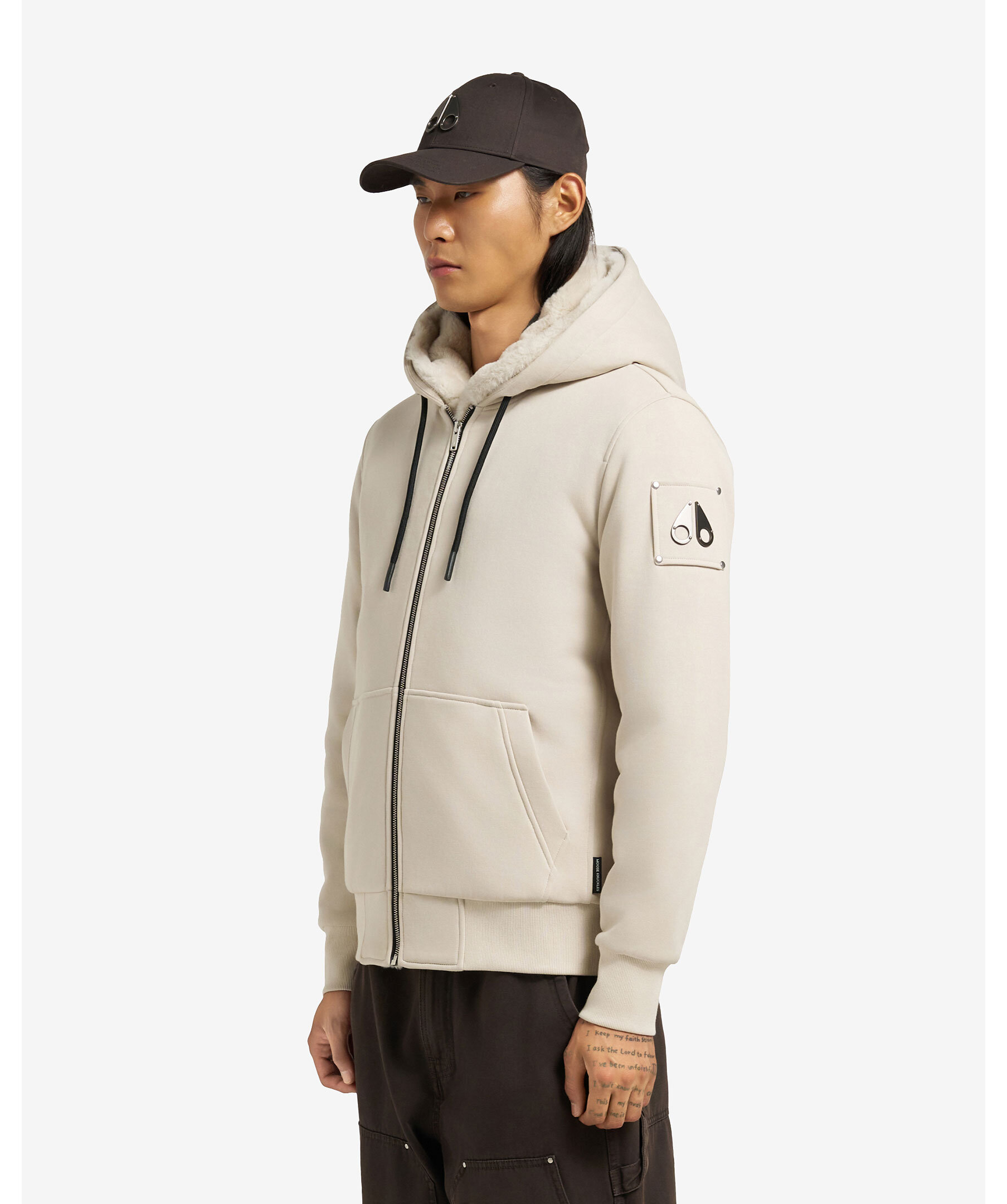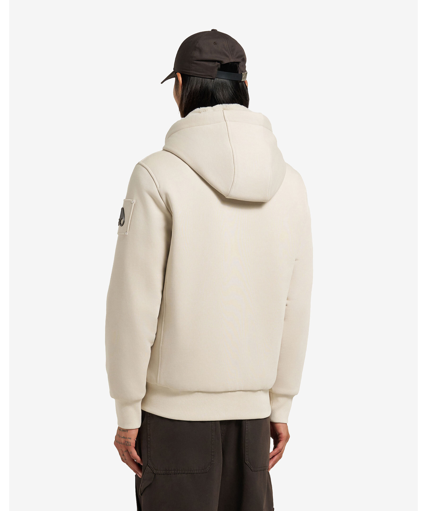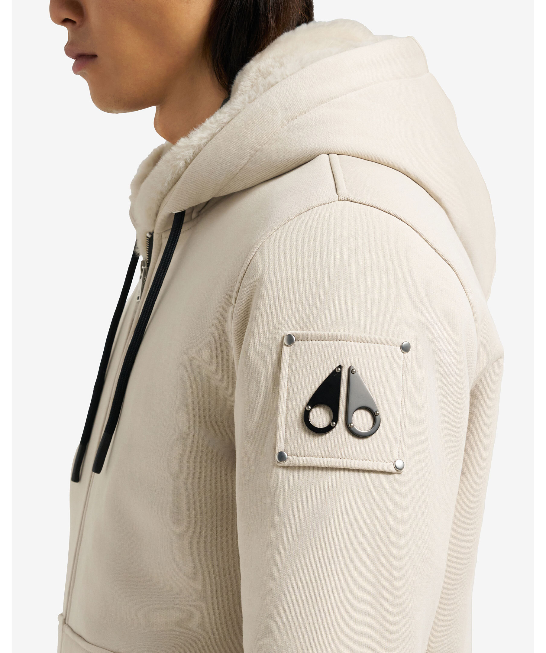 Vadderad hoodie från Moose Knuckles. Stängs framtill med dragkedja. Luva med dragsko och avtagbart foder. Ficka på magen. Ribbstickad mudd vid ärm- och plaggslut. Patch med logotyp i metall på vänster ärm. Fodrad luva i konstpäls.