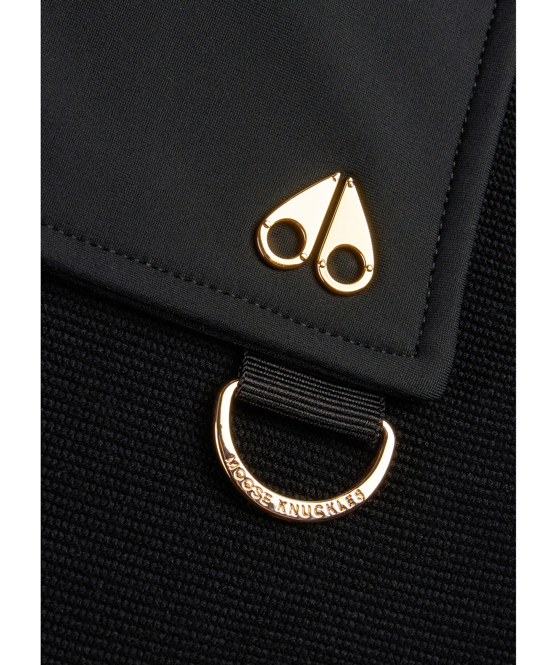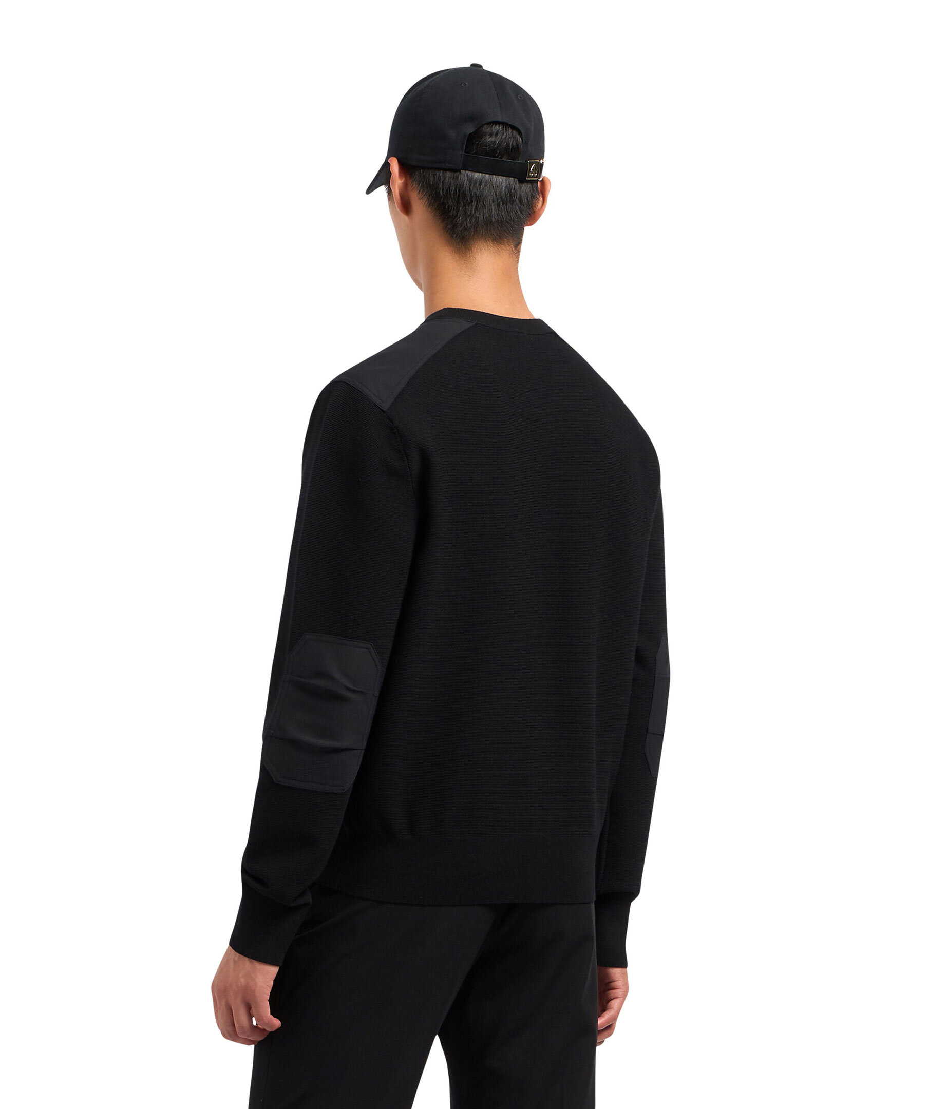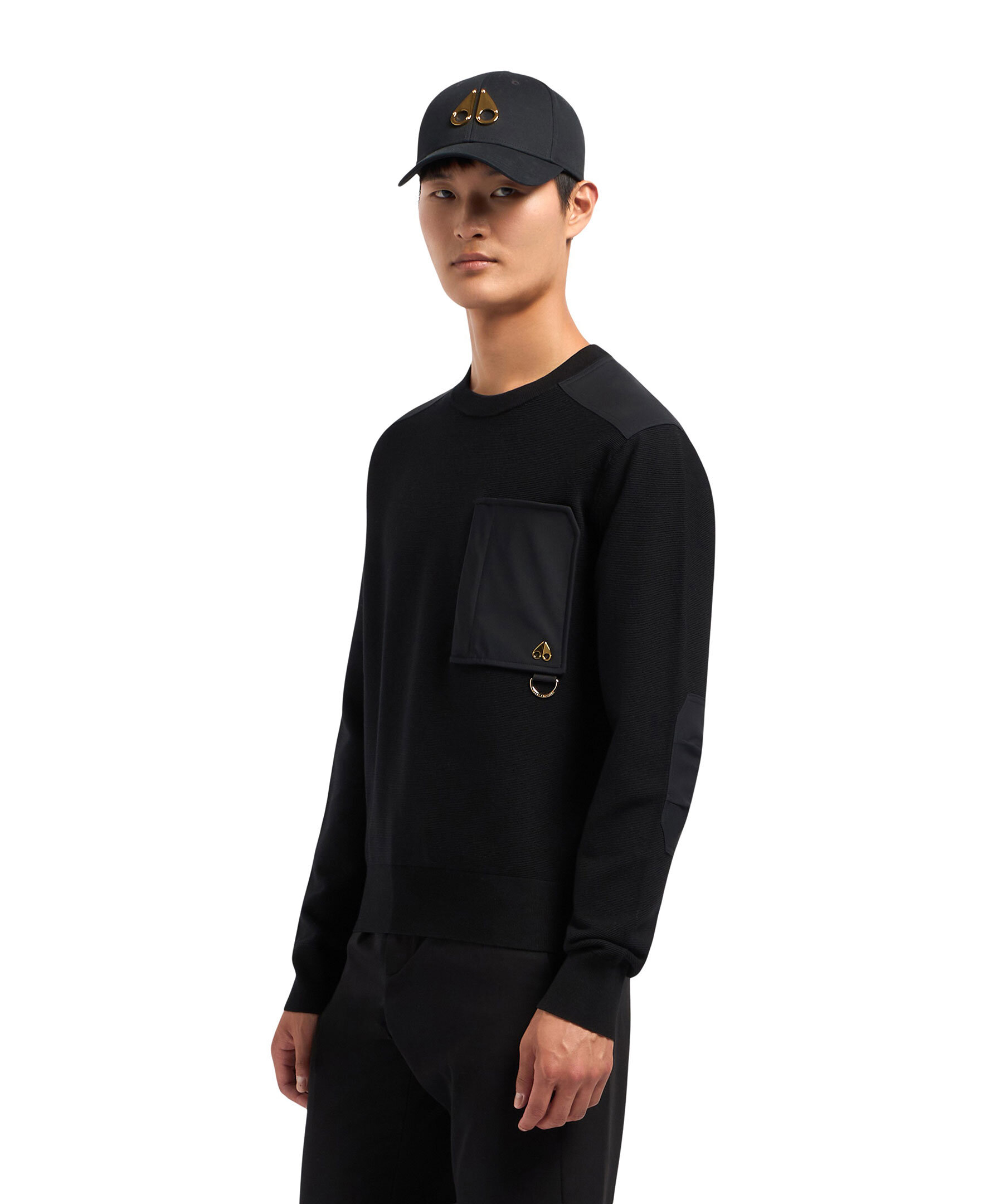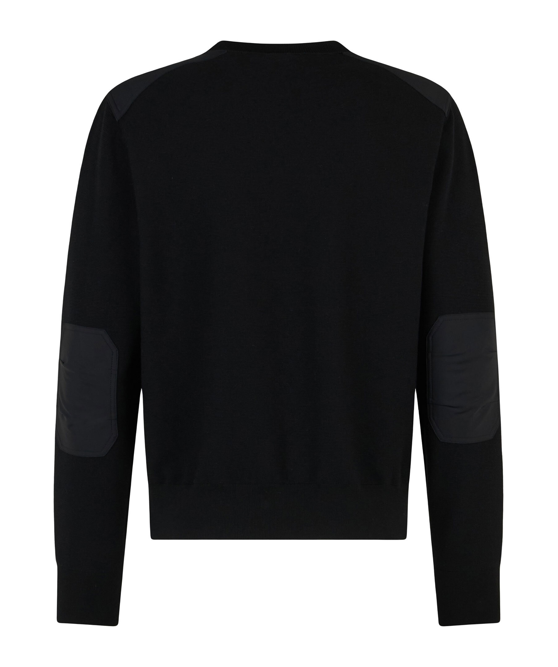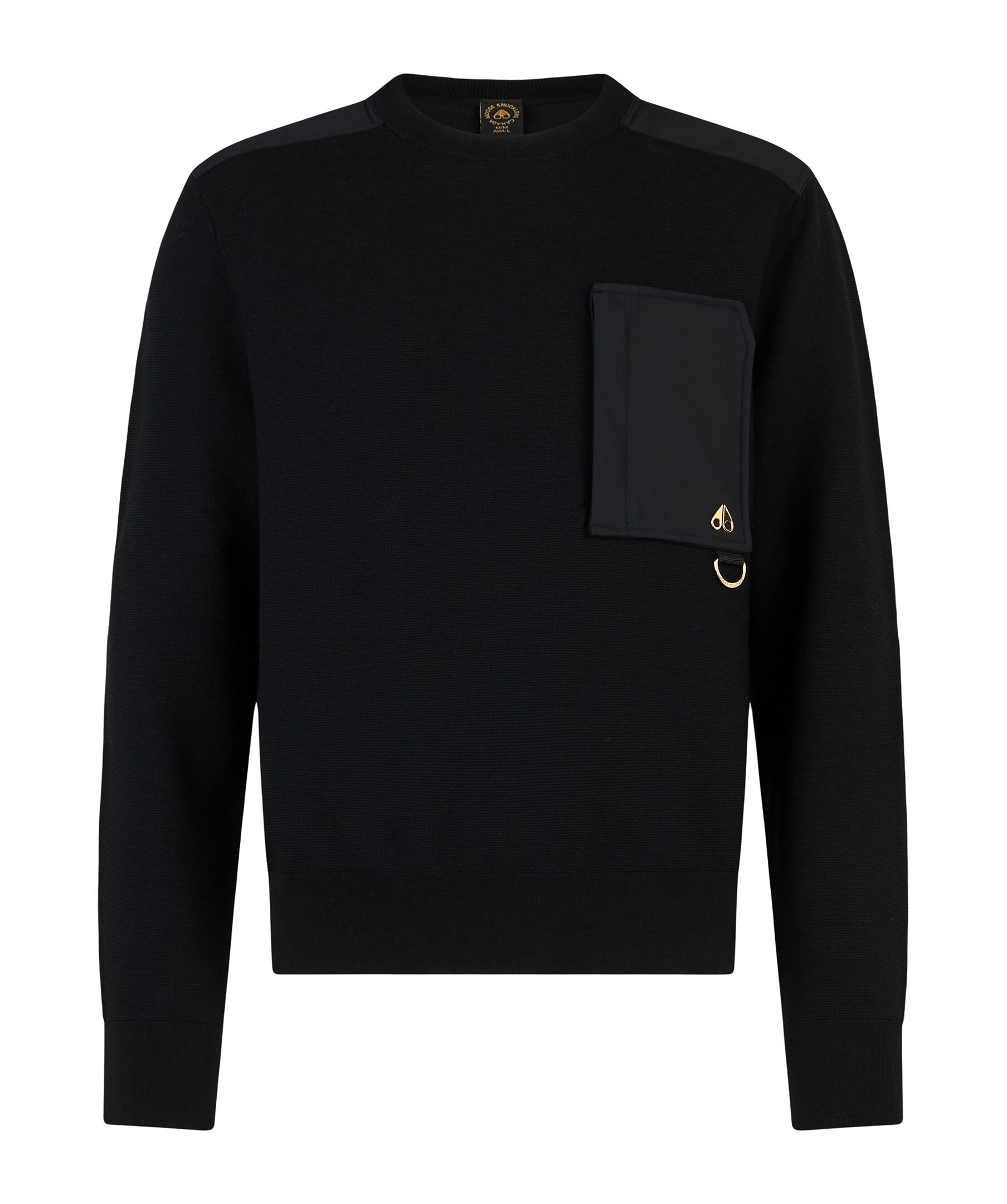 Svart sweatshirt från Moose Knuckles. Tröjan har rund och ribbstickad halsringning, ribbstickade muddar samt patch med dragkedjeficka och logotyp i metall på bröstet. Patch-delar på armbågarna och axlarna. Tillverkad i en viskos- och polyesterblandning.