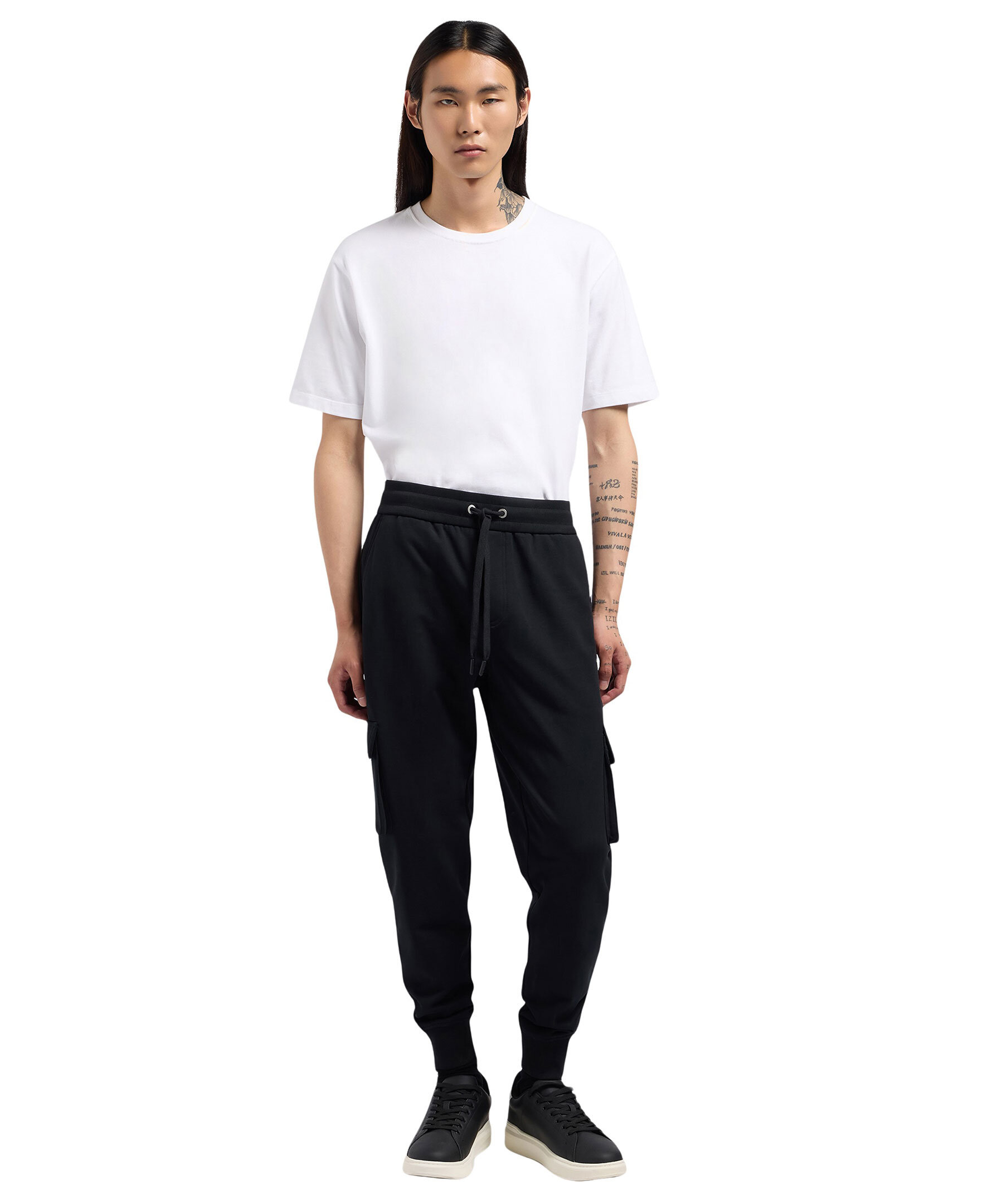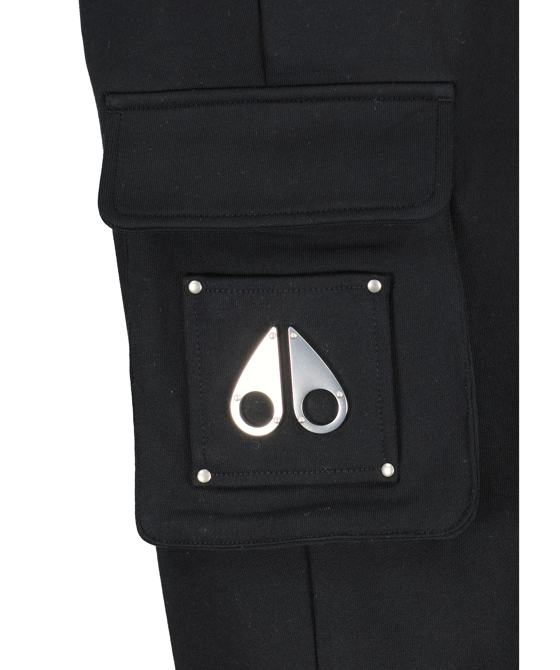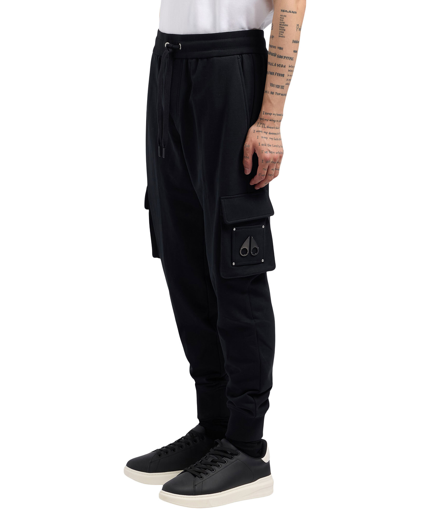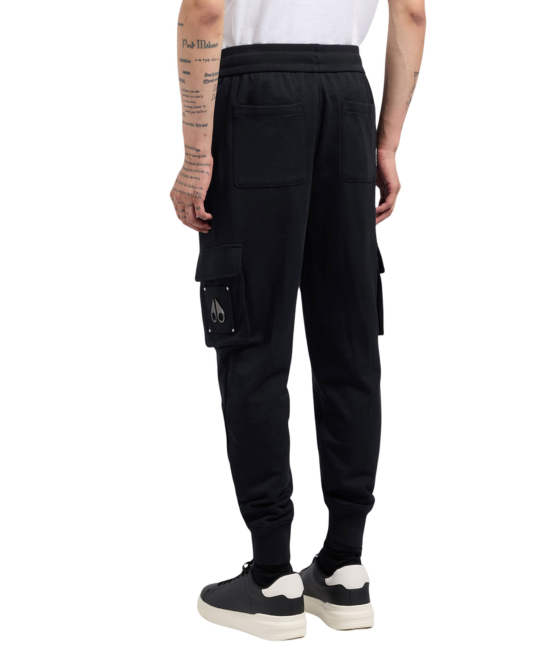 Svarta mjukisbyxor från Moose Knuckles. Byxorna har ribbat, elastiskt midjeband med dragsko, två sidfickor, två bakfickor samt två fickor med lock placerade på låren med Moose Knuckles-logotypen i metall på vänster lårficka i silver. ribbade muddar vid benslut. Tillverkade i bomull.